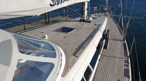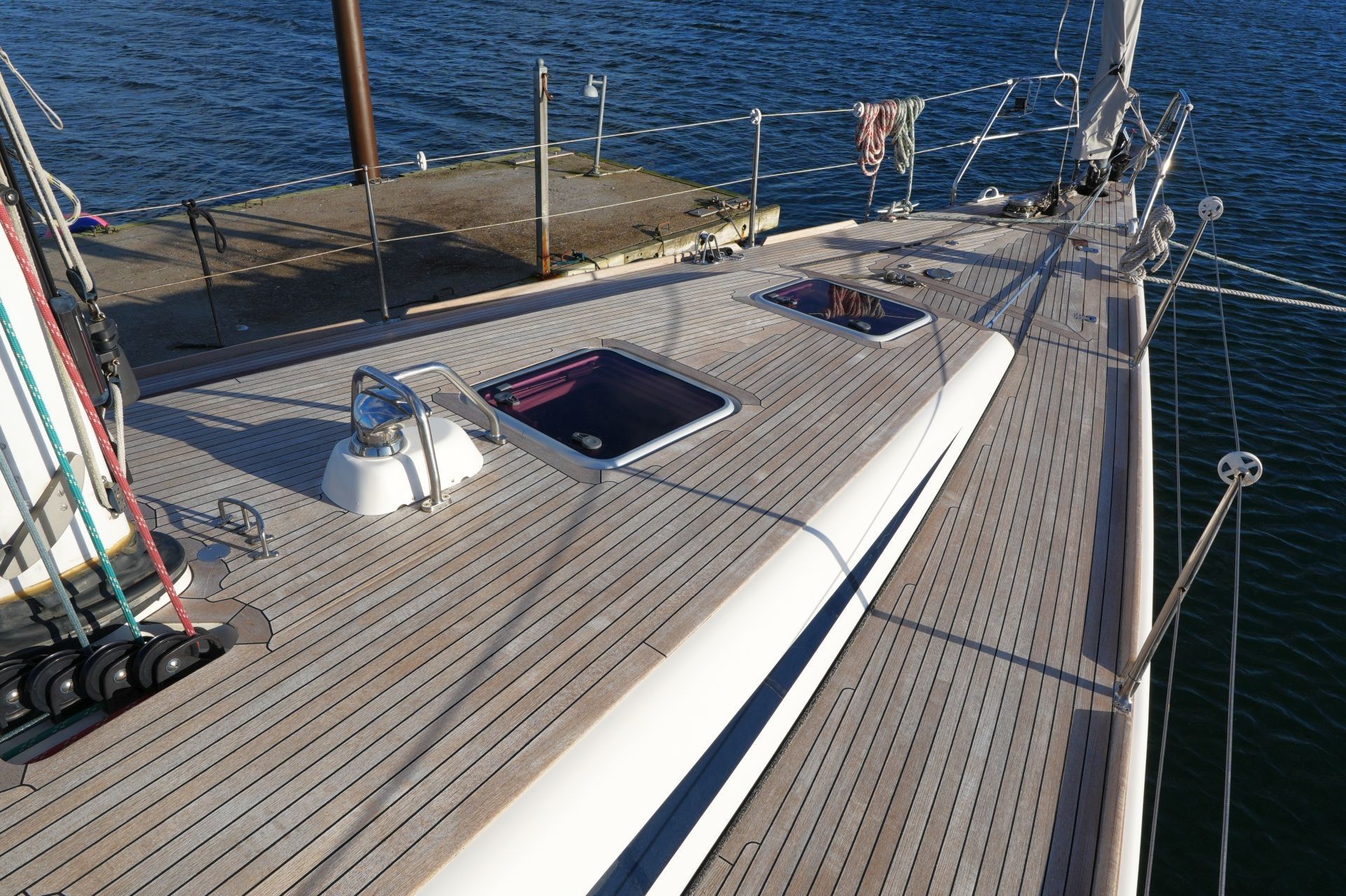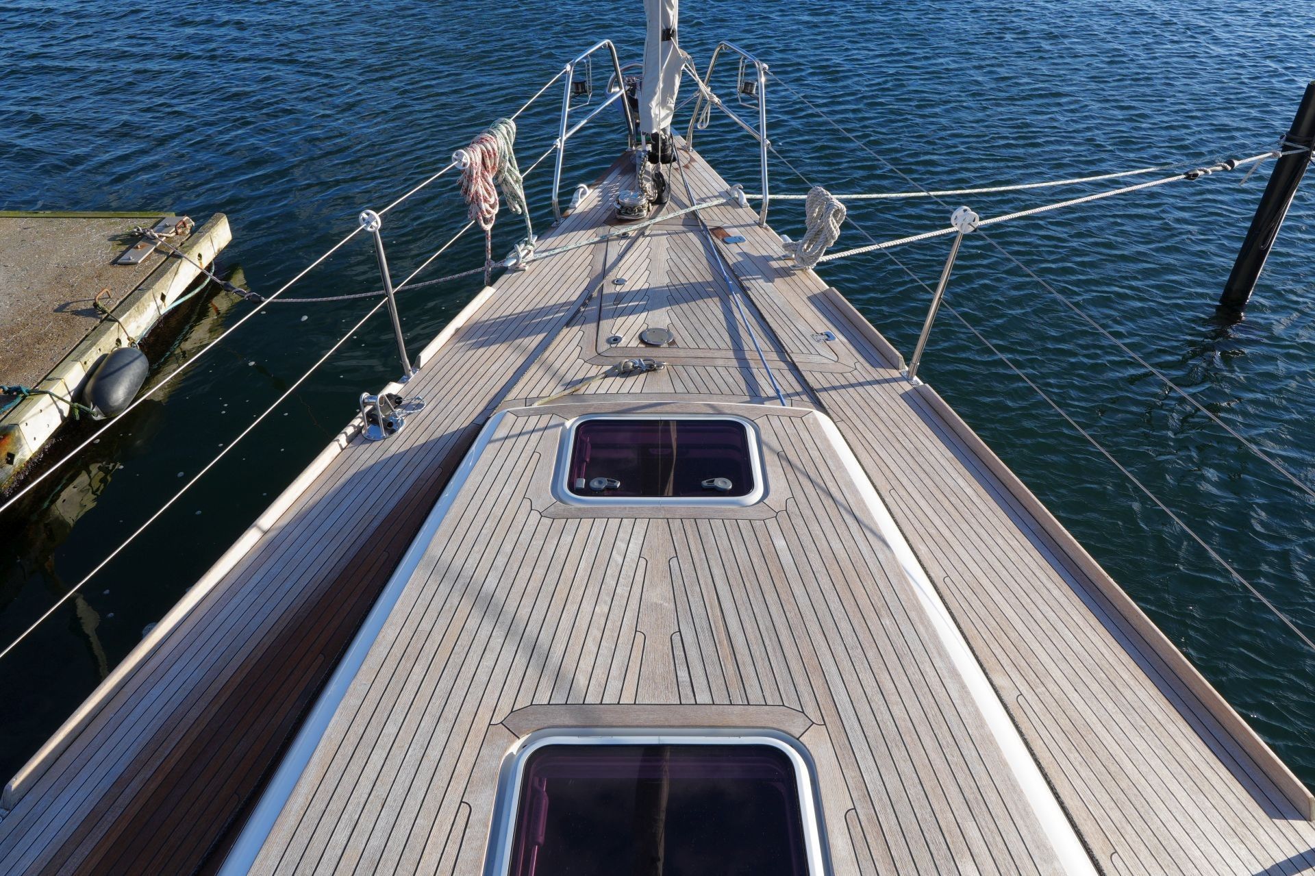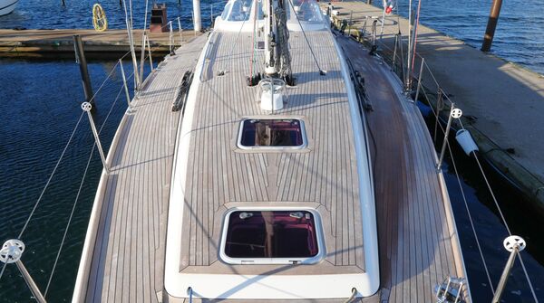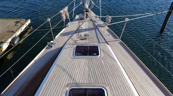 - Teakdeck auf Seitendecks, Vorschiff, Aufbaudach, Badeplattform und im Cockpit