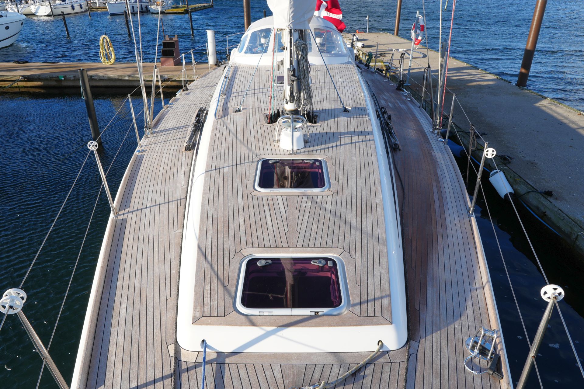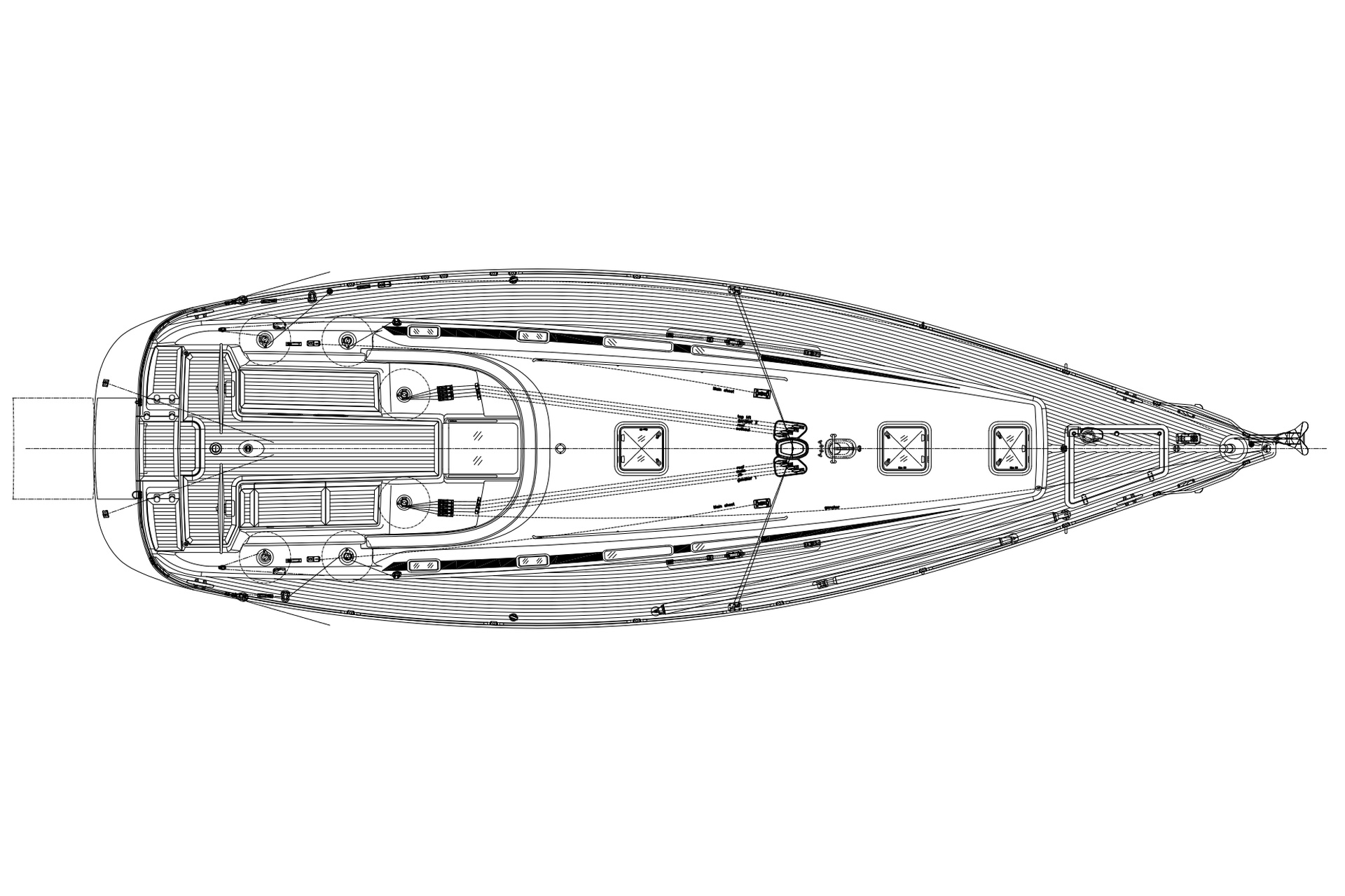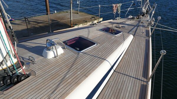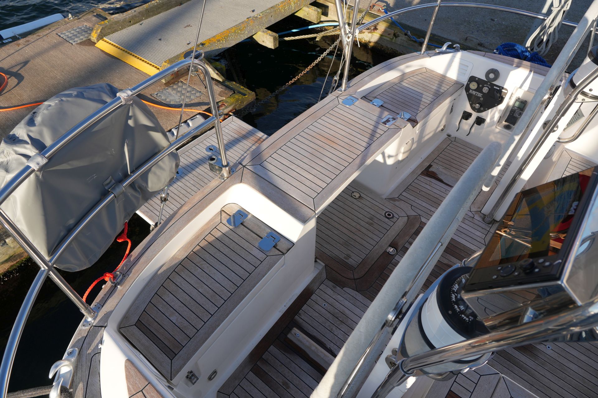 - Teakdeck auf Seitendecks, Vorschiff, Aufbaudach, Badeplattform und im Cockpit