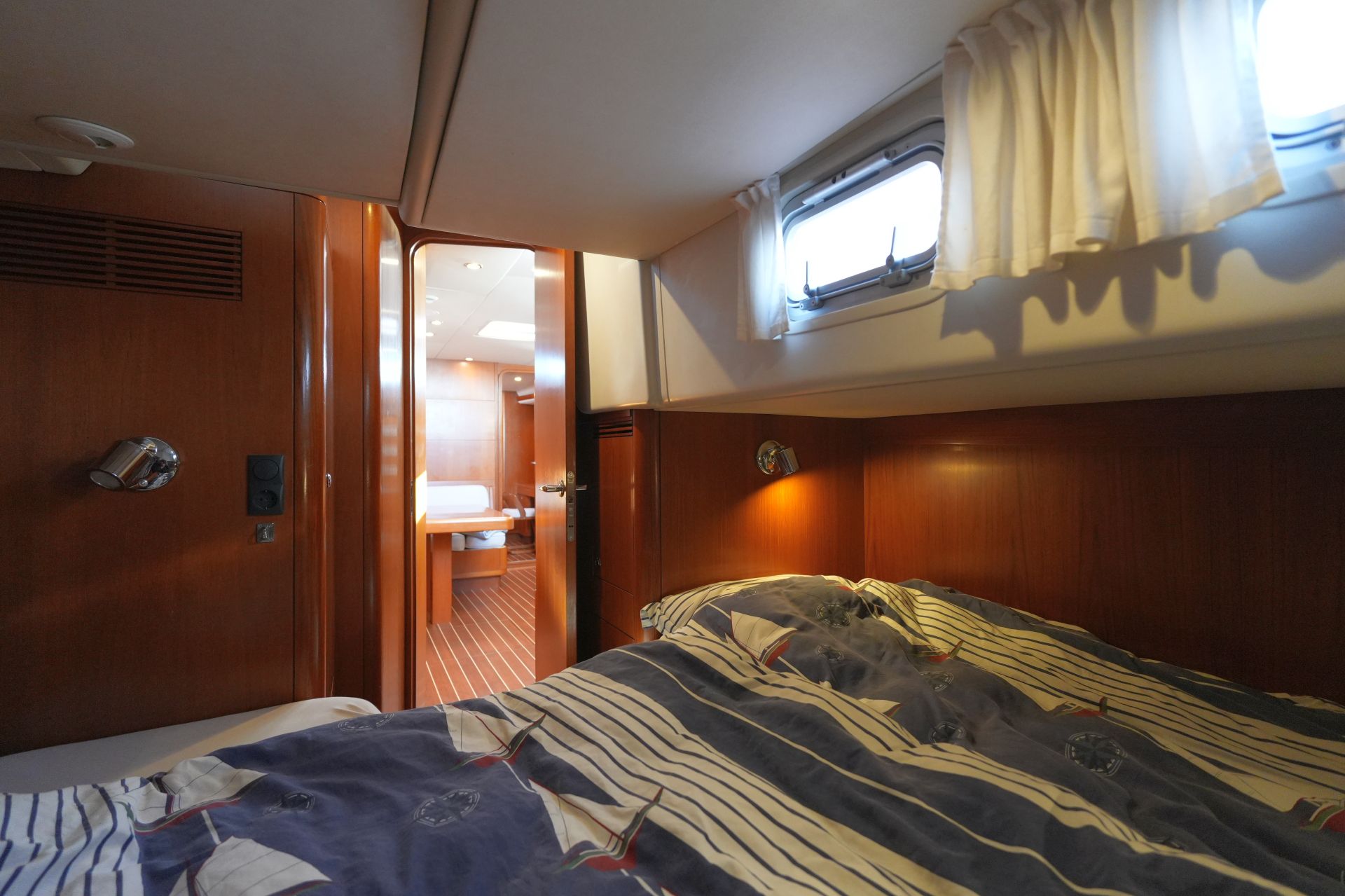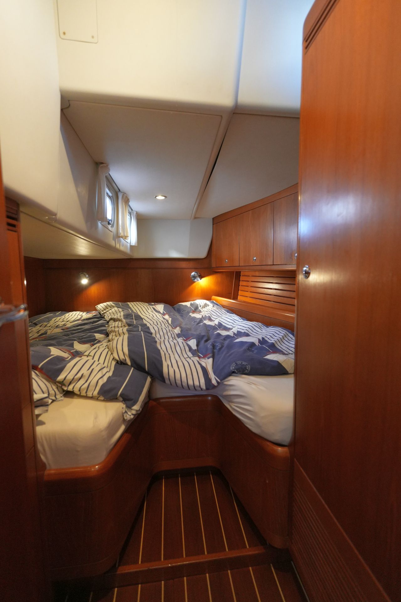 - Luxuriöse Eignerkabine im Vorschiff mit breiter Doppelkoje an Backbord, Schreibtisch mit Stuhl an Steuerbord und ausgesprochen viel Stauraum in Schränken und Schubladen
