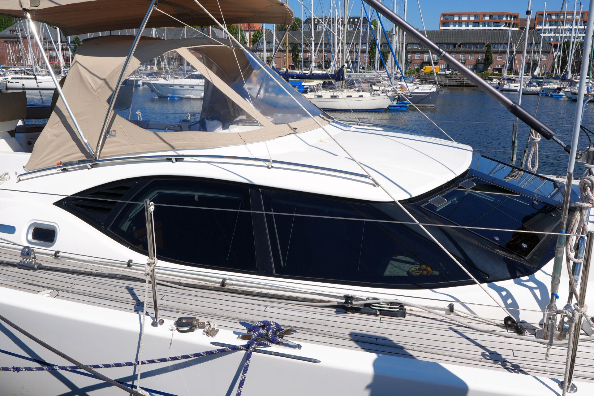 - Heller geräumiger Decksalon mit großen Front- und Seitenscheiben (zwei Frontscheiben zum Öffnen) und zwei Rumpffenstern