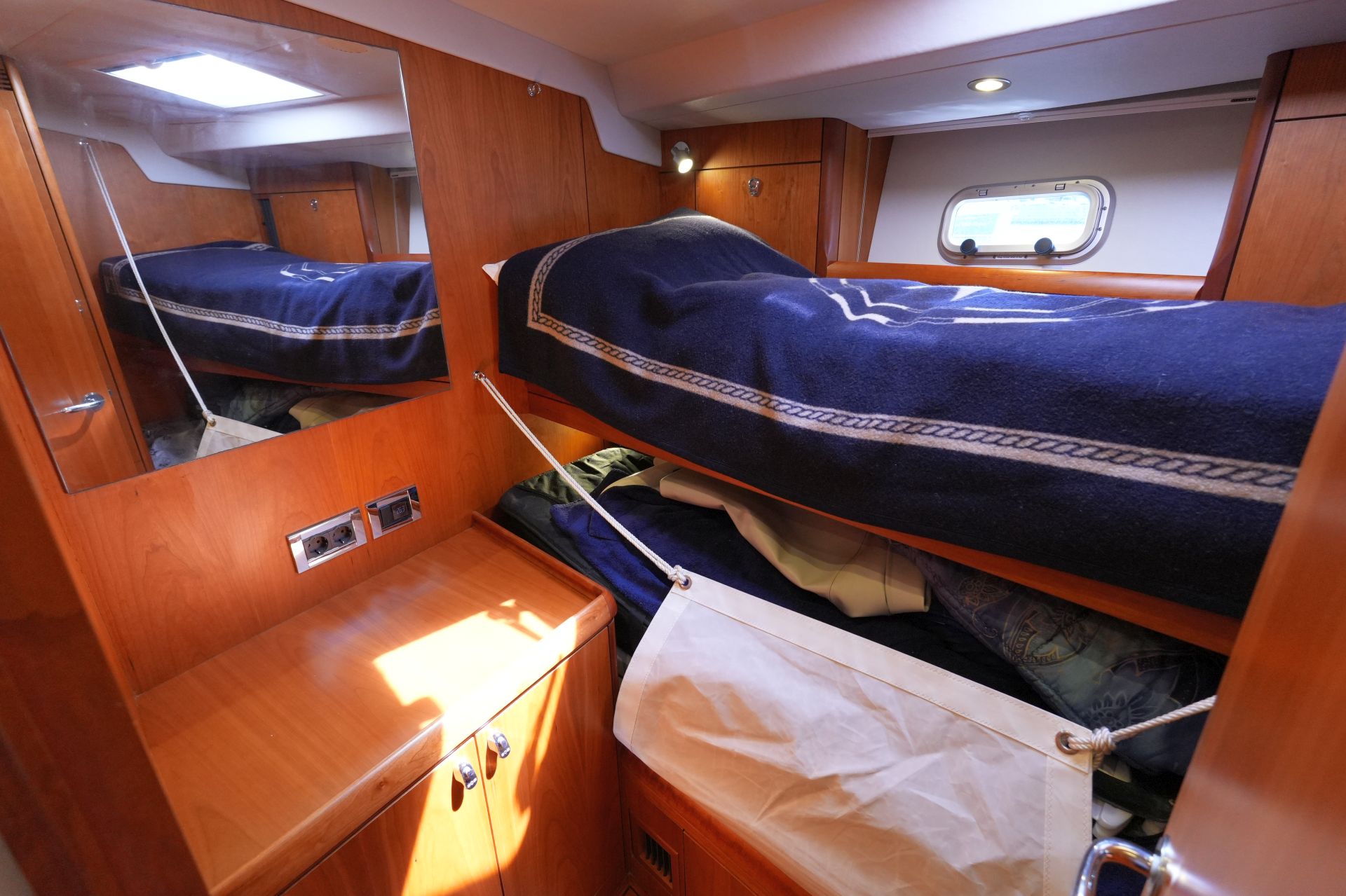 - Lateralkabine an Backbord mit zwei Doppelstockbetten, Schrank, Staufächern, Decksluke und Rumpffenster