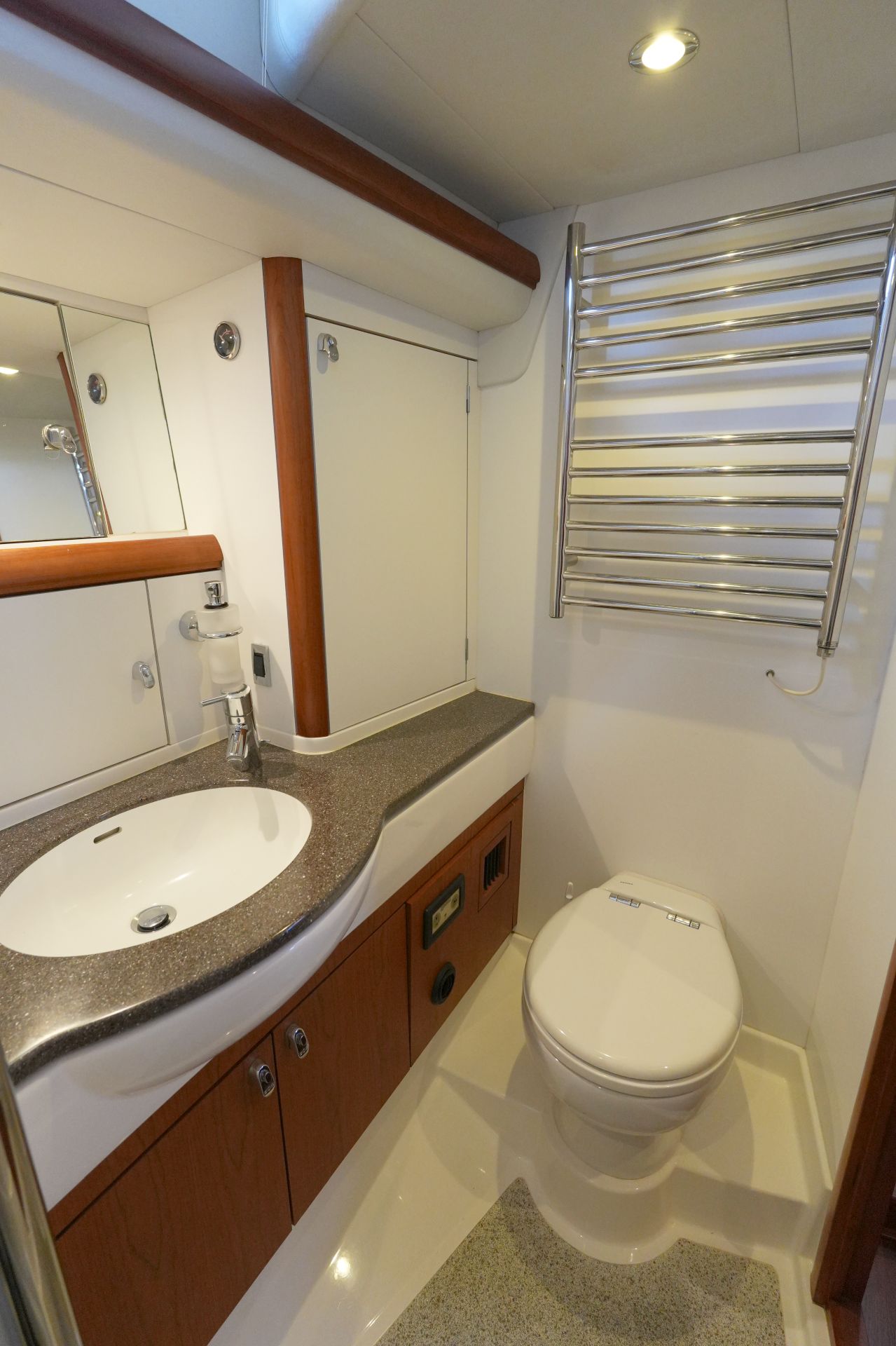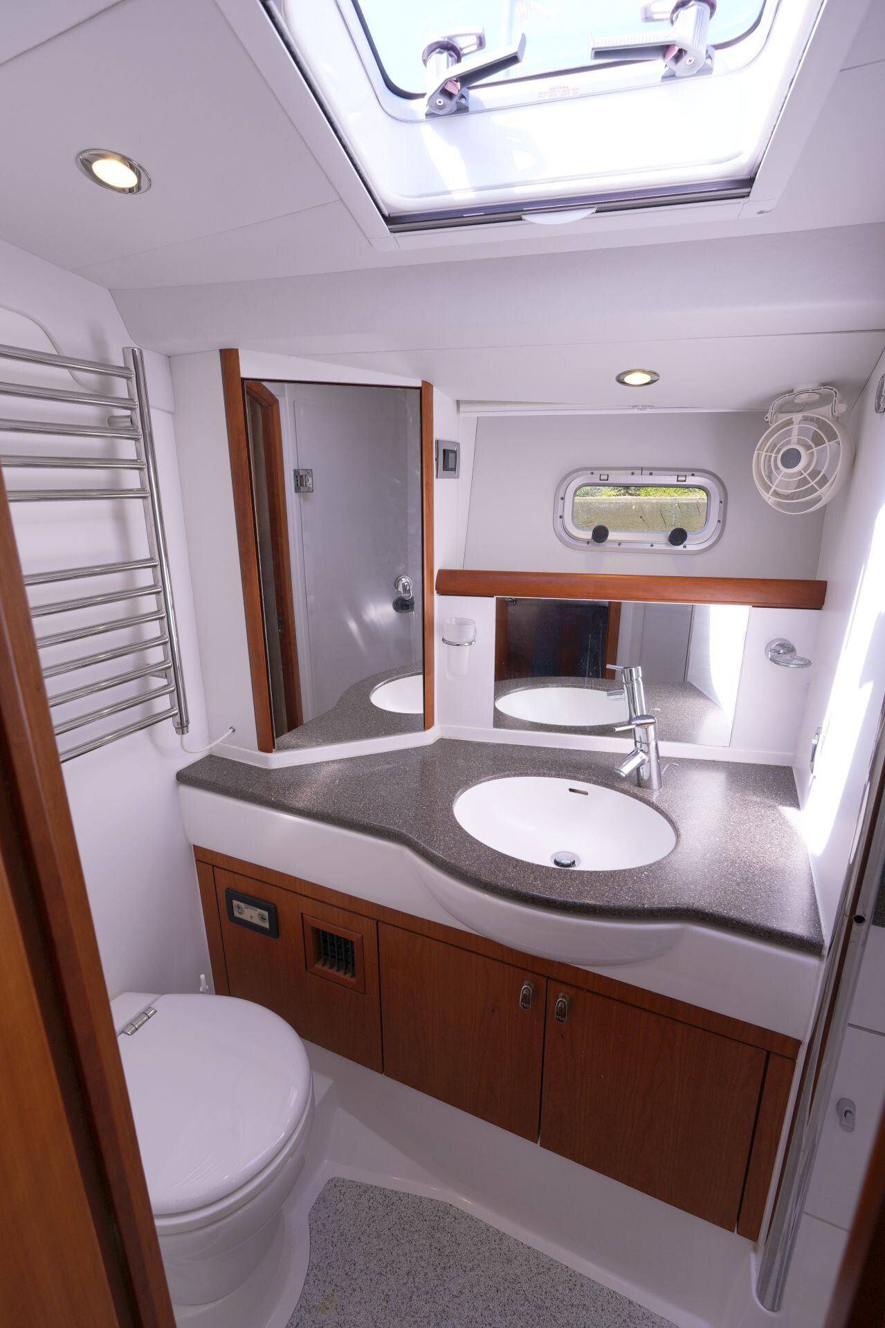 - En suite-Eignerbad an Steuerbord mit Waschtisch, elektrischer Toilette, separater Duschkabine und elektrischem Handtuch-Trockner