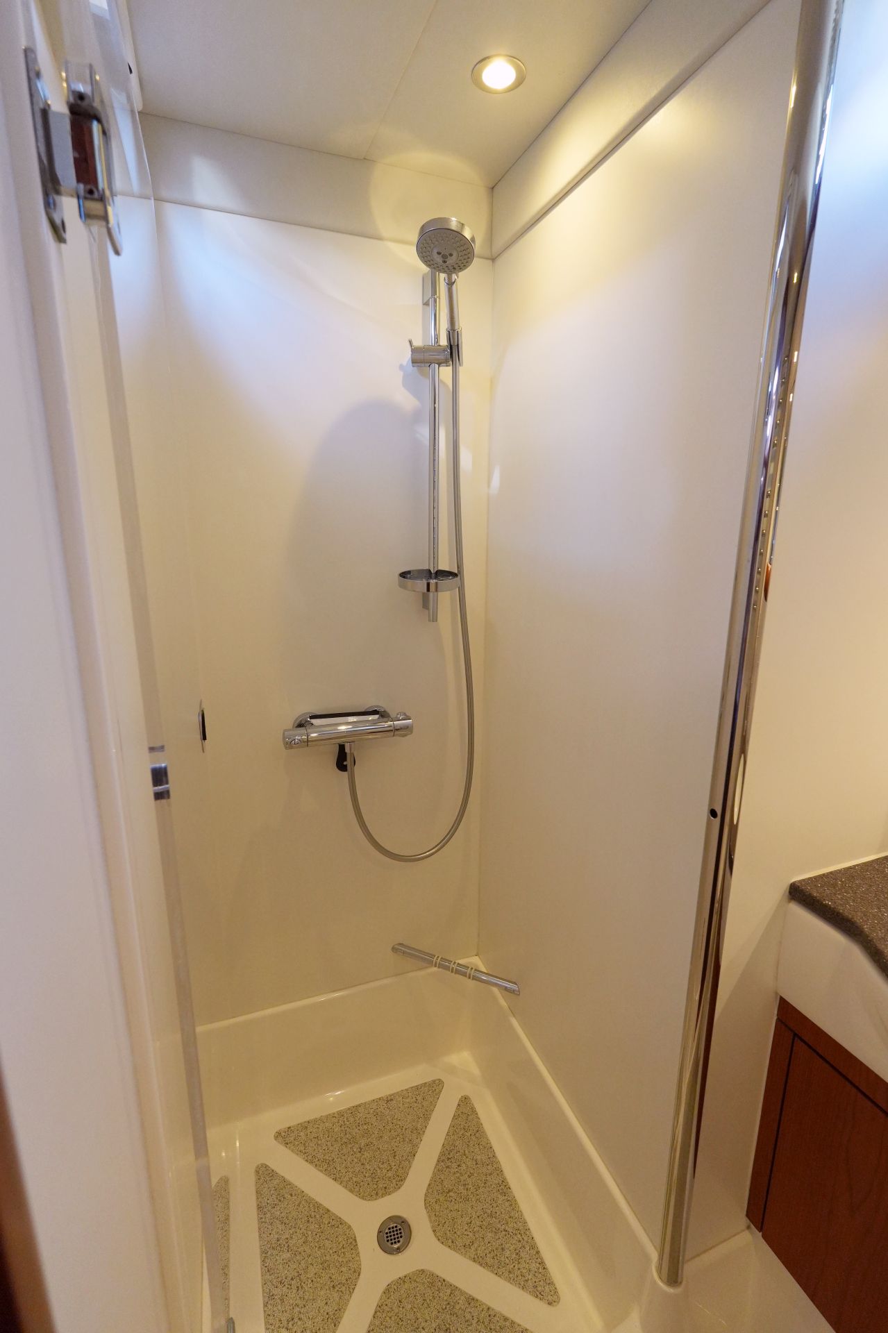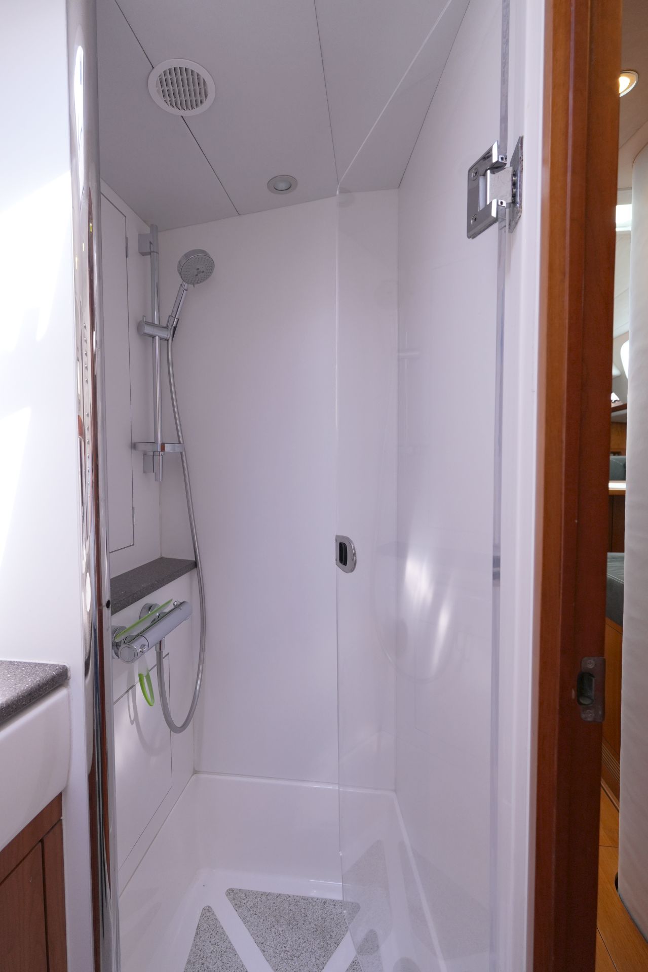 - Gästebad an Backbord vorn mit Waschtisch, elektrischer Toilette, separater Duschkabine und elektrischem Handtuch-Trockner