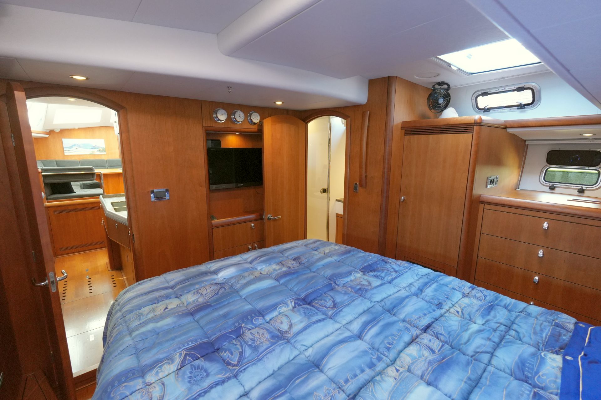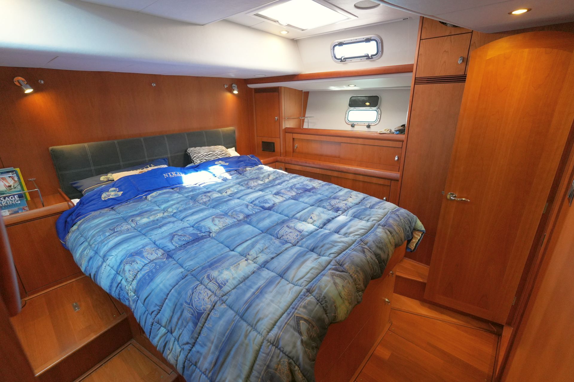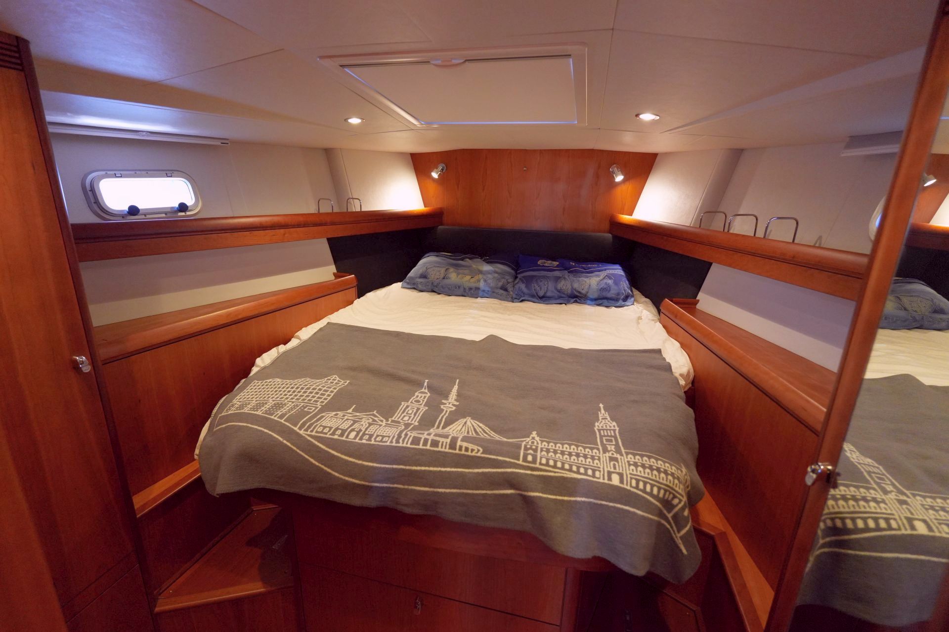 - Reichlich Stauraum in Schränken, Schubladen und Staufächern - Luxuriöse Eignerkabine über die gesamte Schiffsbreite im Heck mit breiter, freistehender Doppelkoje, zwei Decksluken, zwei Aufbaufenstern und zwei Rumpffenstern, reichlich Stauraum in Schränken, Fächern, Schubladen und Ablagen