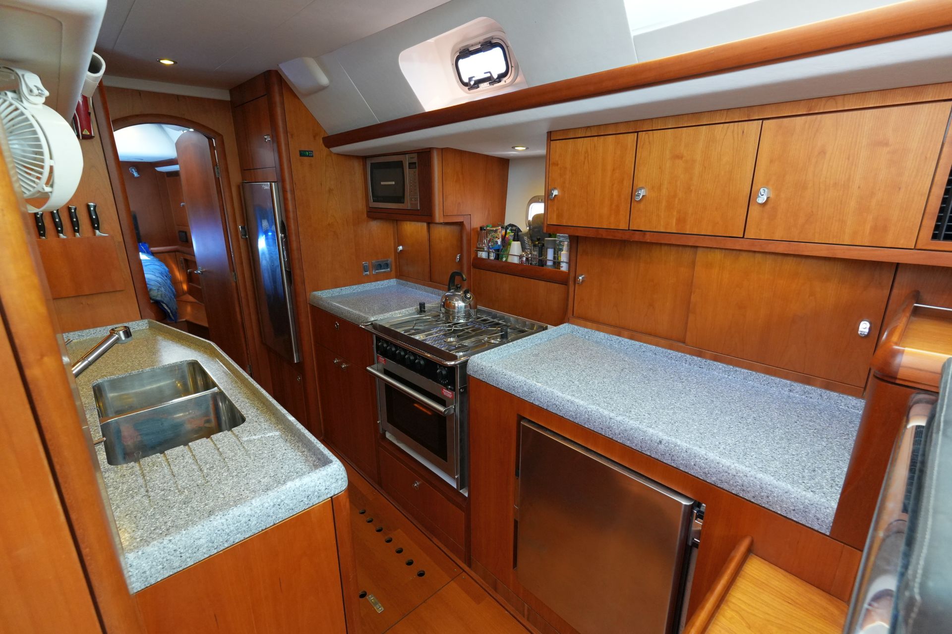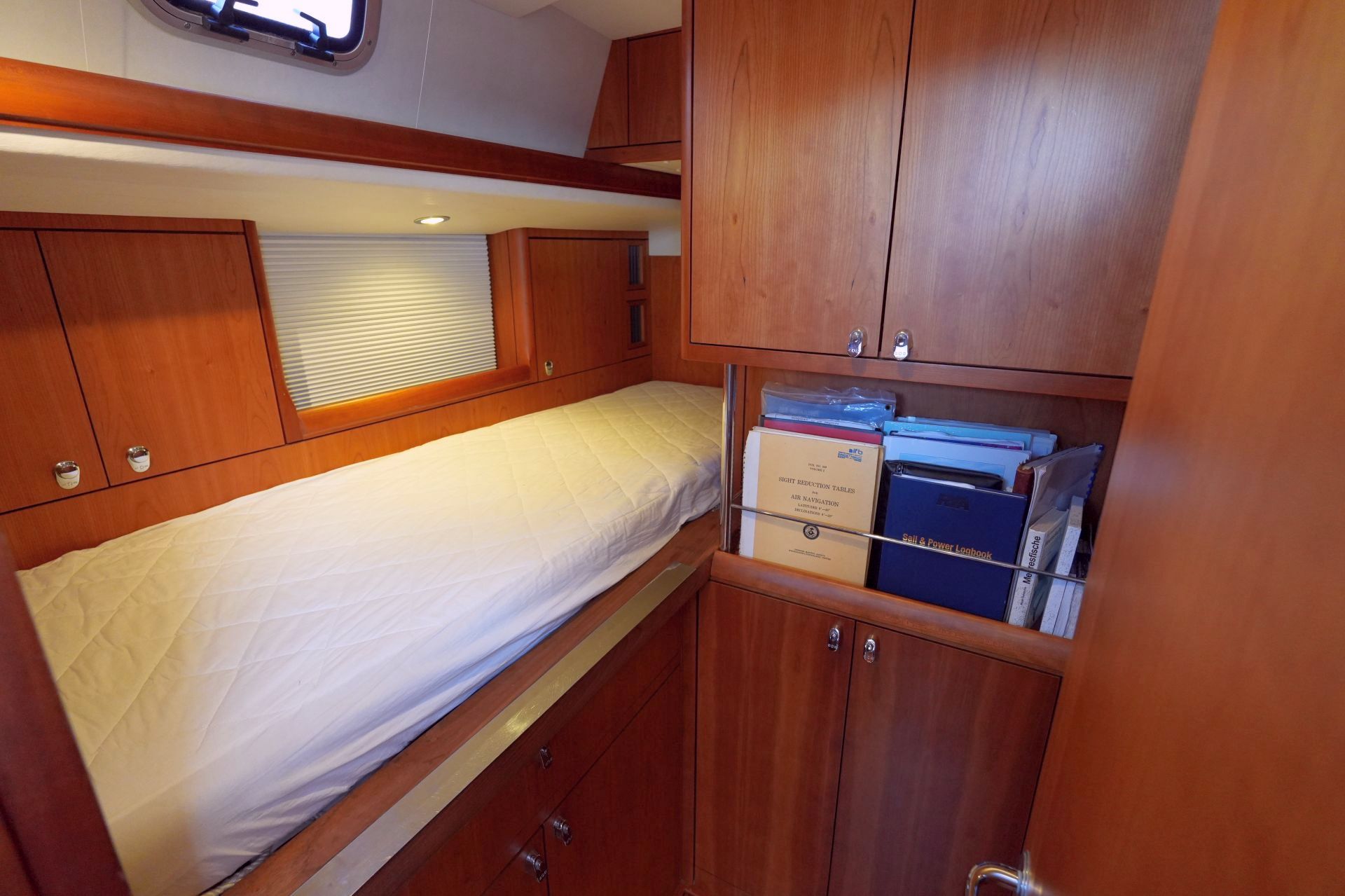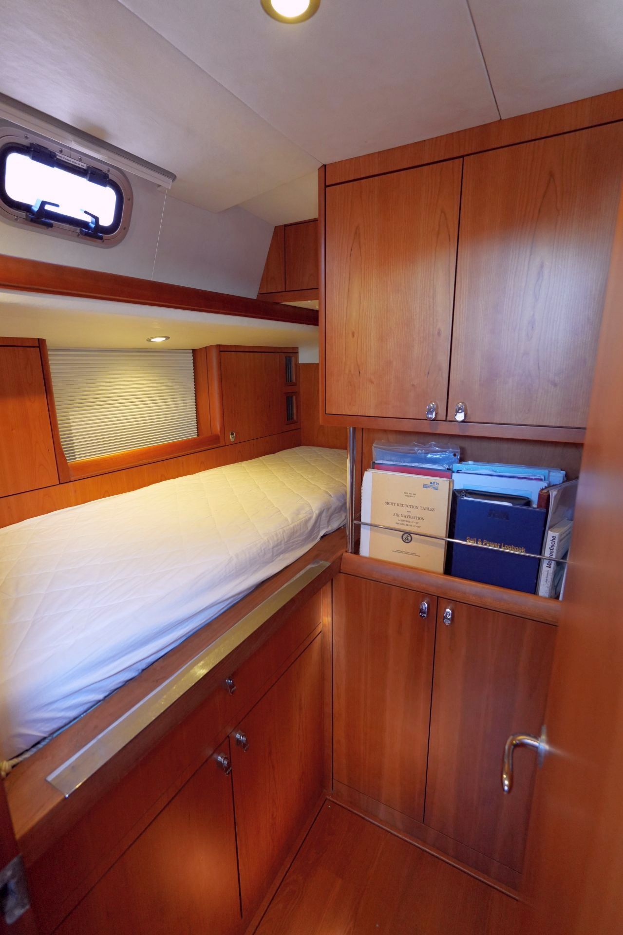 - Skipperkabine an Steuerbord mit Arbeitsfläche/Koje, Schränken, Staufächern, Aufbaufenster, Rumpffenster und Zugang zum Motorraum