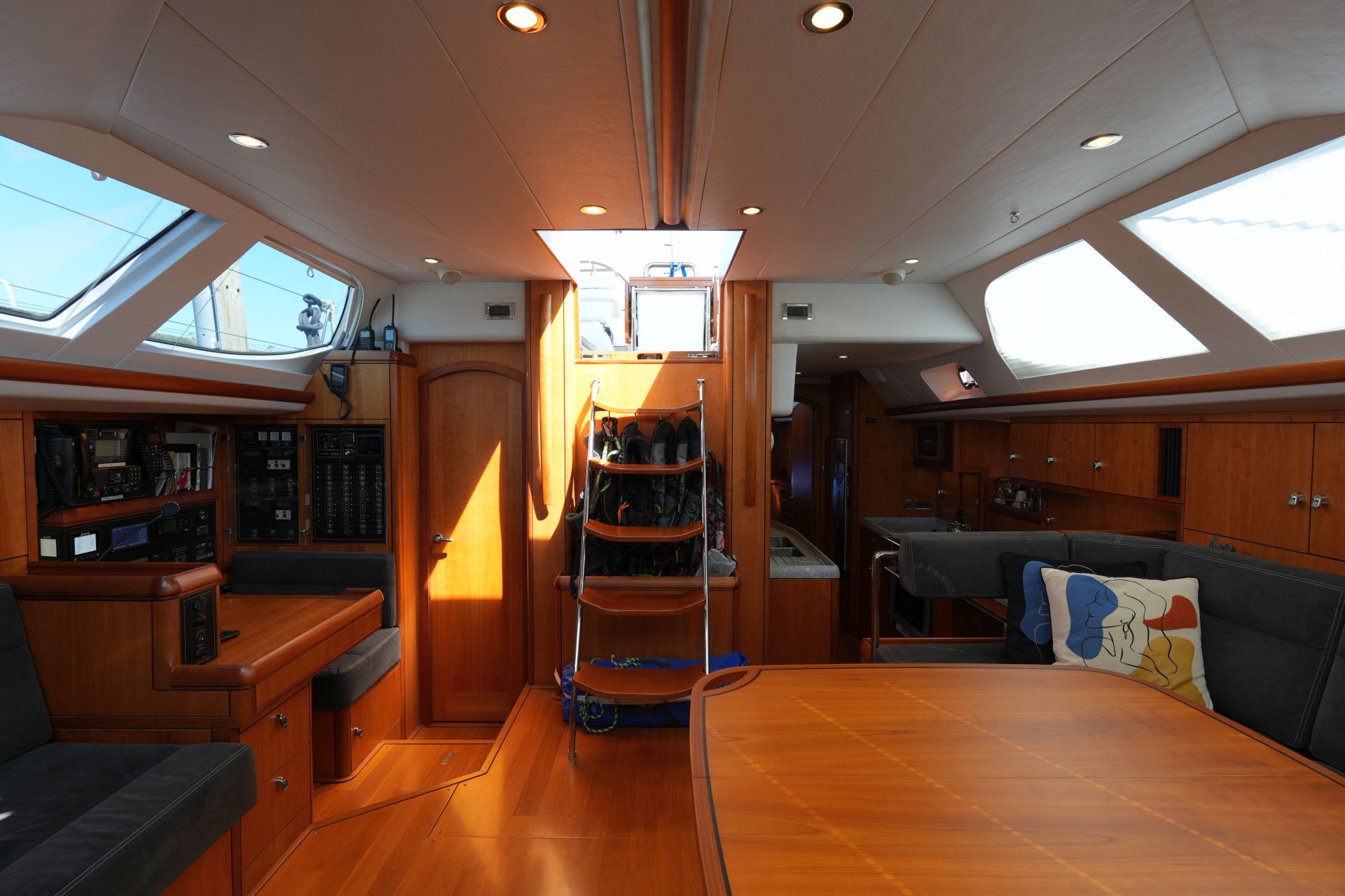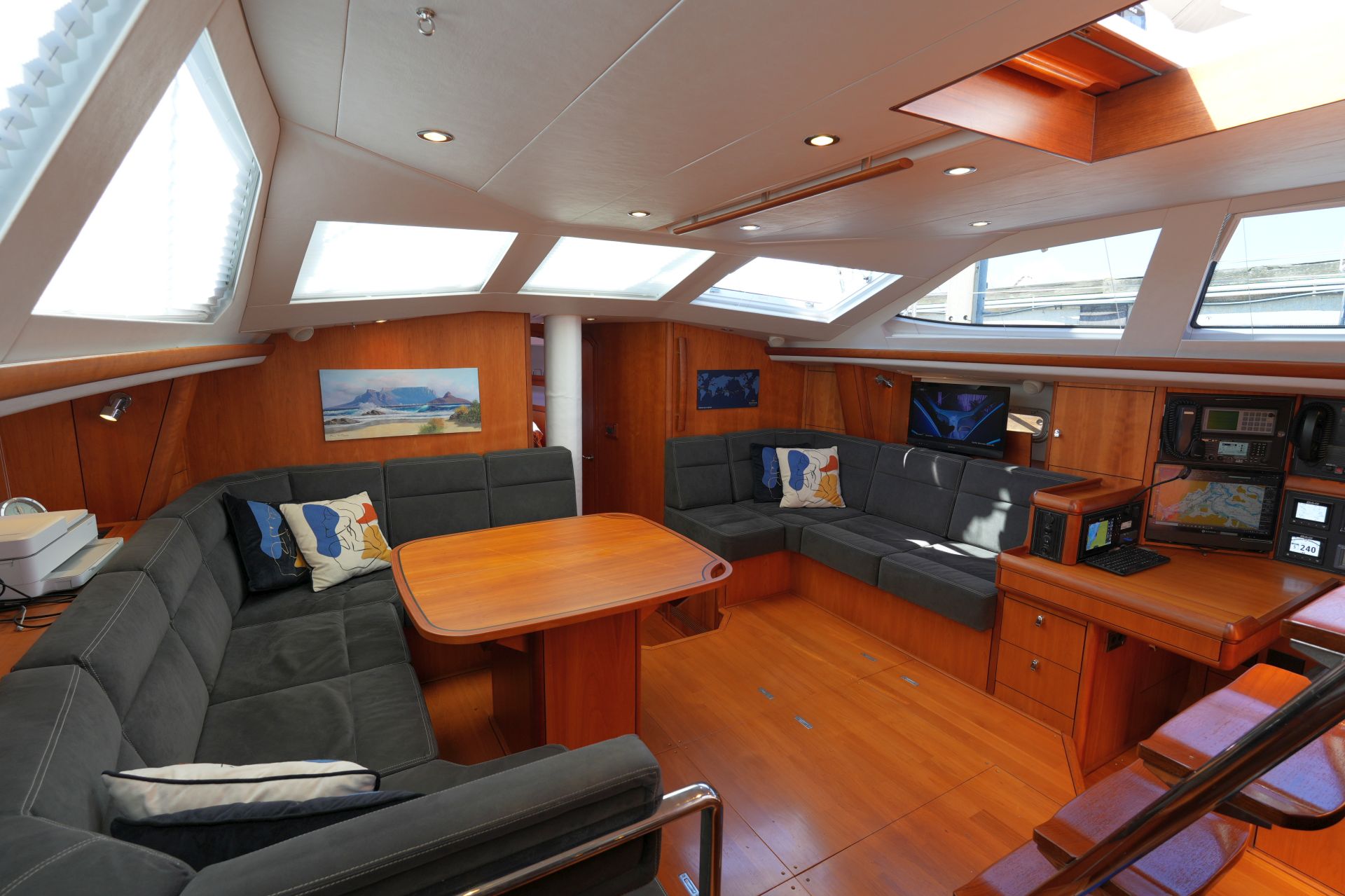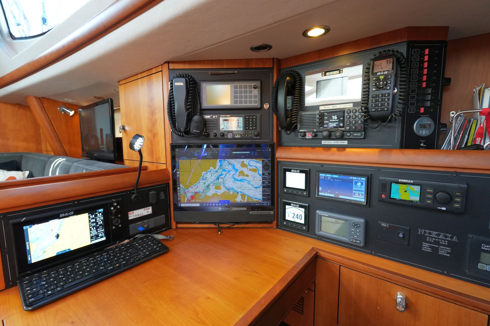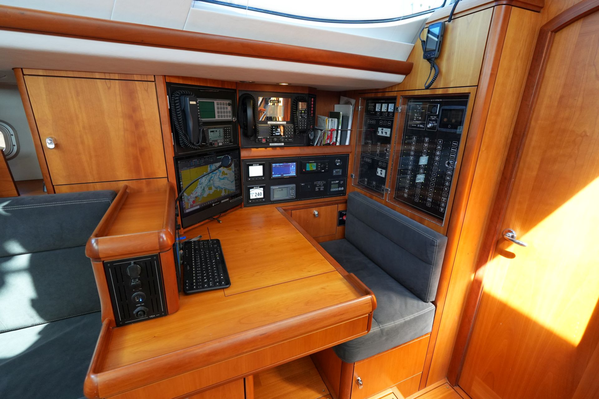 - In Fahrtrichtung eingebauter Kartentisch mit Navigatorsitz, Elektropanelen und großen Instrumentenkonsolen an Steuerbord achtern