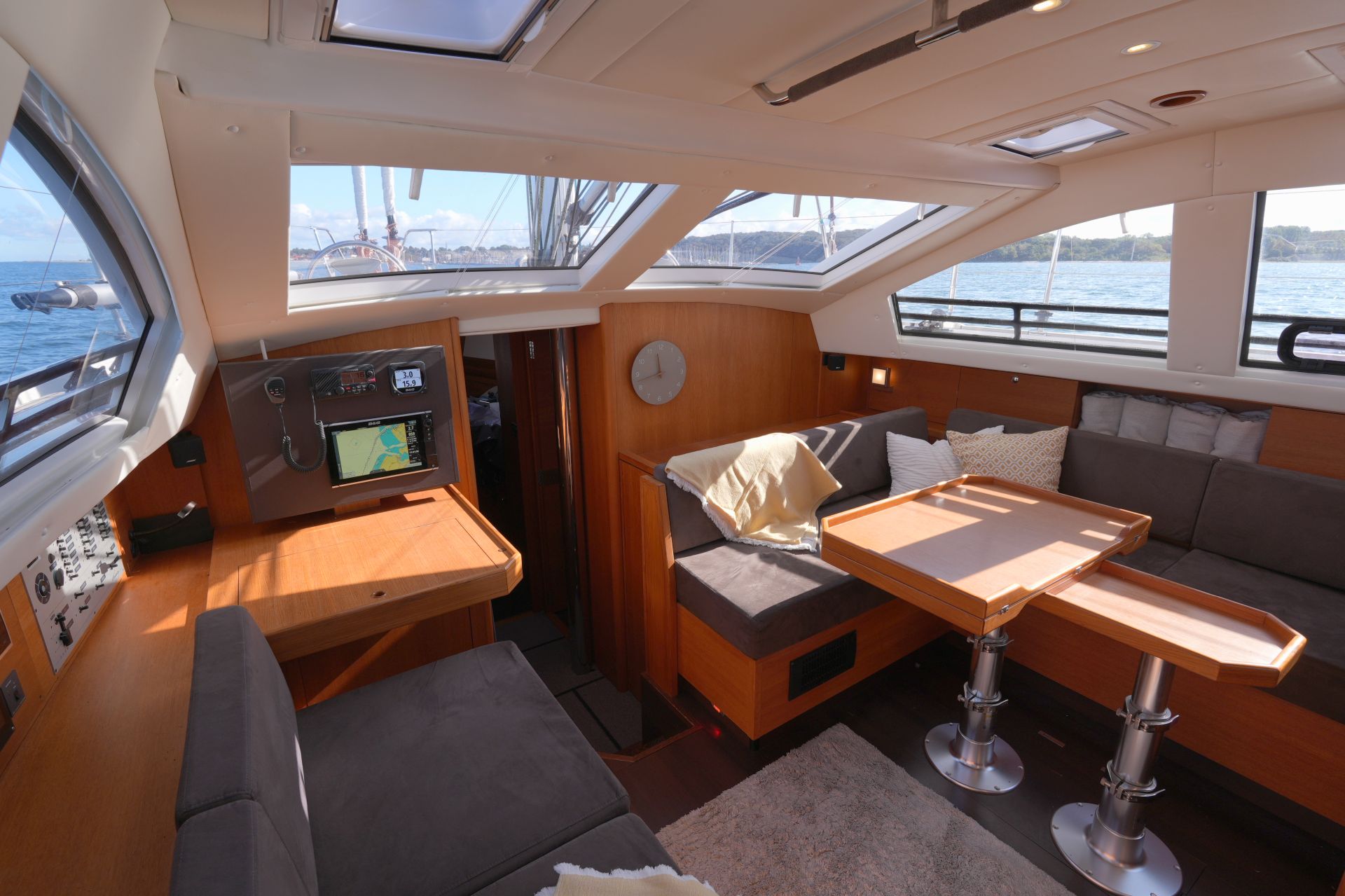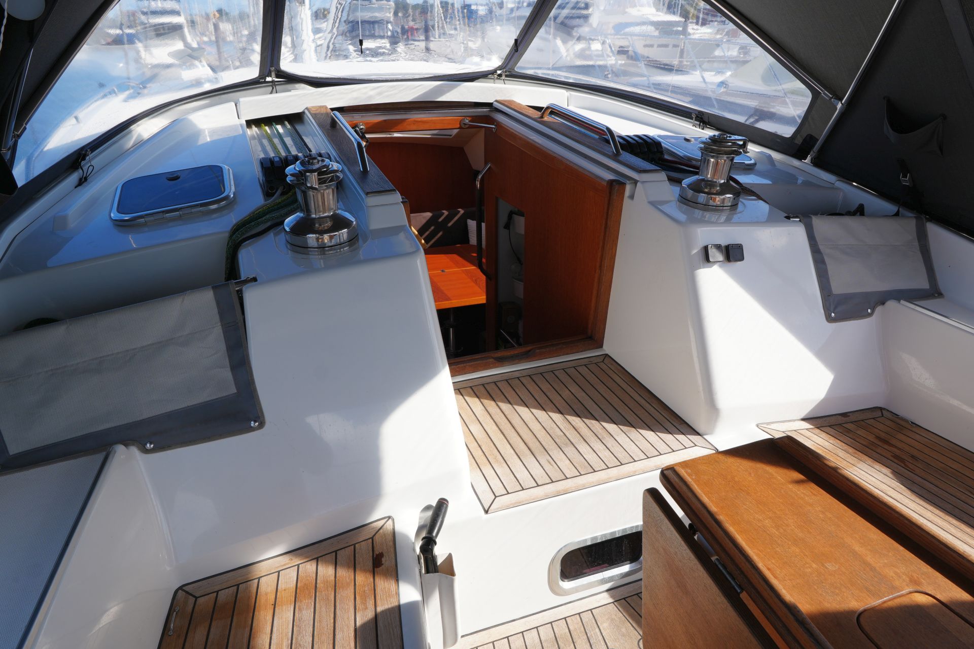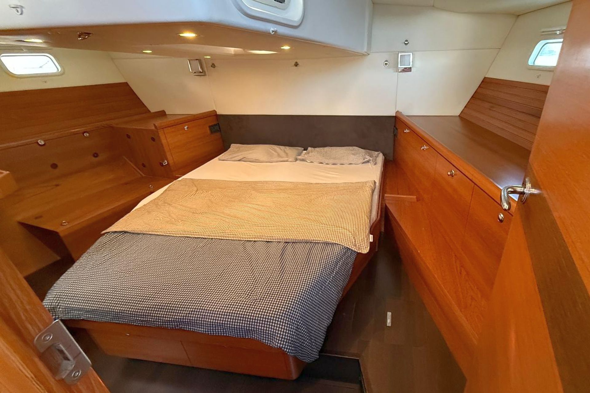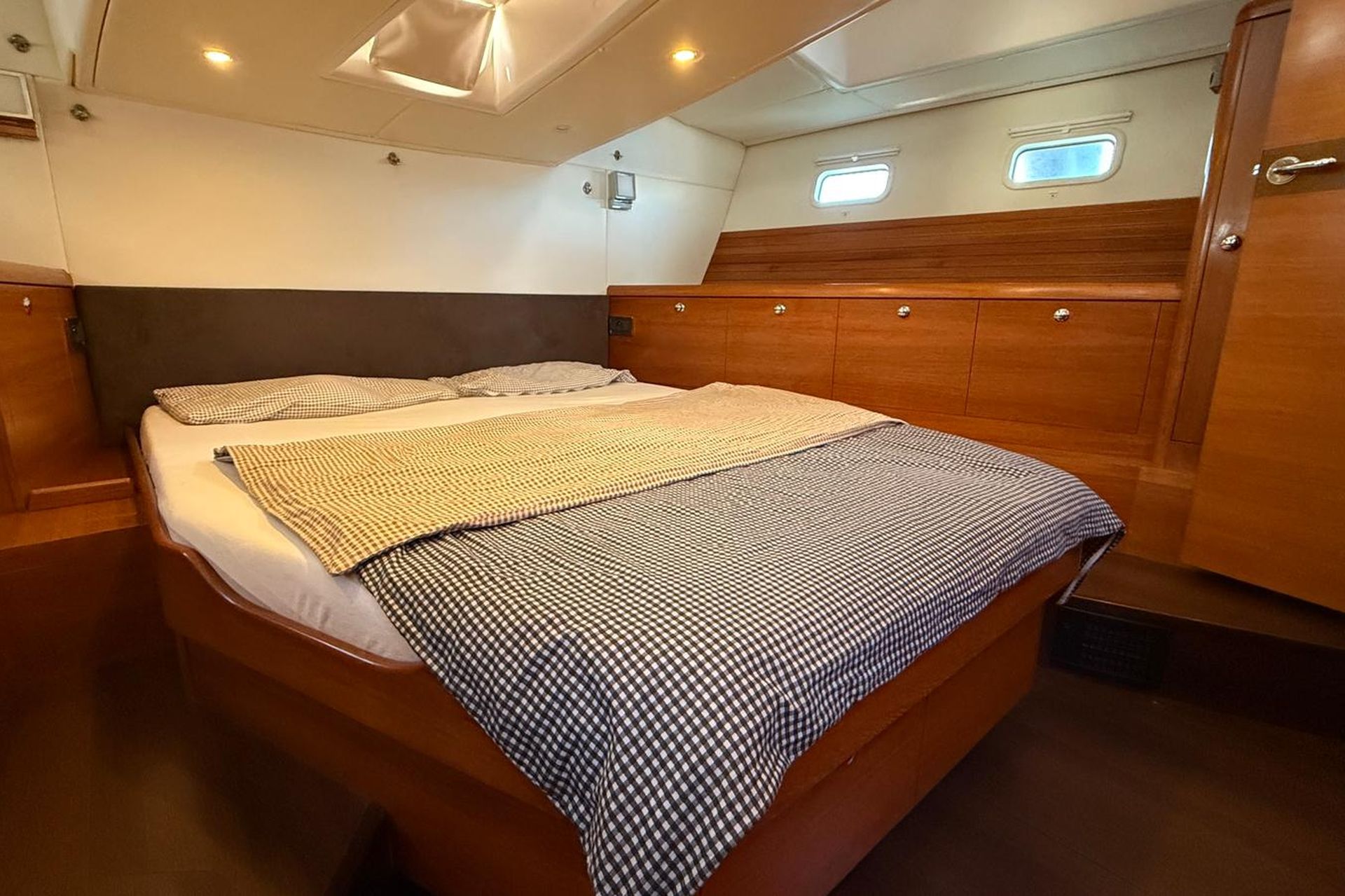 Decksalonyacht aus dem Jahr 2015Geräumige, luxuriöse und seegängige Decksalonyacht von der Französischen Qualitätswerft Wauquiez International SAS. Konstrukteur: Berret/Racoupeau Yachtdesign. Breites, gut geschütztes Cockpit mit zwei Steuerständen, Targabügel für Großschot und freiem Zugang zur breiten Badeplattform. Die Pilot Saloon 47 hat einen hellen, freundlichen Decksalon mit gehobenem Salonboden (360° Panorama aus der Dinette) mit Salonpolstern in Alcantara. 3 Kabinen-Layout mit geräumiger Eignerkabine im Heck über die gesamte Schiffsbreite mit großer, freistehender Doppelkoje und Eignerbad mit separater Duschkabine. Vorschiffskabine mit Doppelkoje, Lateralkabine mit Pullmanbetten und zweite Nasszelle mit separater Duschkabine. Die Pilot Saloon 47 bietet jede Menge Stauraum in Backskisten, Schränken Schubladen und unter den Kojen. Die Pilot Saloon 47 ist aufwendig in mit Bienenwachs handpoliertem Burma-Teak sowie Bodenbrettern in dunklem Wenge ausgebaut. Viele liebevoll ausgeführte Details und reichlich massives Teakholz in Rahmen, Leisten und Profilen.