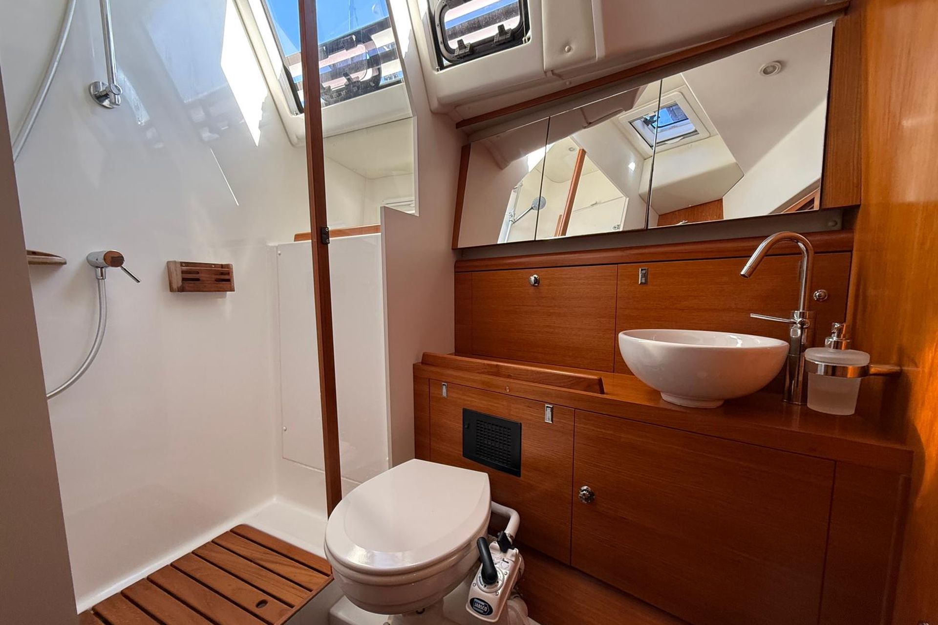 - Gästebad an Backbord vorn mit separater Duschkabine, Waschtisch und Marine-WC