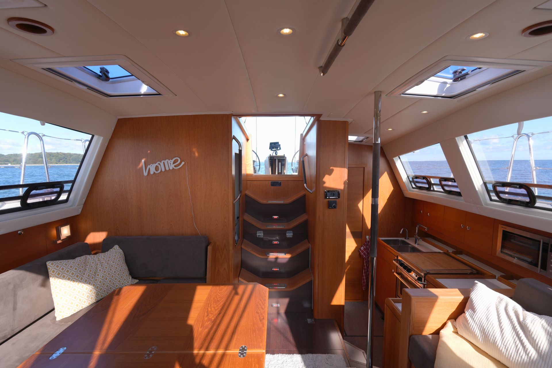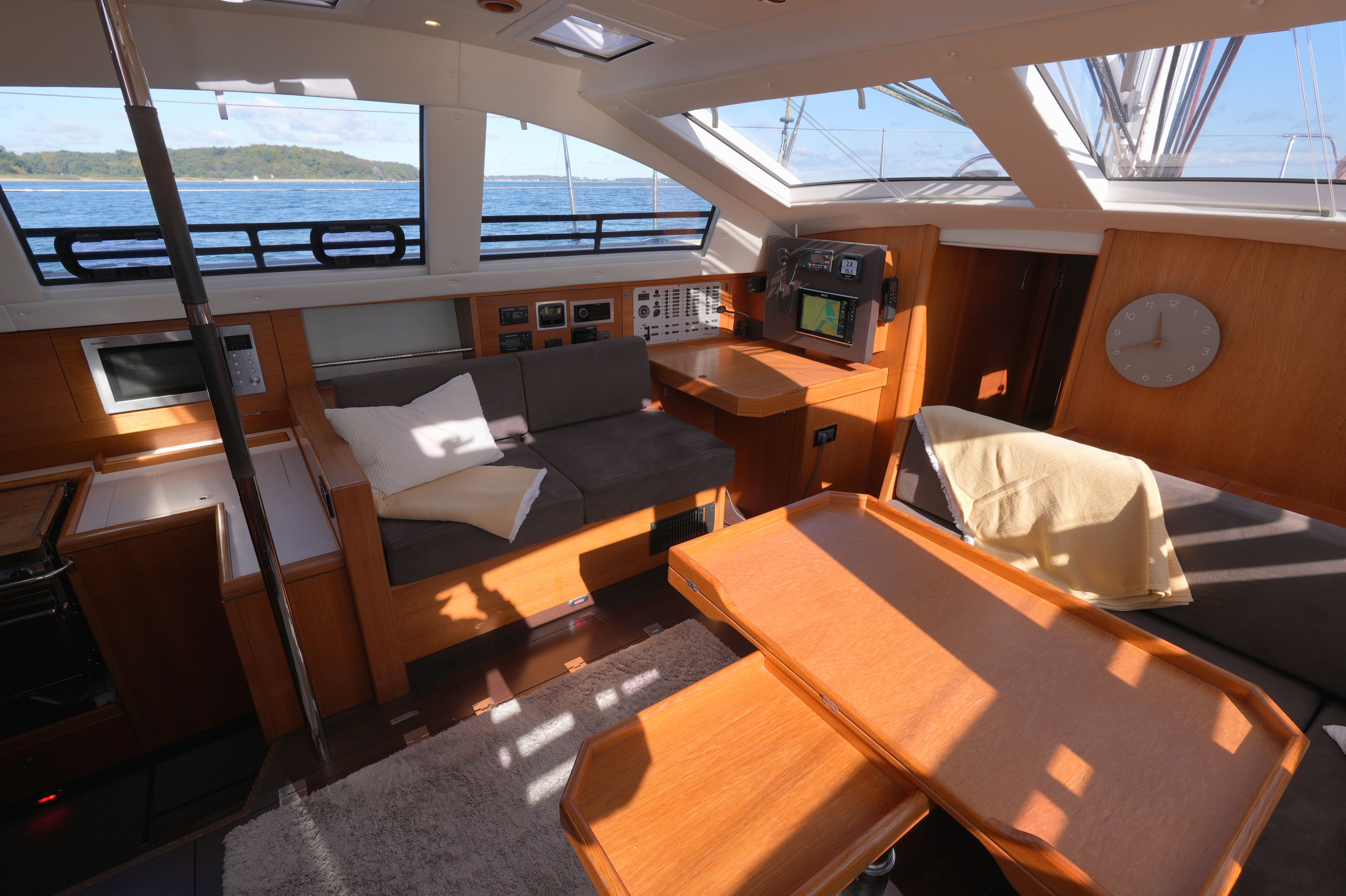 - Der Salontisch kann abgesengt und zu einer zusätzlichen Koje umgebaut werden