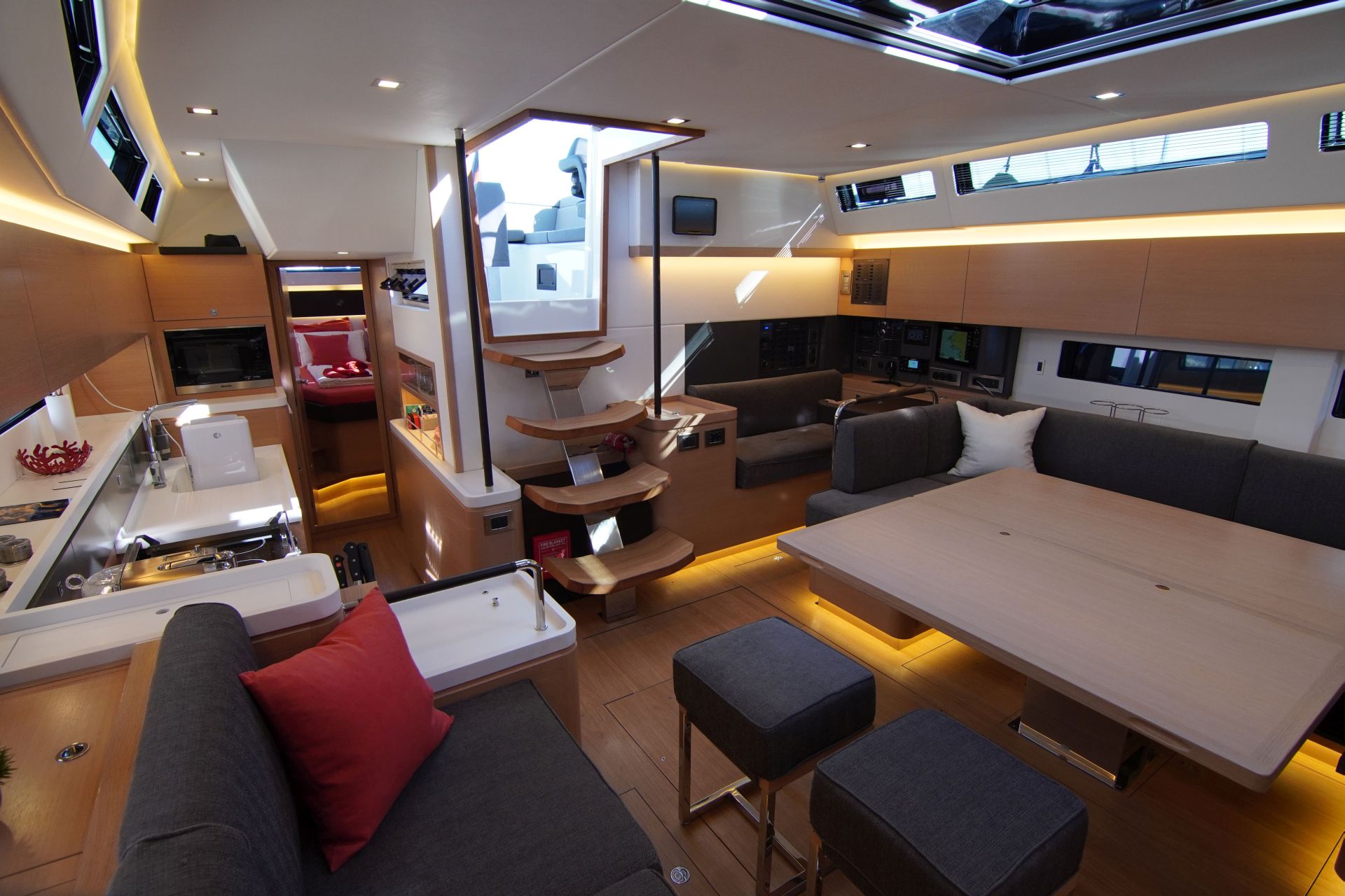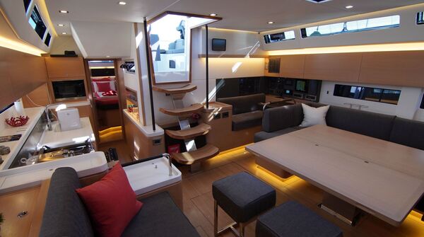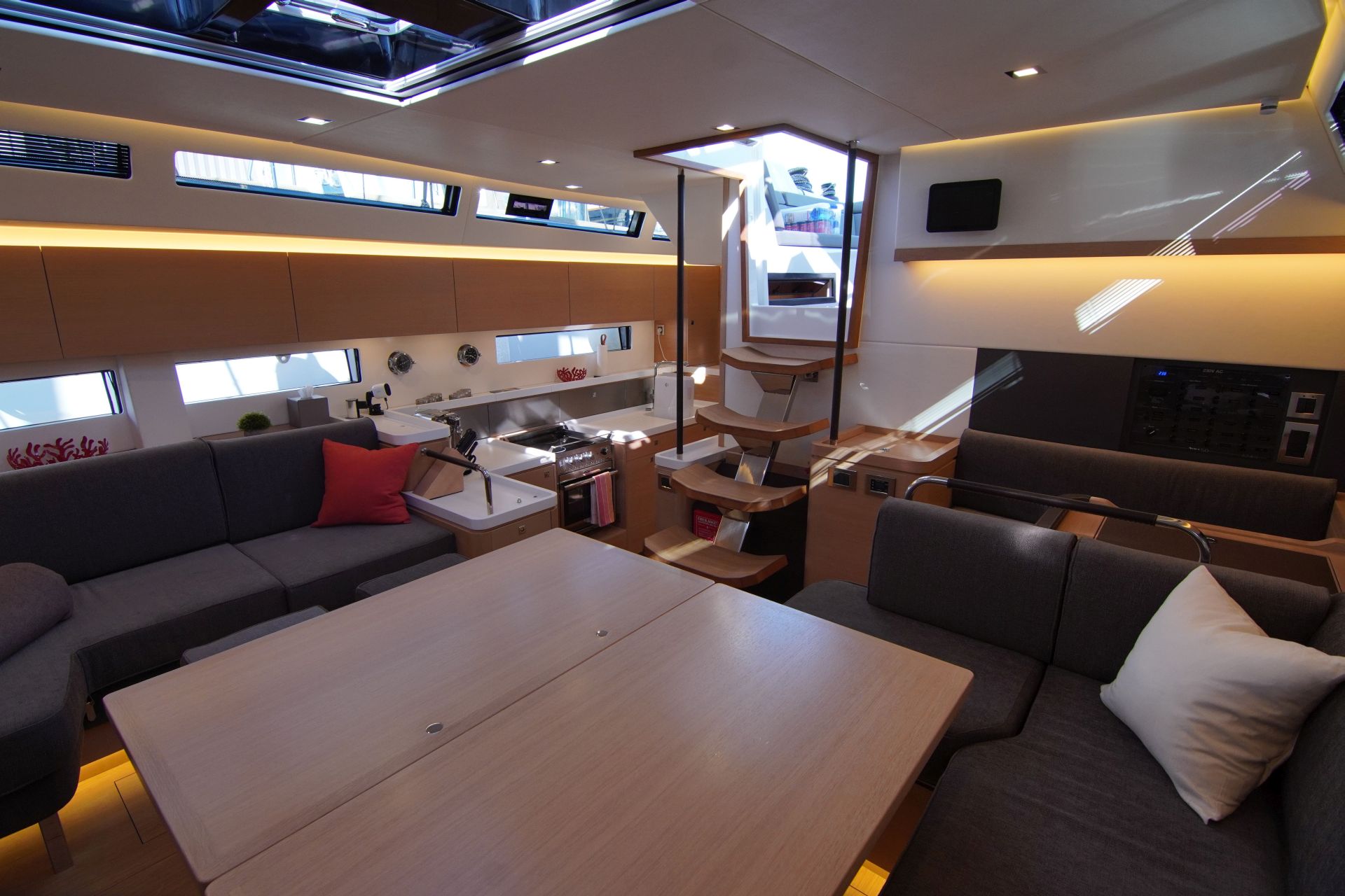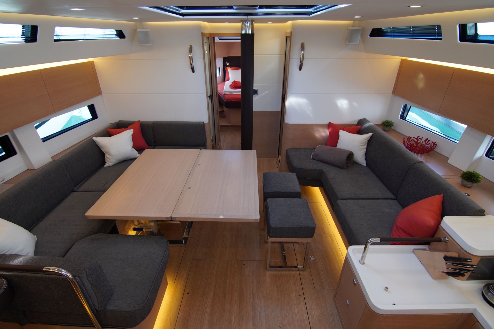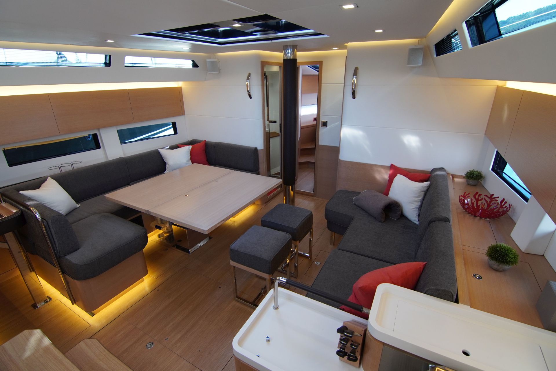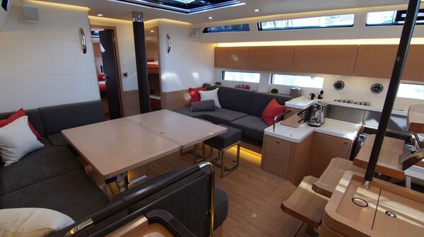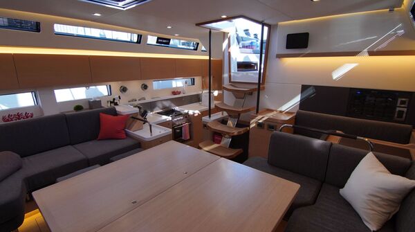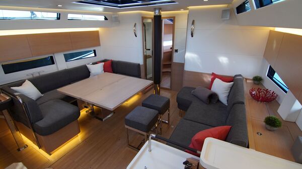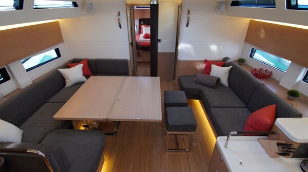 - Großzügiger, geräumiger Salon mit U-förmiger Sitzgruppe an Backbord