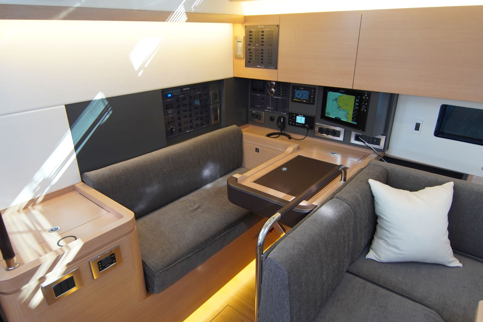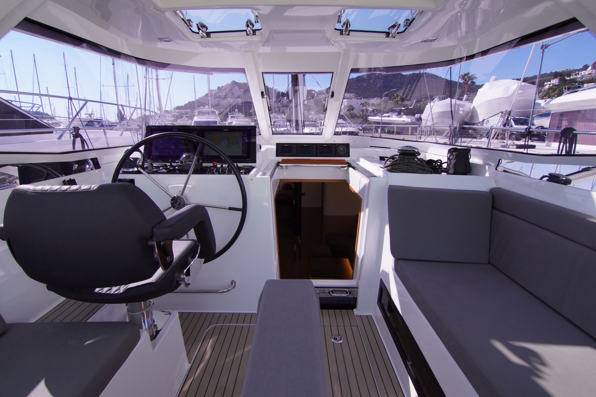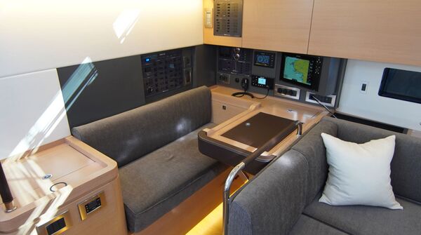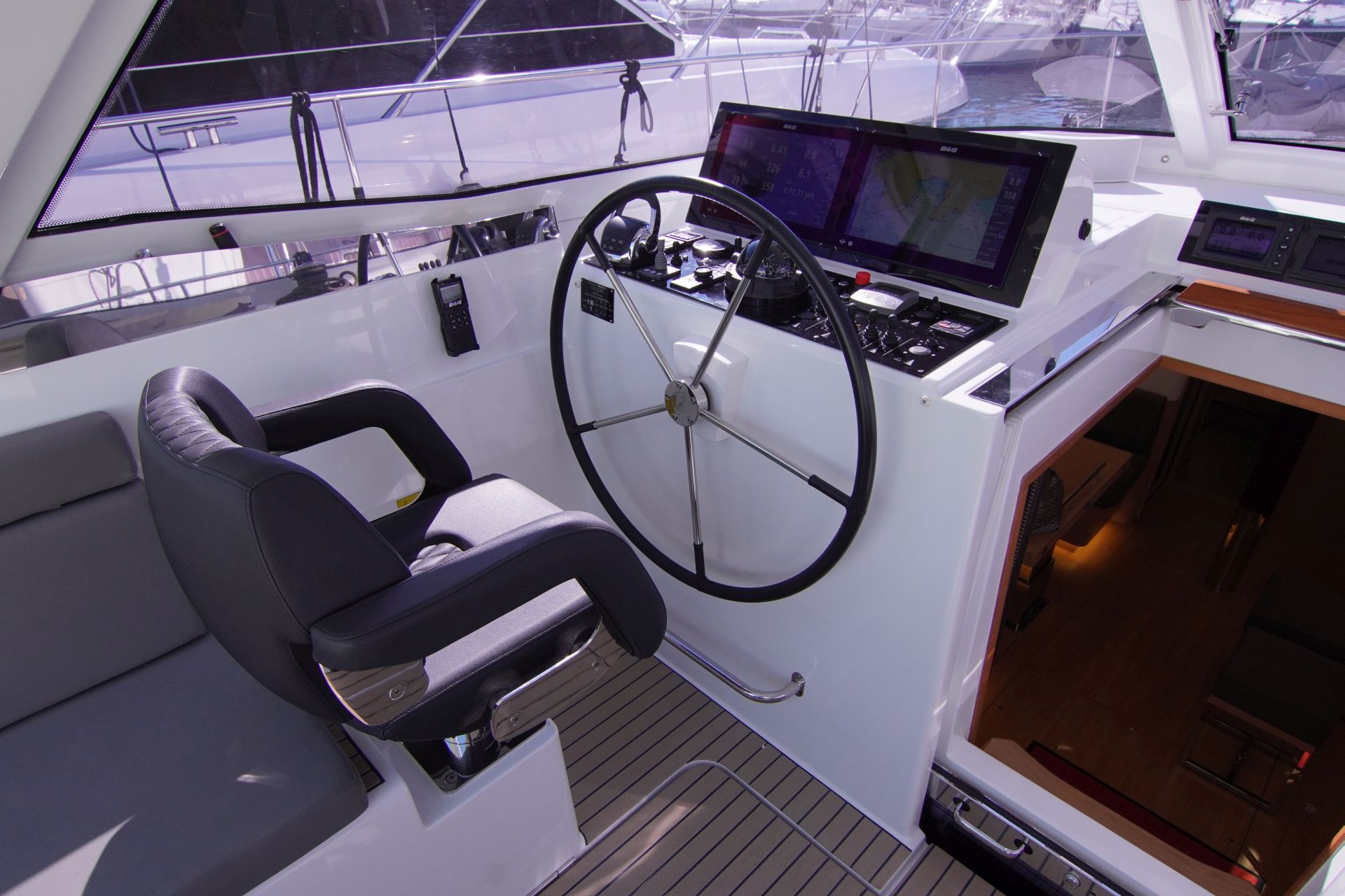 - Tiefes gut geschütztes Cockpit mit Steuerstand und Steuersitz an Backbord