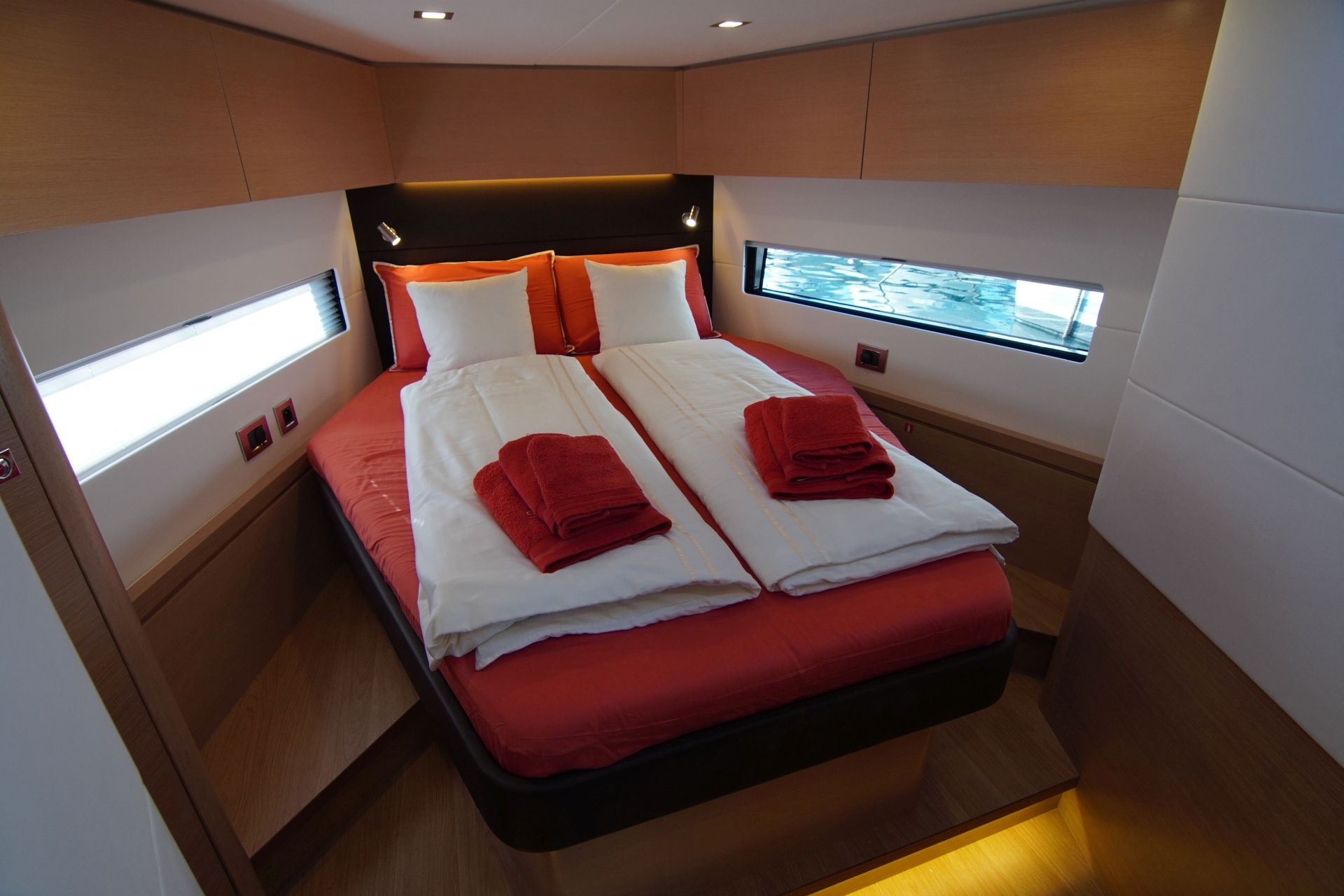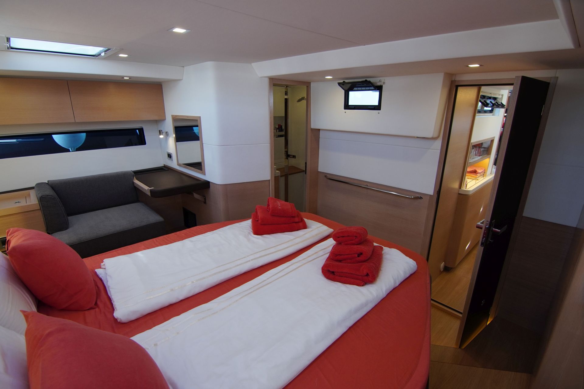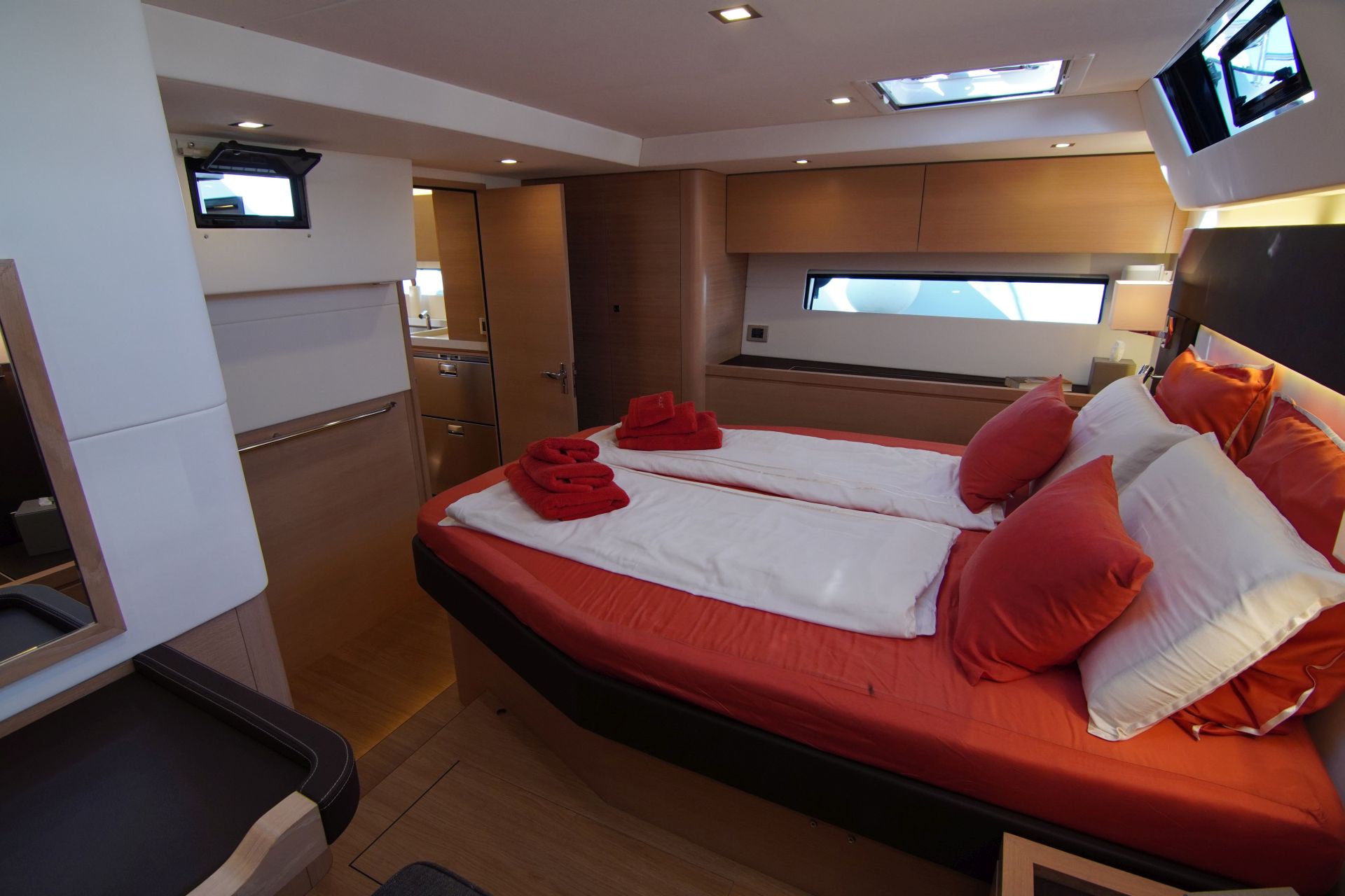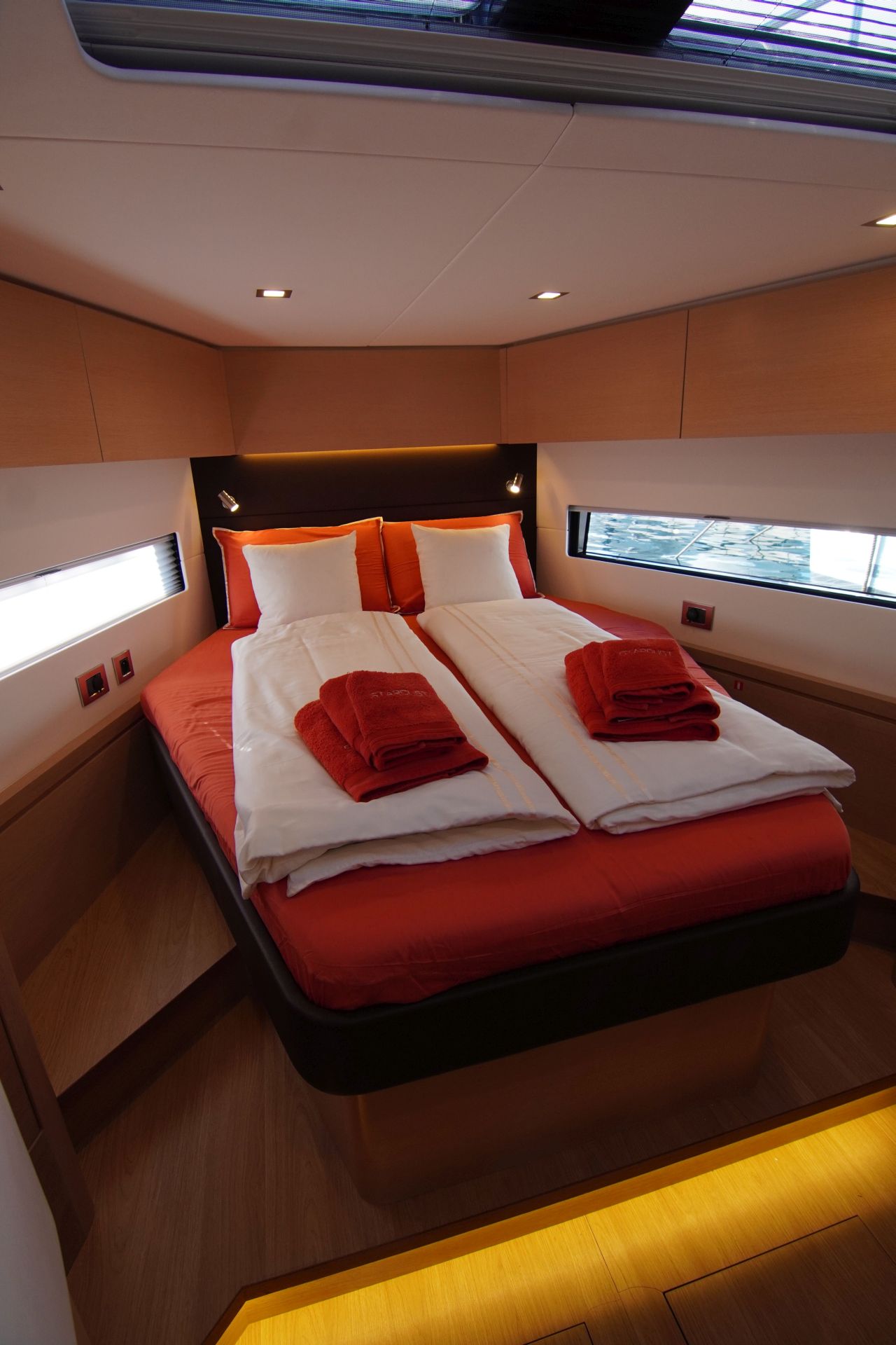 - Elektroherd FORCE 10 (3 Flammen und Backofen) - Luxuriöse, geräumige Eignerkabine im Heck mit frei stehender Doppelkoje, Sessel und Schminktisch, Safe, reichlich Stauraum in Schränken, Fächern, Regalen und unter der Koje, die mit Gasdruckfedern hochgeklappt werden kann.