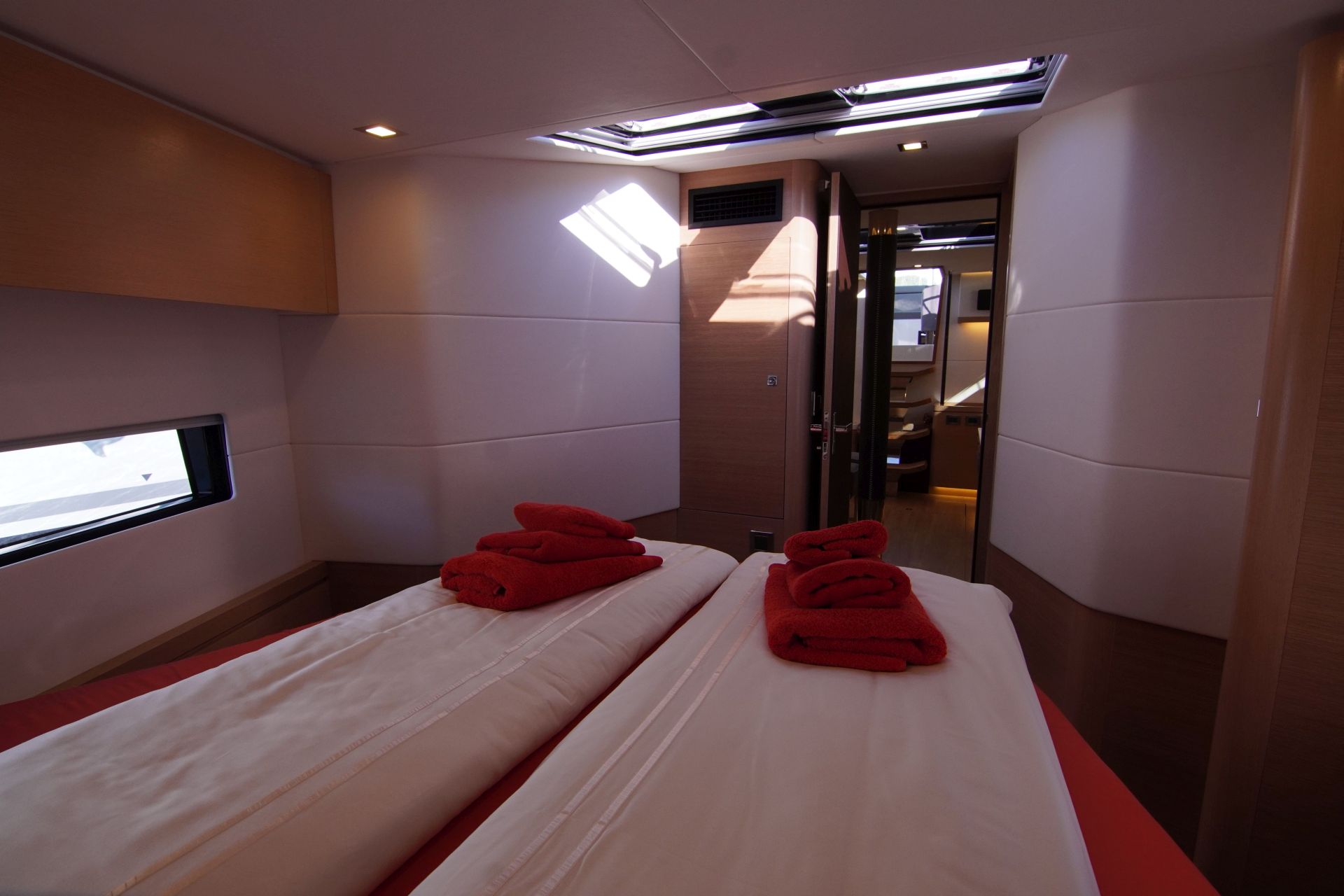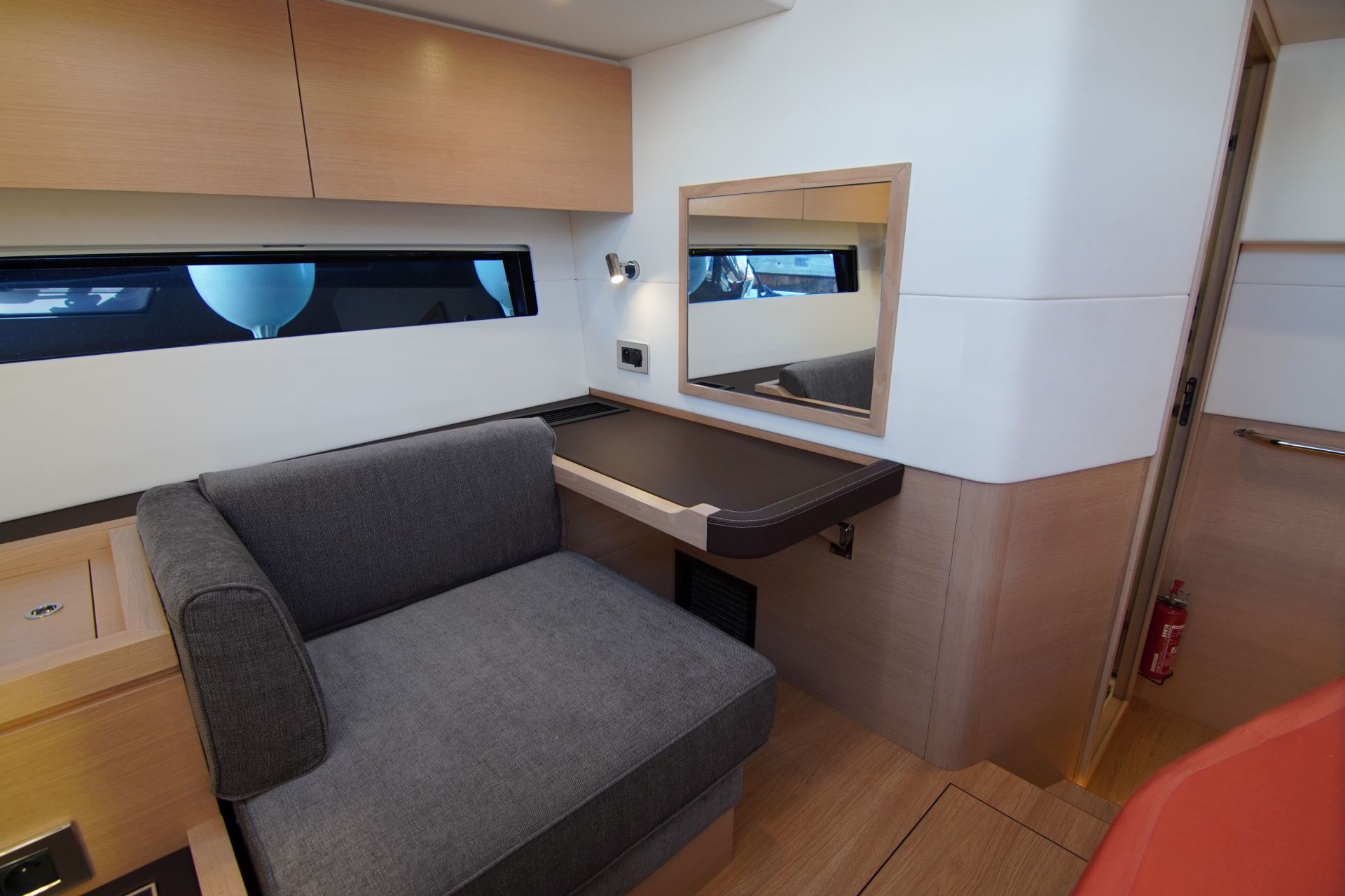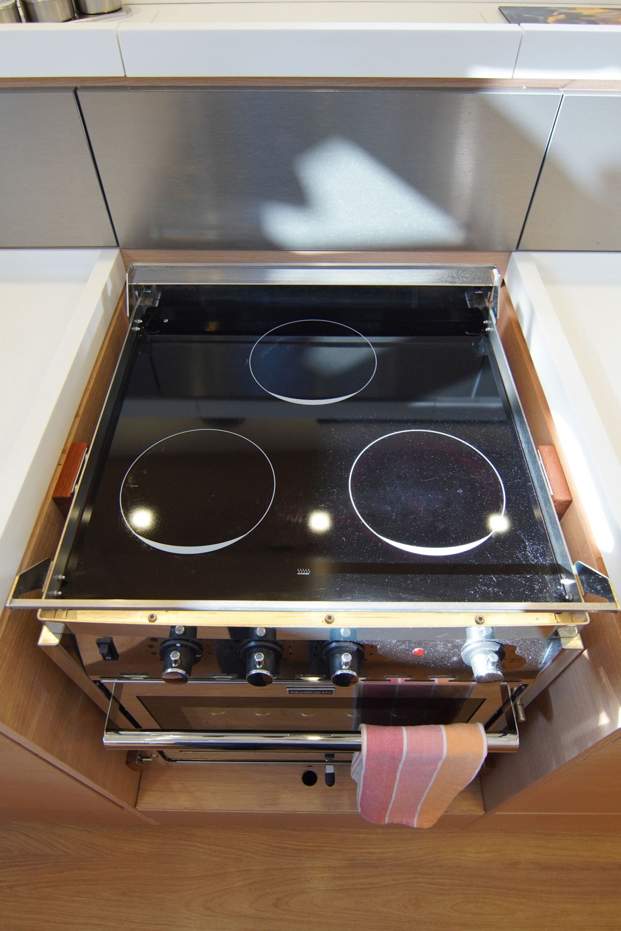 - Elektroherd FORCE 10 (3 Flammen und Backofen) - Luxuriöse, geräumige Eignerkabine im Heck mit frei stehender Doppelkoje, Sessel und Schminktisch, Safe, reichlich Stauraum in Schränken, Fächern, Regalen und unter der Koje, die mit Gasdruckfedern hochgeklappt werden kann.