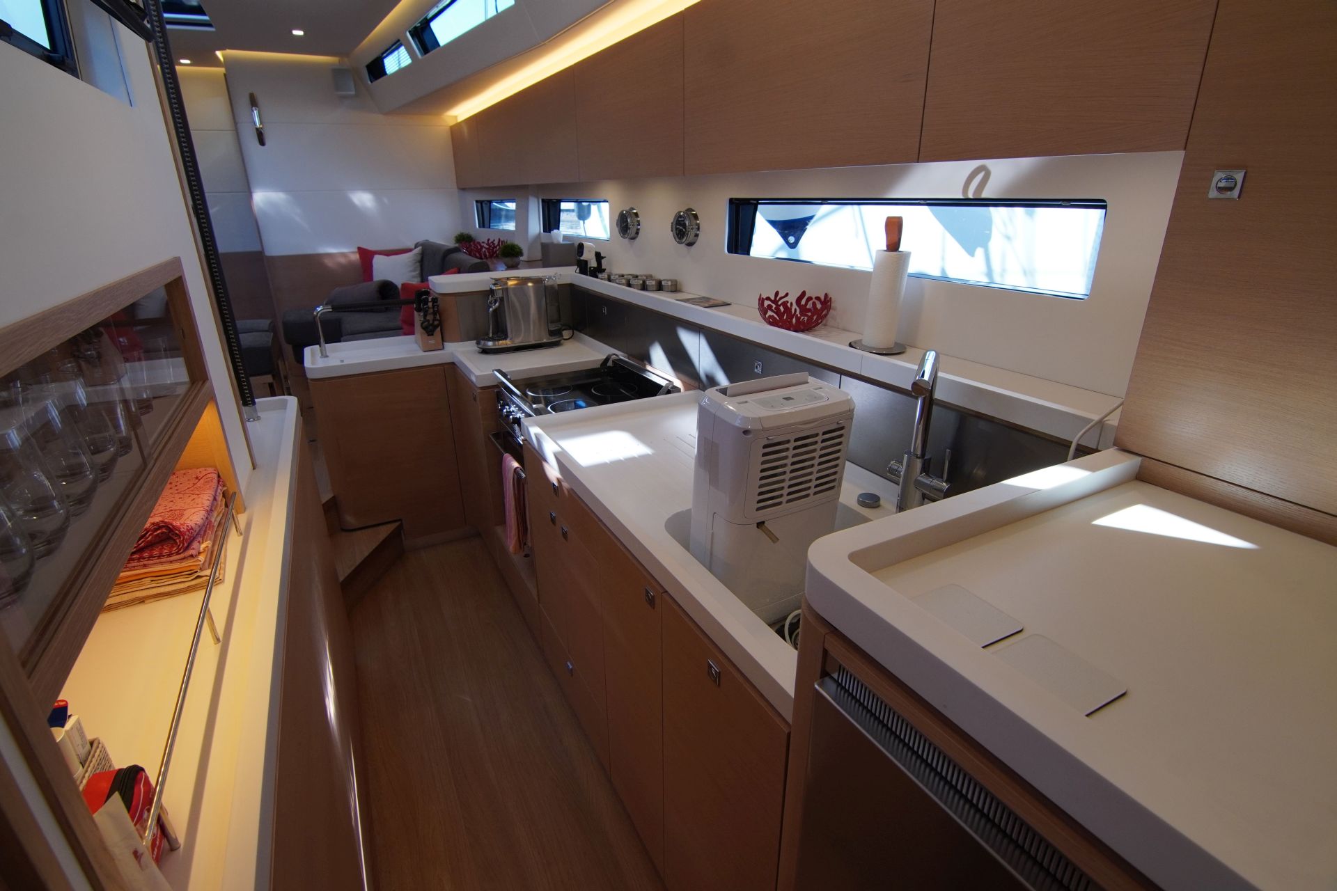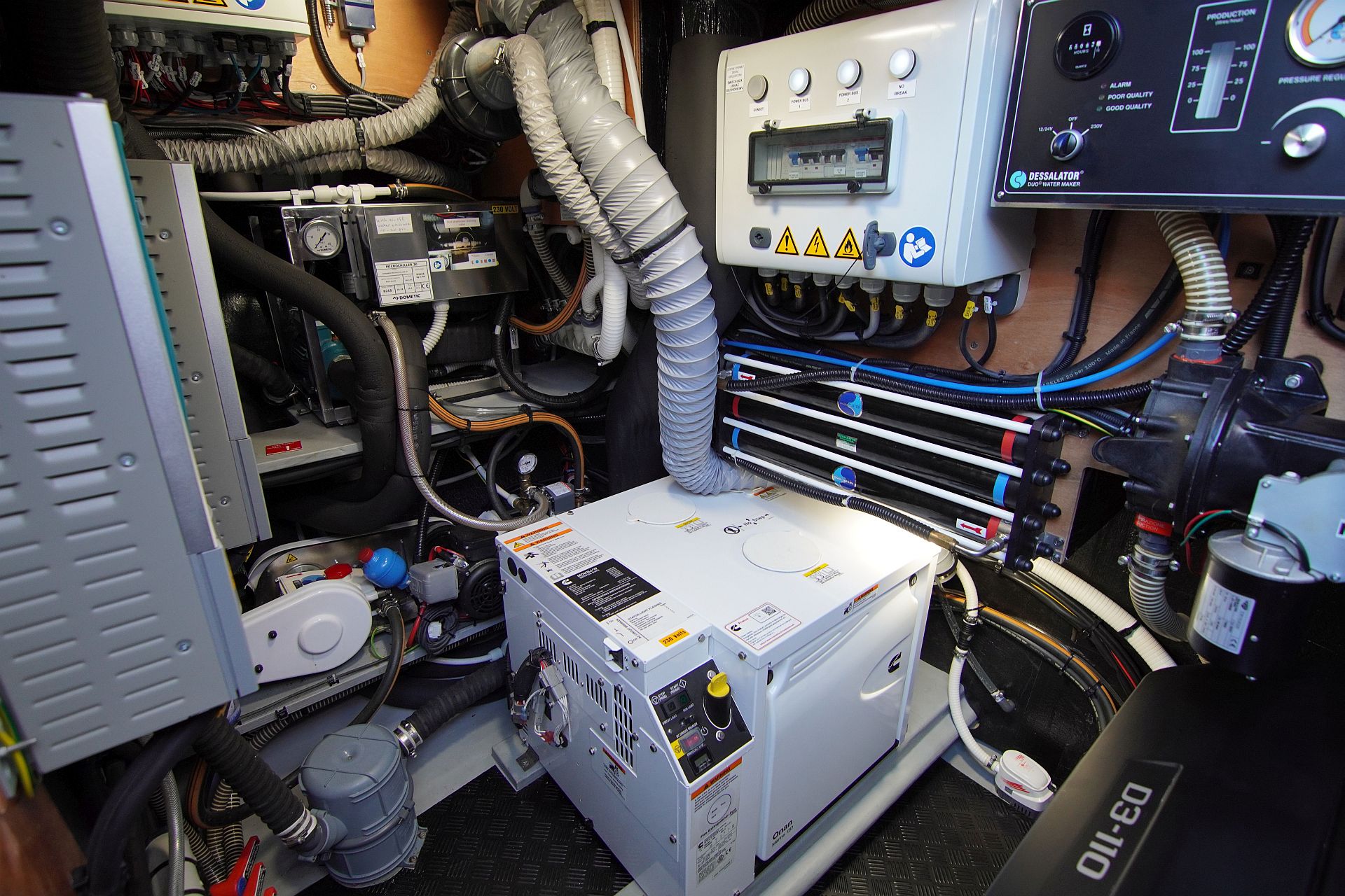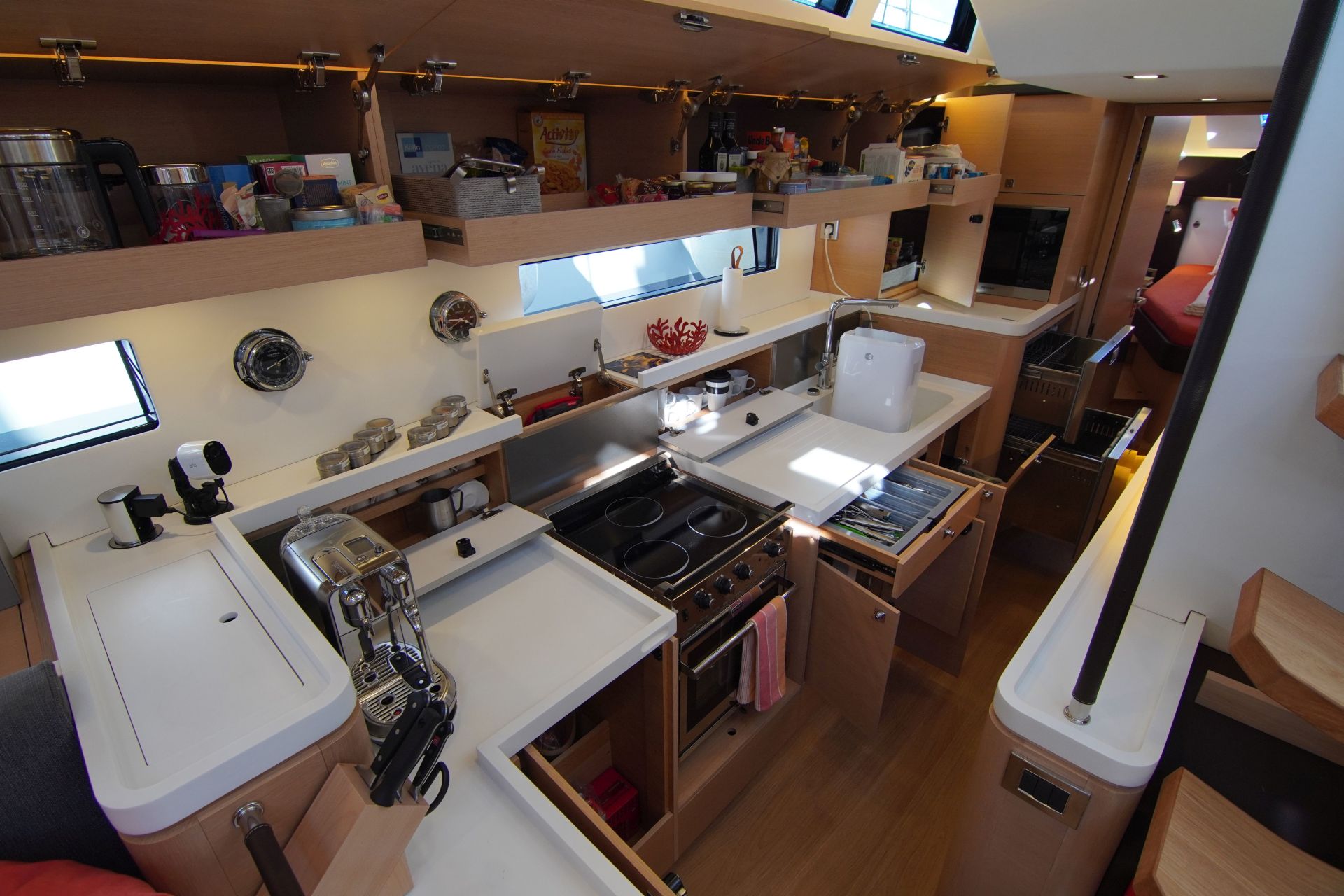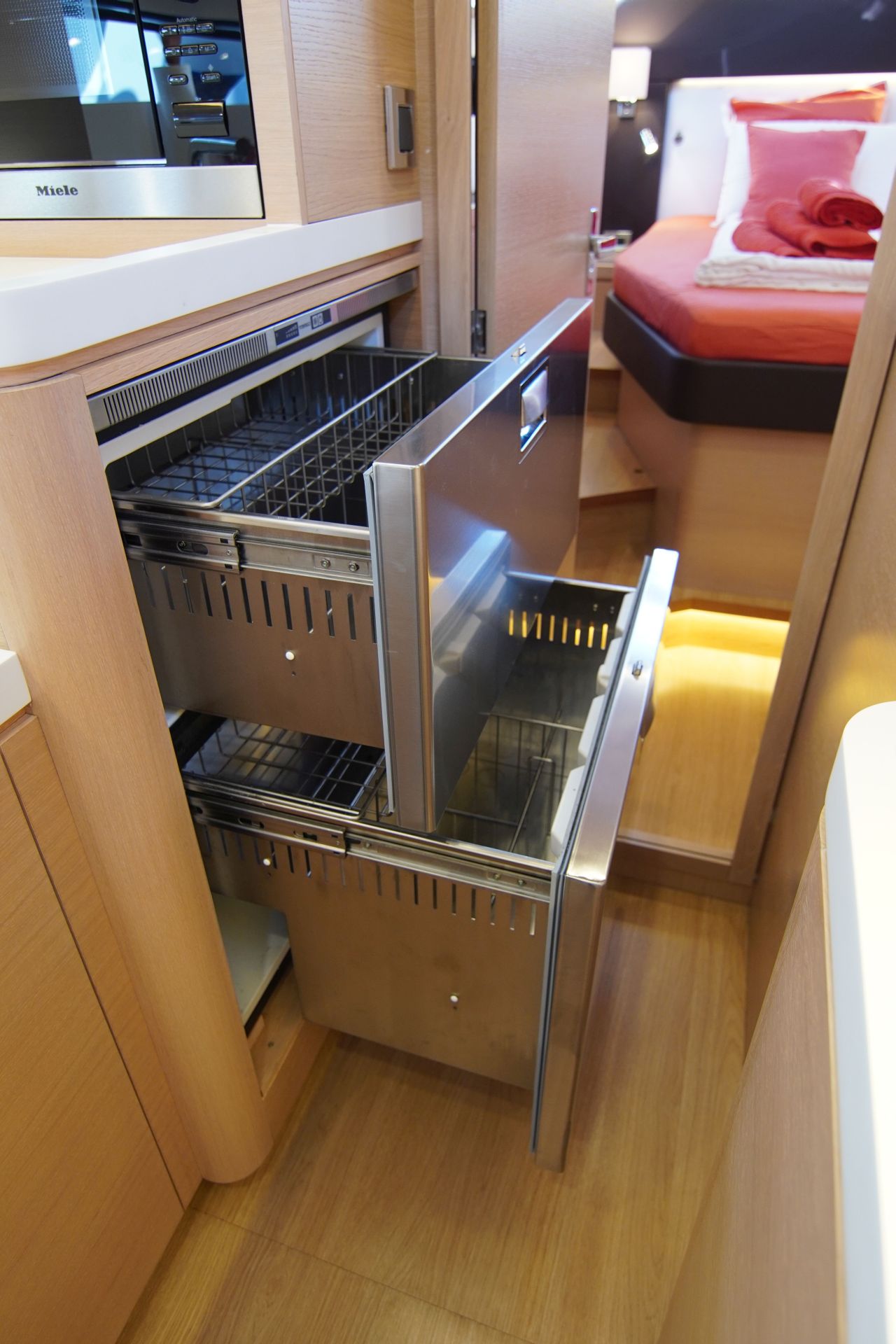 - Elektroherd FORCE 10 (3 Flammen und Backofen) - Luxuriöse, geräumige Eignerkabine im Heck mit frei stehender Doppelkoje, Sessel und Schminktisch, Safe, reichlich Stauraum in Schränken, Fächern, Regalen und unter der Koje, die mit Gasdruckfedern hochgeklappt werden kann.