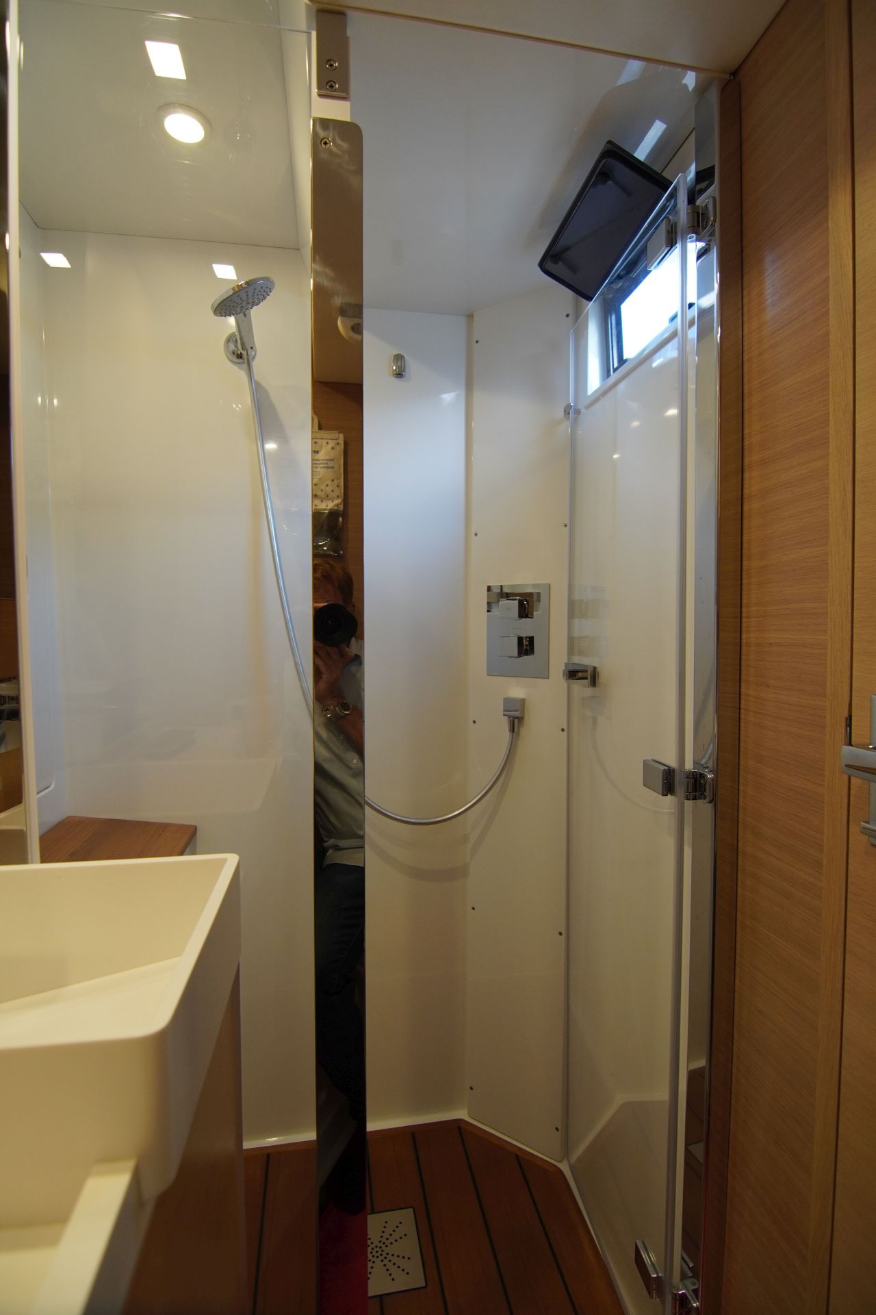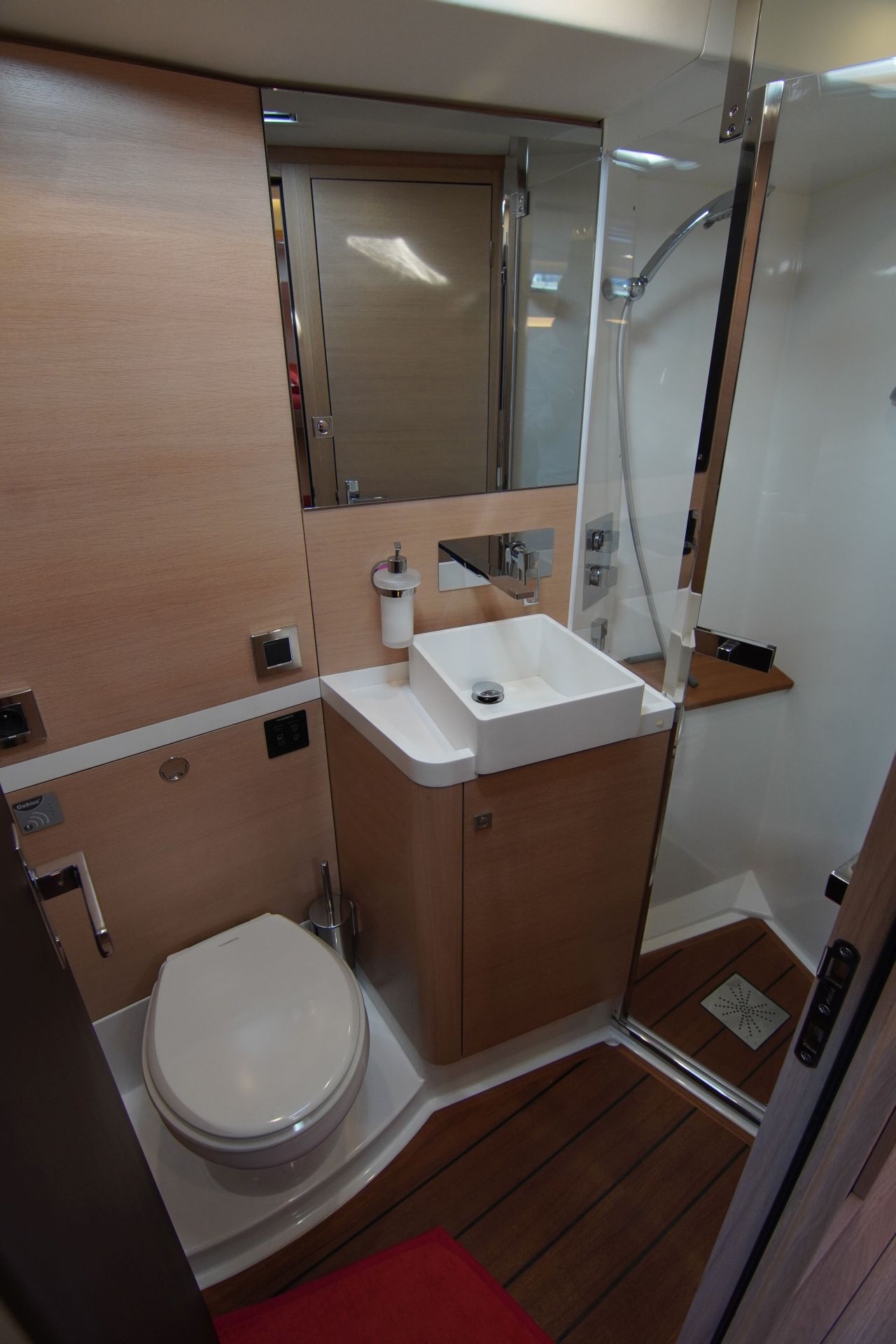 - Nasszelle mit separater Duschkabine und elektrischer Toilette an Backbord