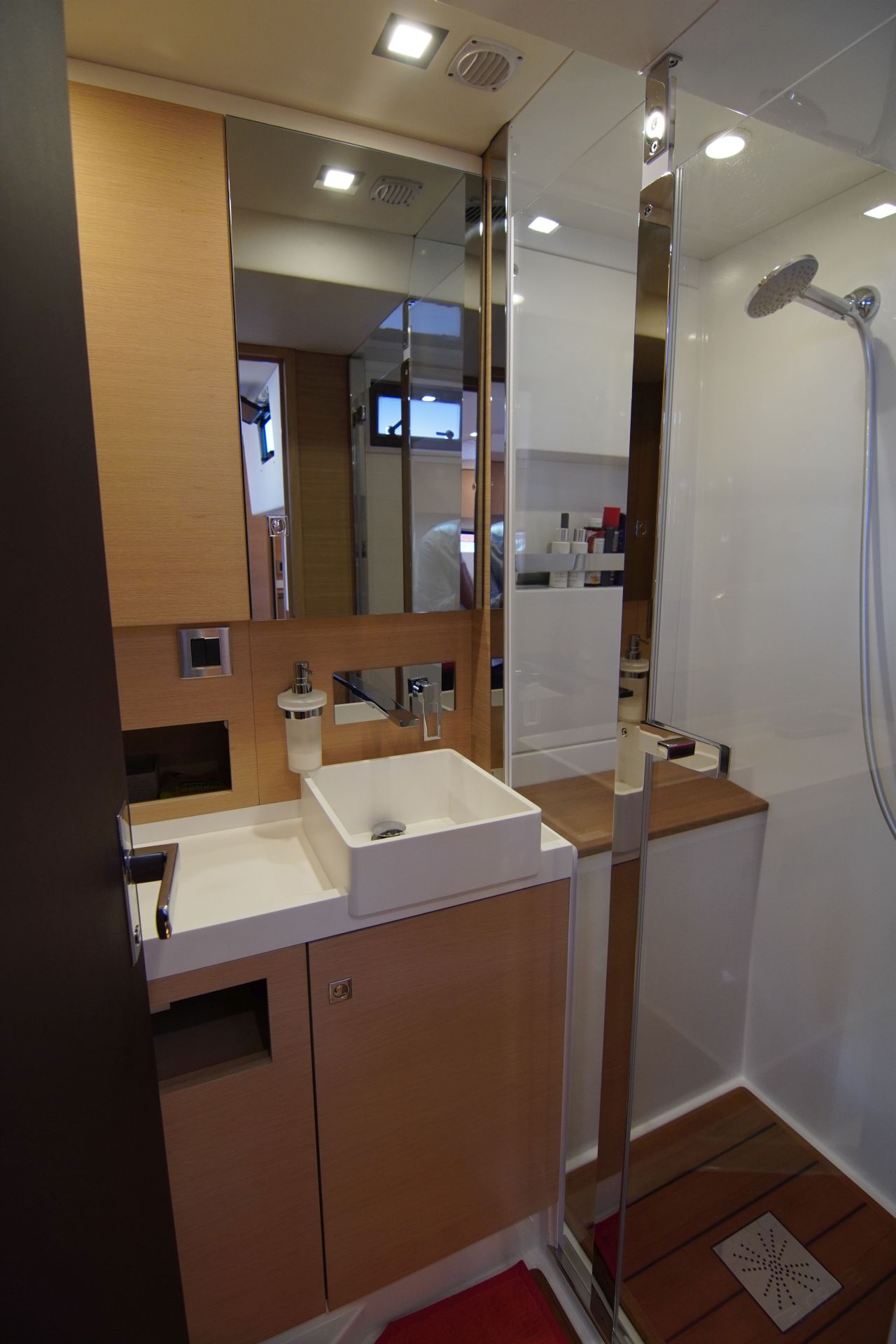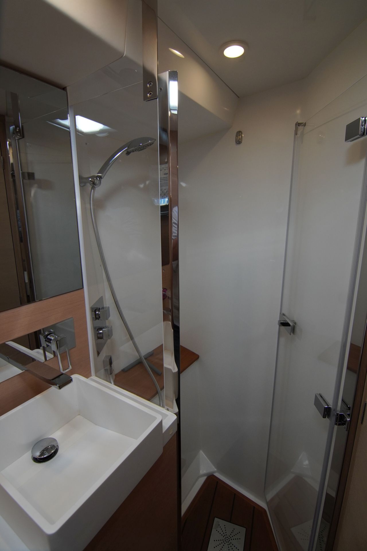 - Eignerbad mit separater Duschkabine und elektrischer Toilette an Backbord