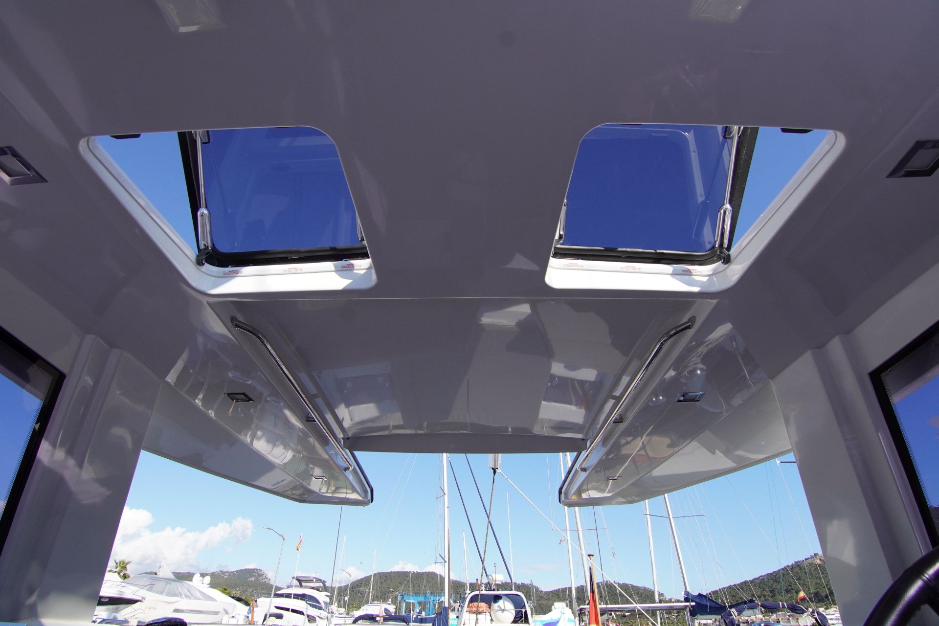 - Doghouse mit Winschutzscheibe (zentrale Scheibe zum Öffnen), zwei Luken im Dach, Deckenbeleuchtung und achtern ausziebarem GFK-Bimini