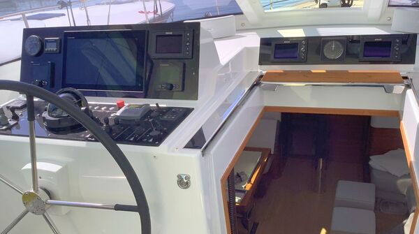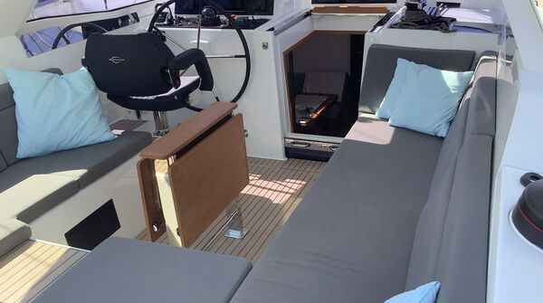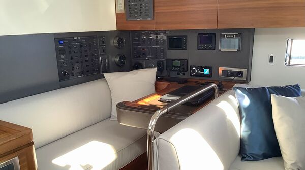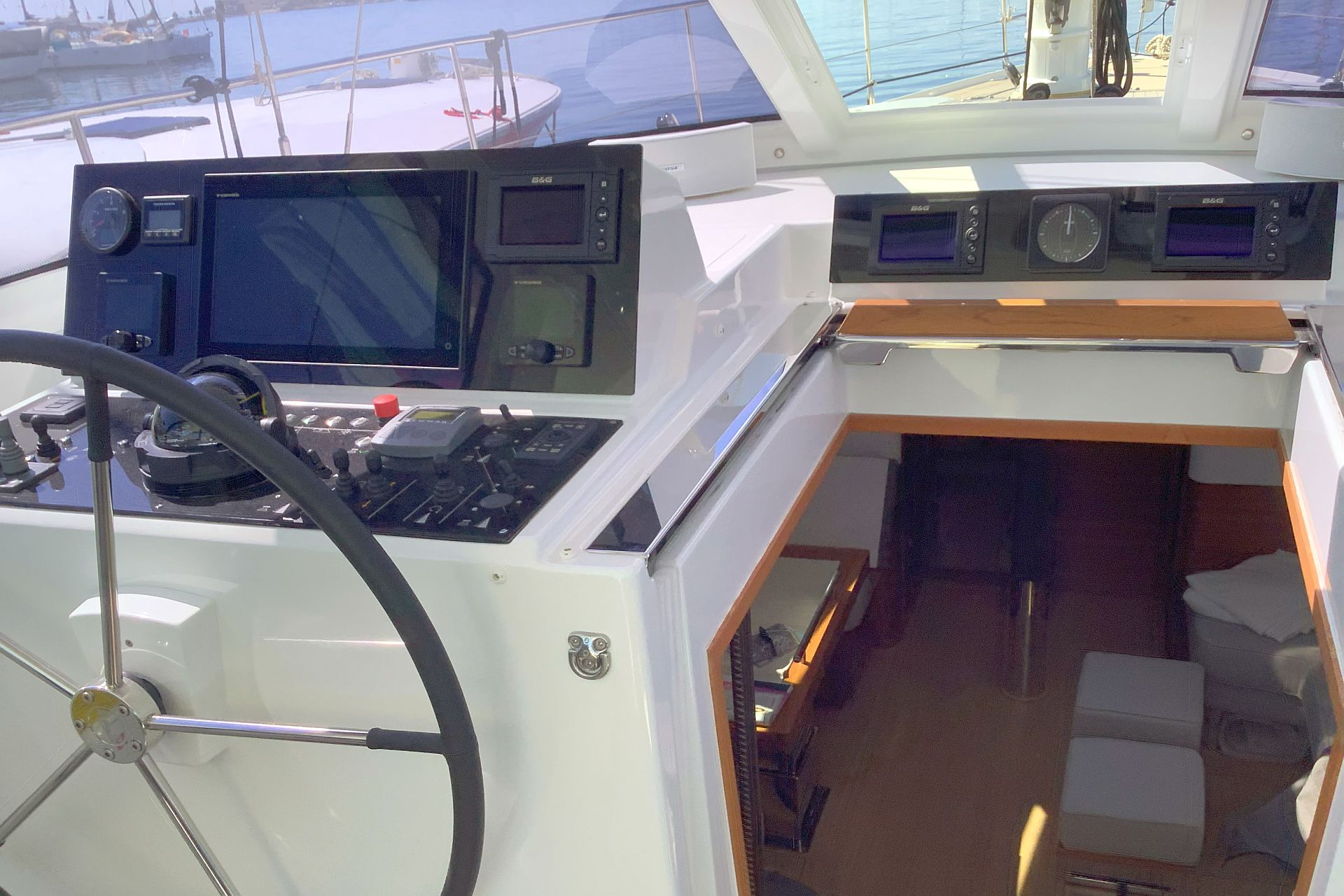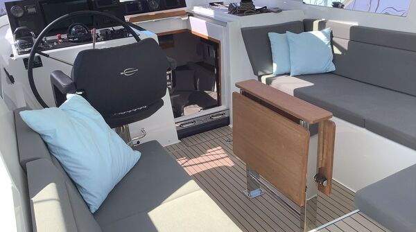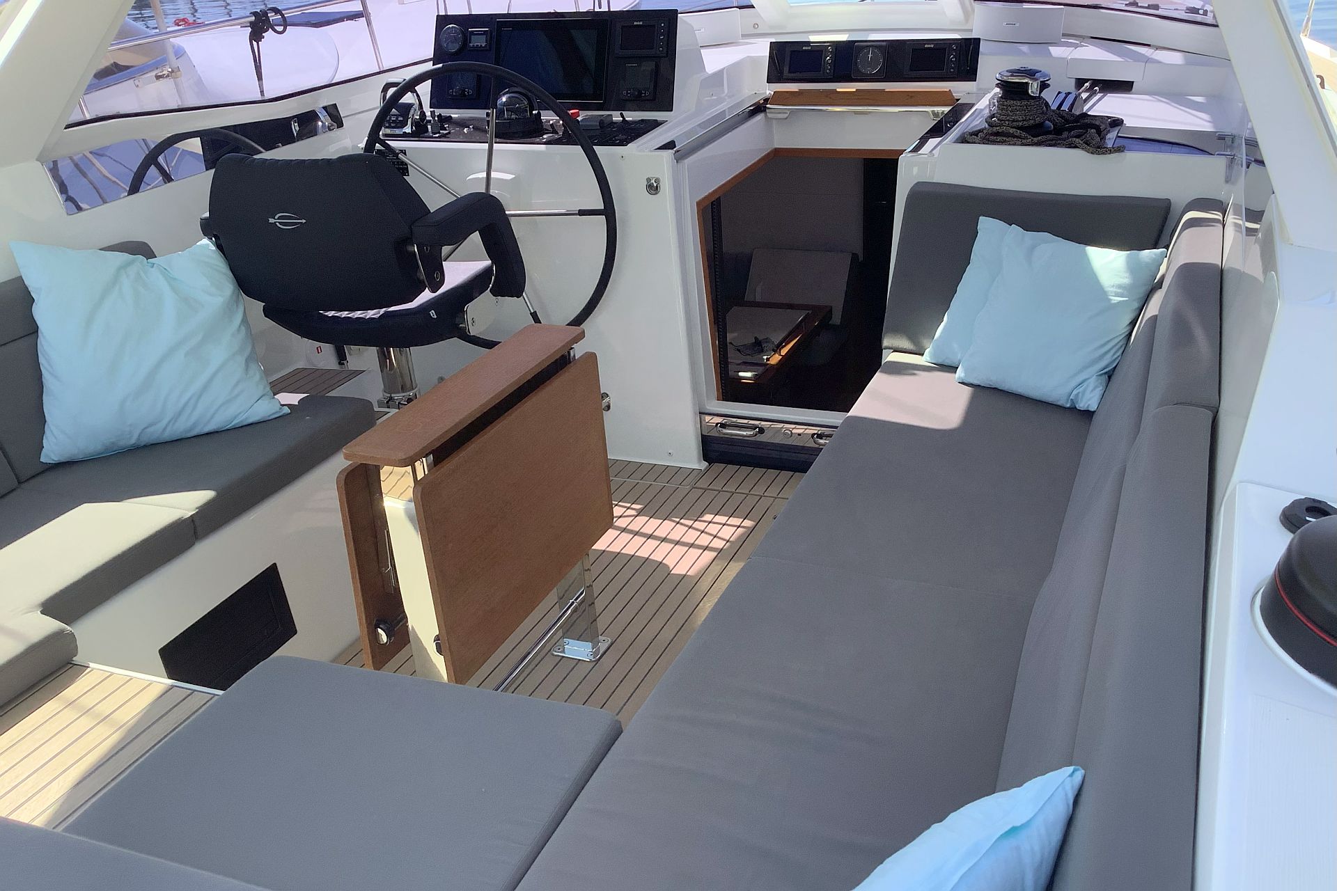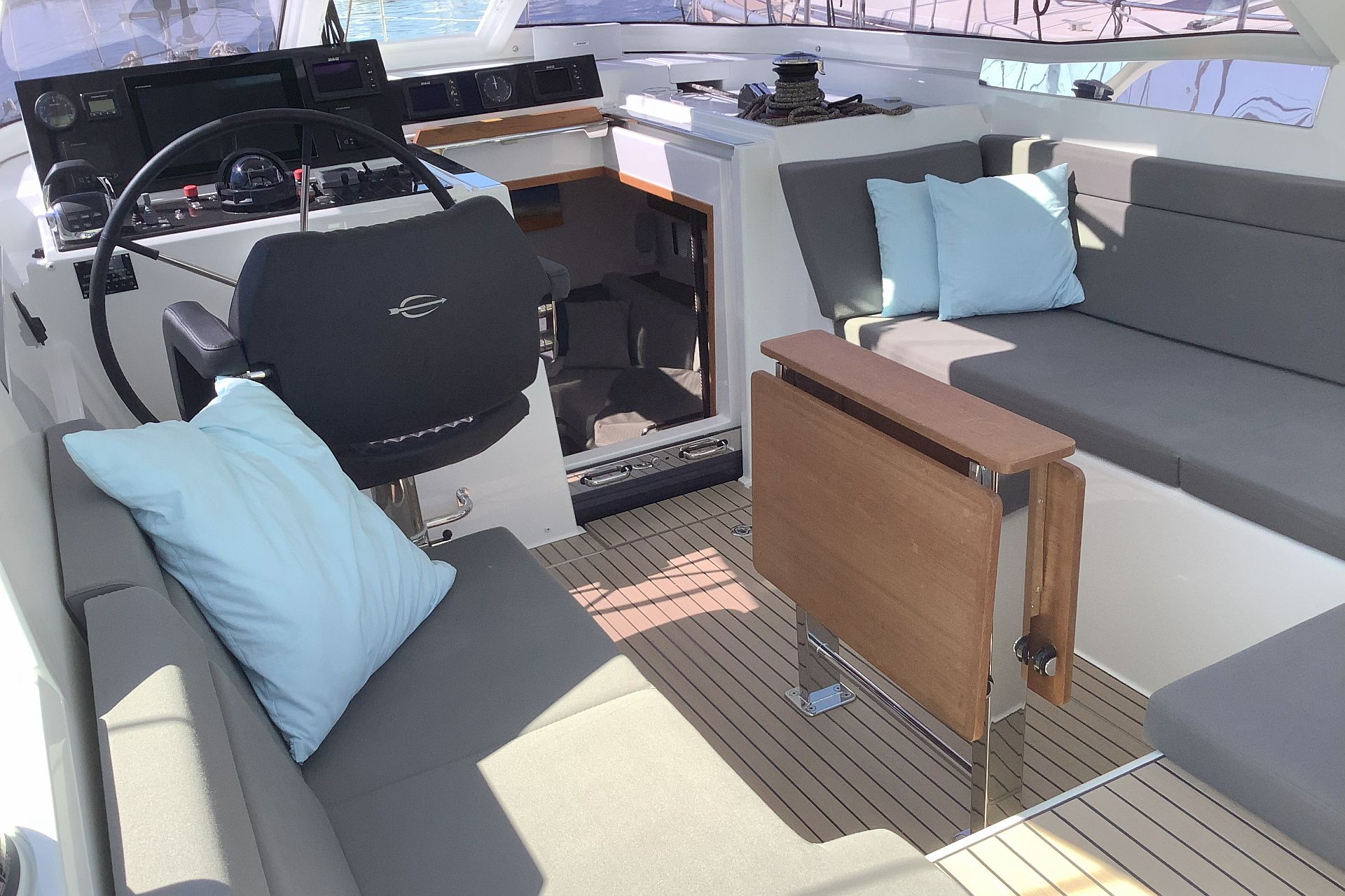- Tiefes gut geschütztes Cockpit mit Steuerstand und Steuersitz an Backbord