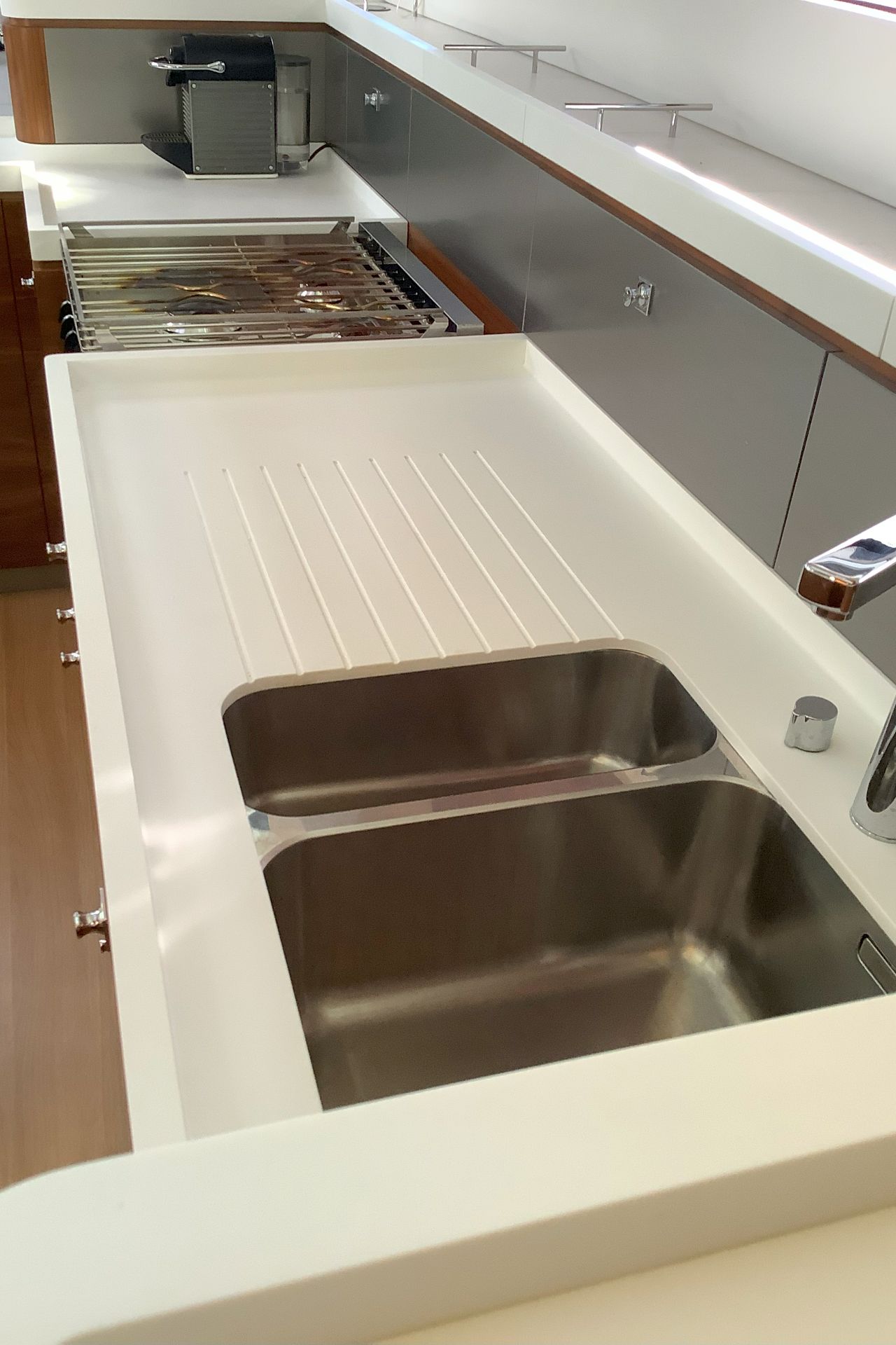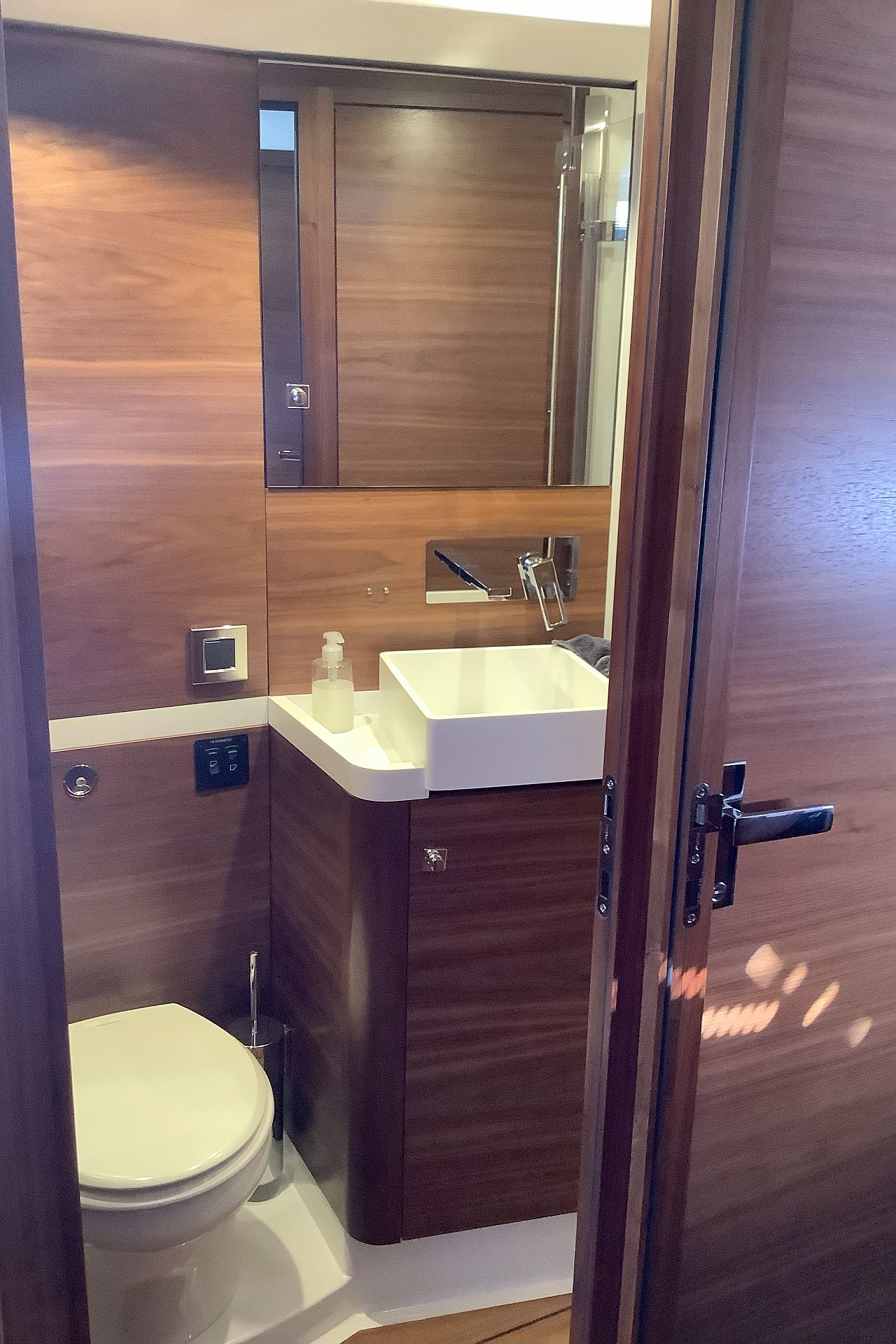 - Zwei elektrische Toiletten jeweils mit Fäkalientank 80 l mit Decksabsaugung und See-Entleerung (WC im Eignerbad kann auf Seewasser-Spülung umgeschaltet werden)