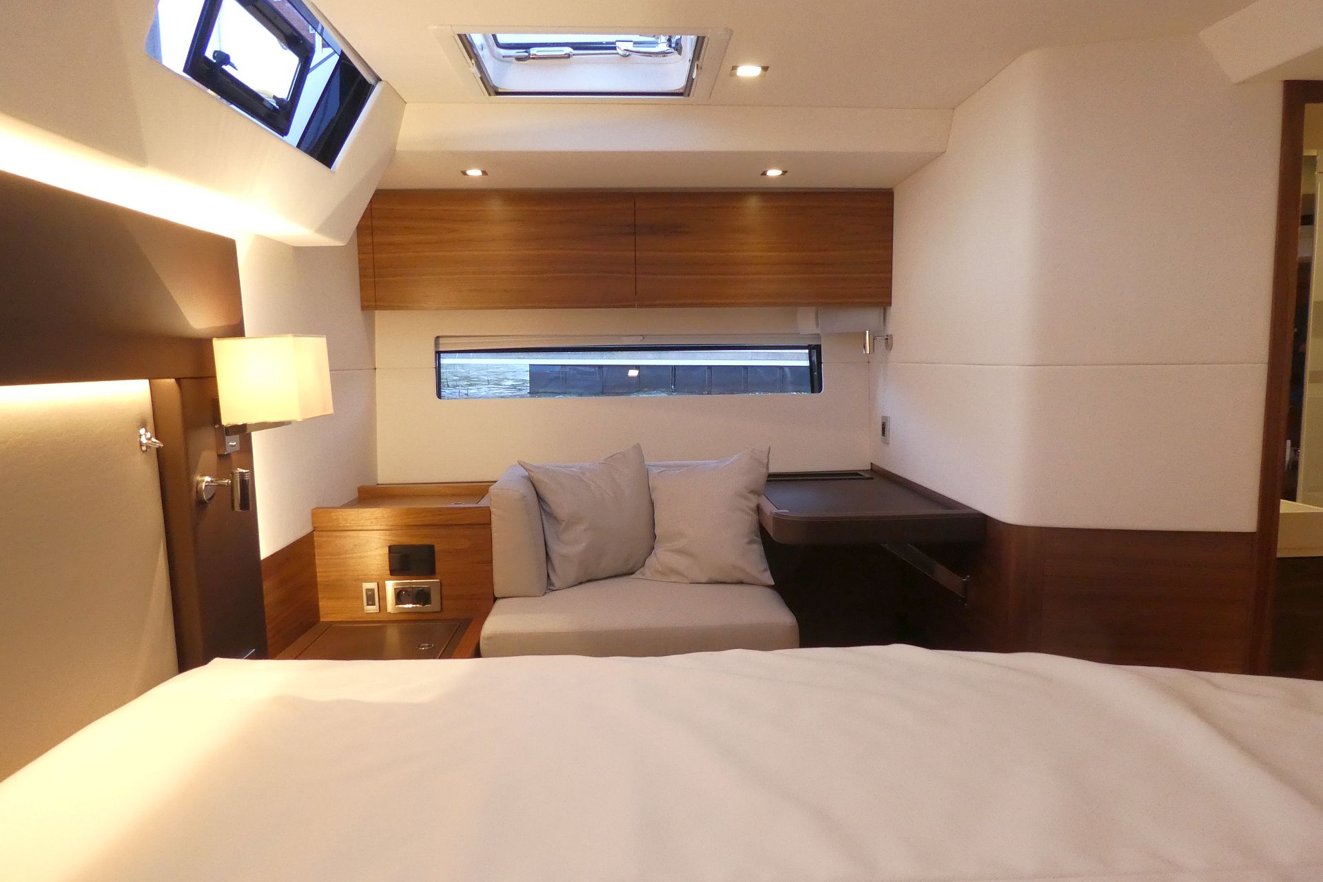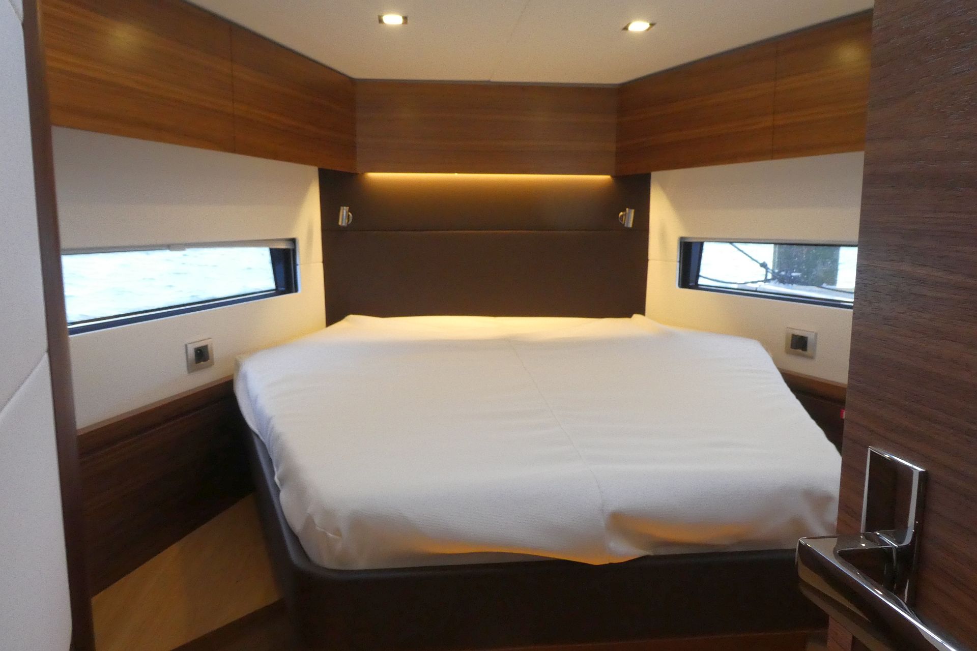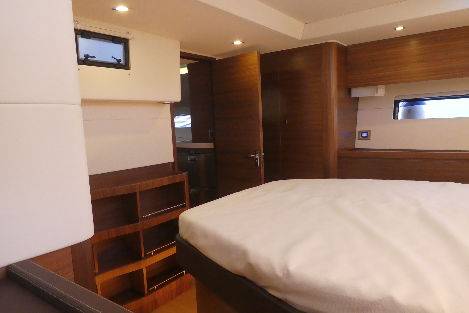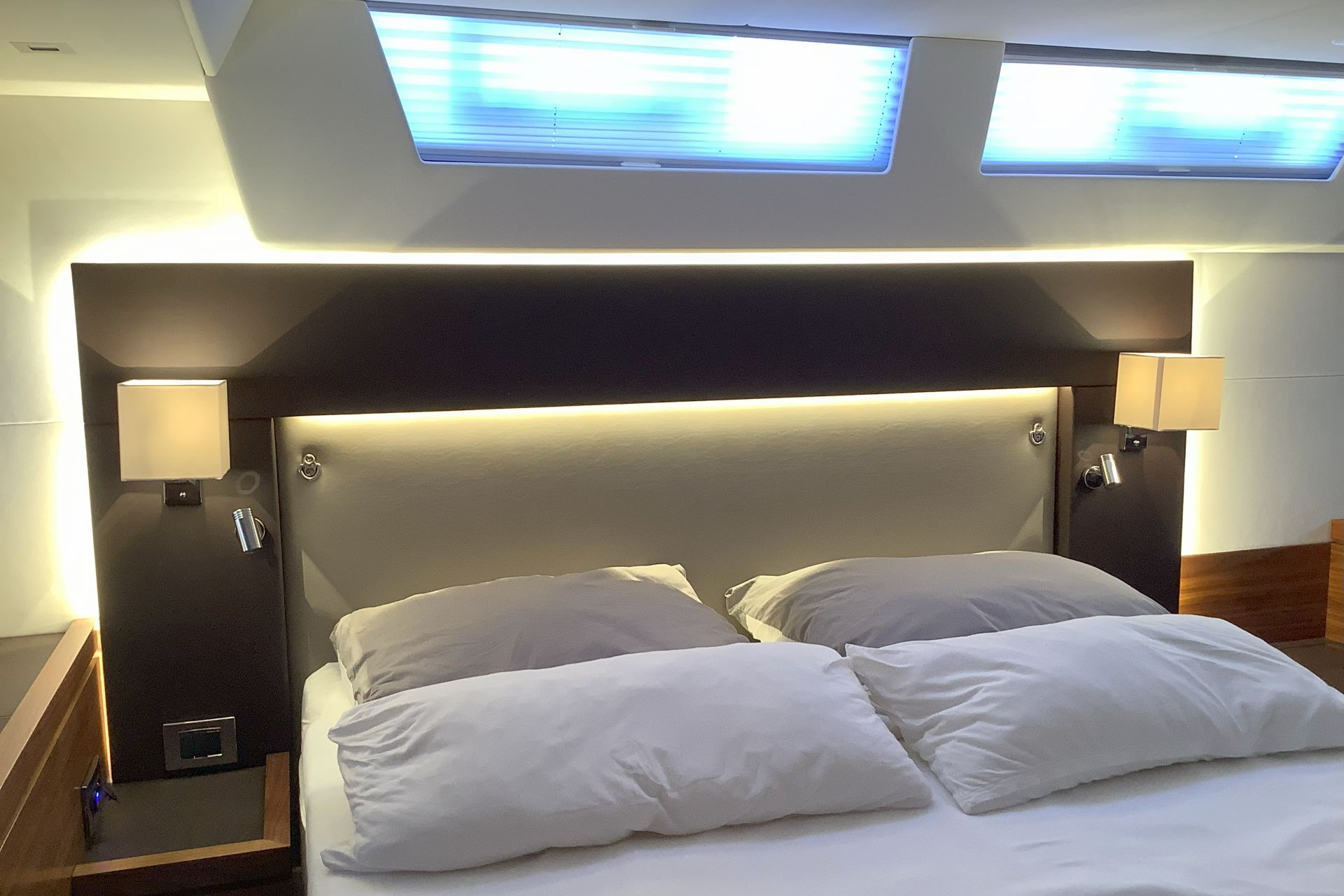- Tiefkühler unter Salonsofa - Luxuriöse, geräumige Eignerkabine im Heck mit breiter, freistehender Doppelkoje, Sessel und Schminktisch, reichlich Stauraum in Schränken, Fächern, Regalen, zusätzlichem Bücherregal und unter der Koje, die mit Gasdruckfedern hochgeklappt werden kann.