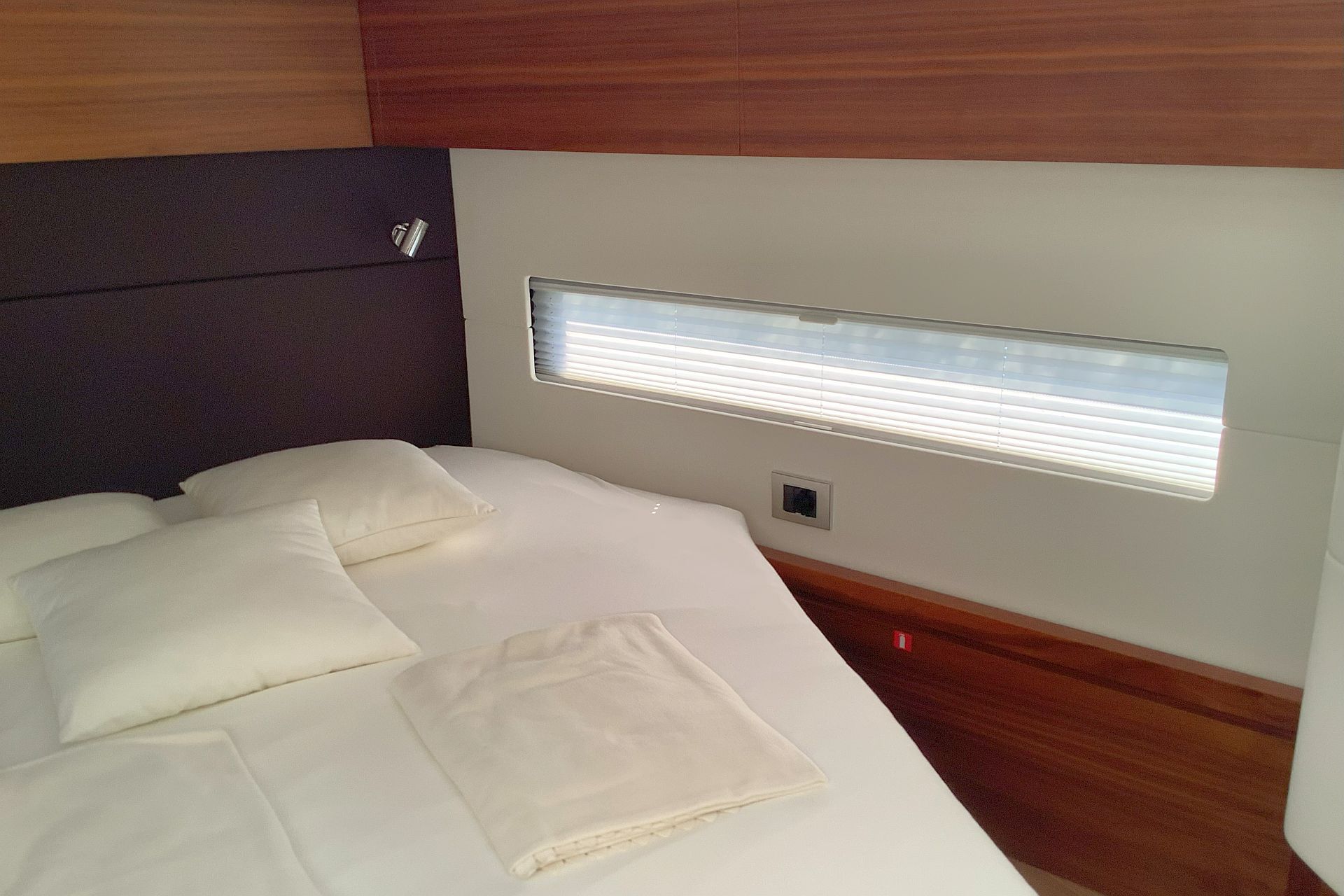 - Gästekabine im Vorschiff mit freistehender Doppelkoje