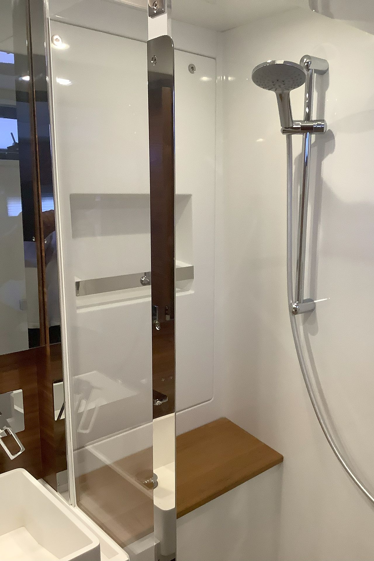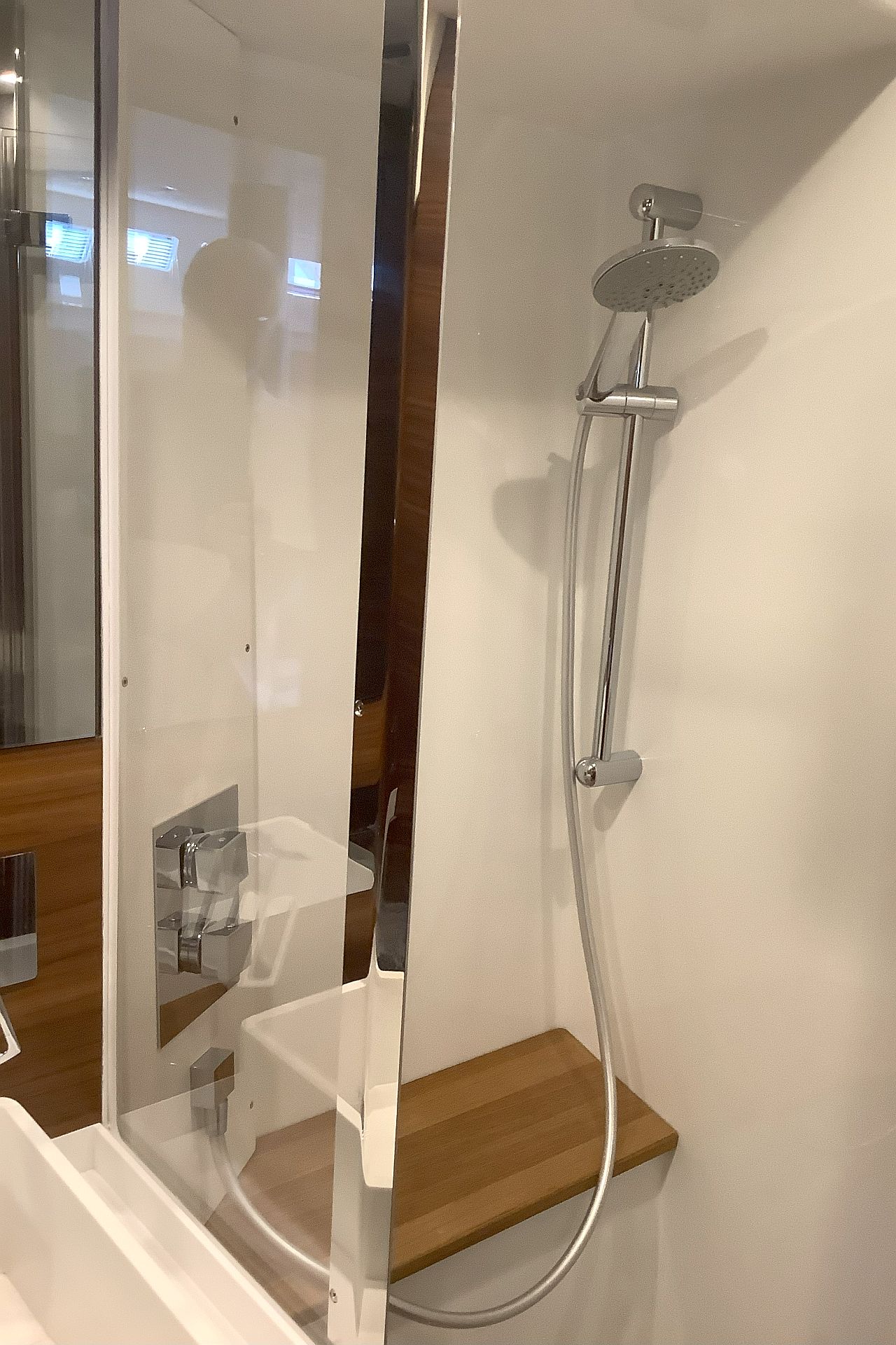 - Nasszelle mit separater Duschkabine und elektrischer Toilette an Backbord