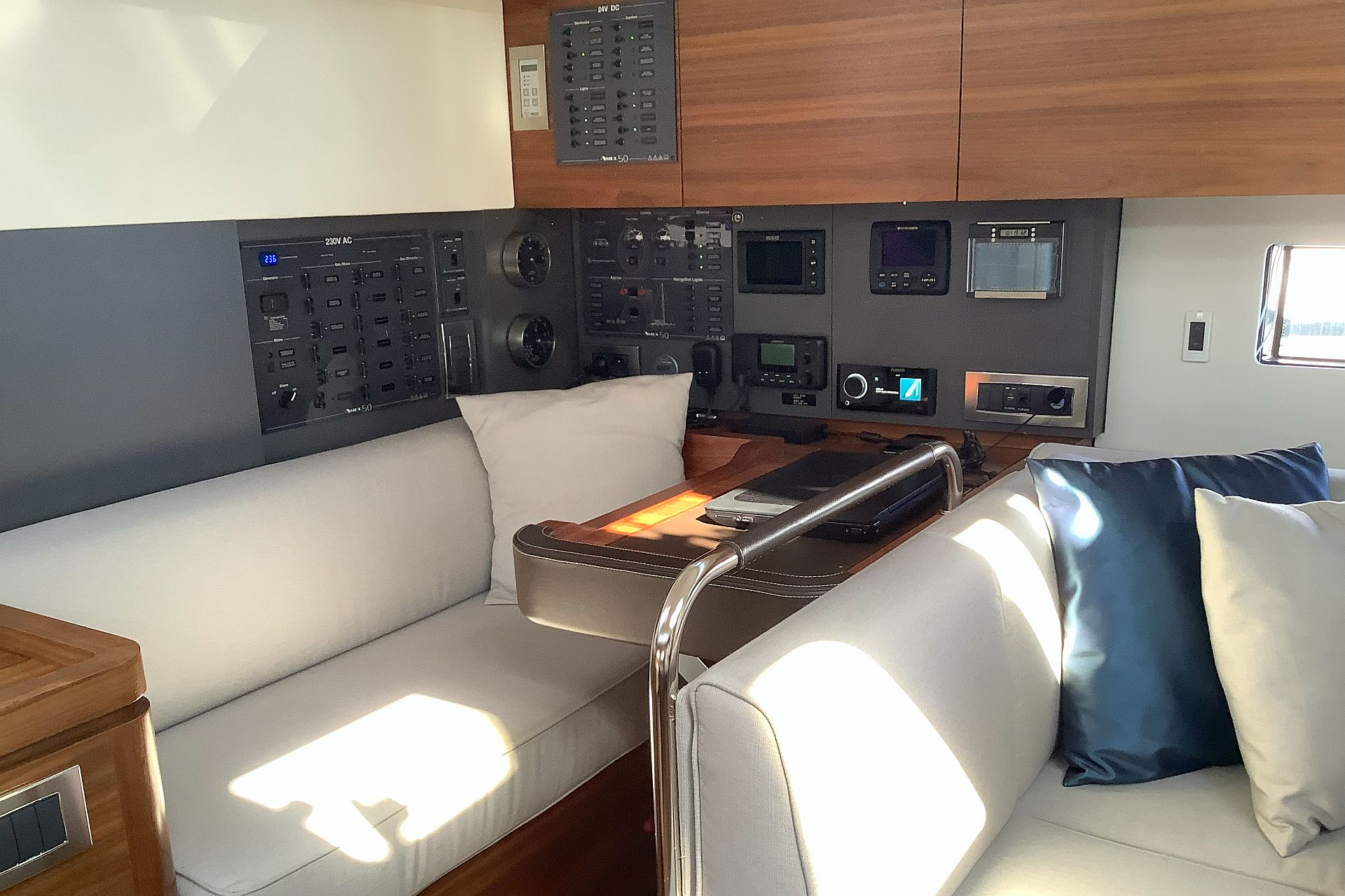 - Kartentisch in Fahrtrichtung eingebaut an Backbord achtern