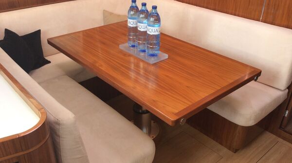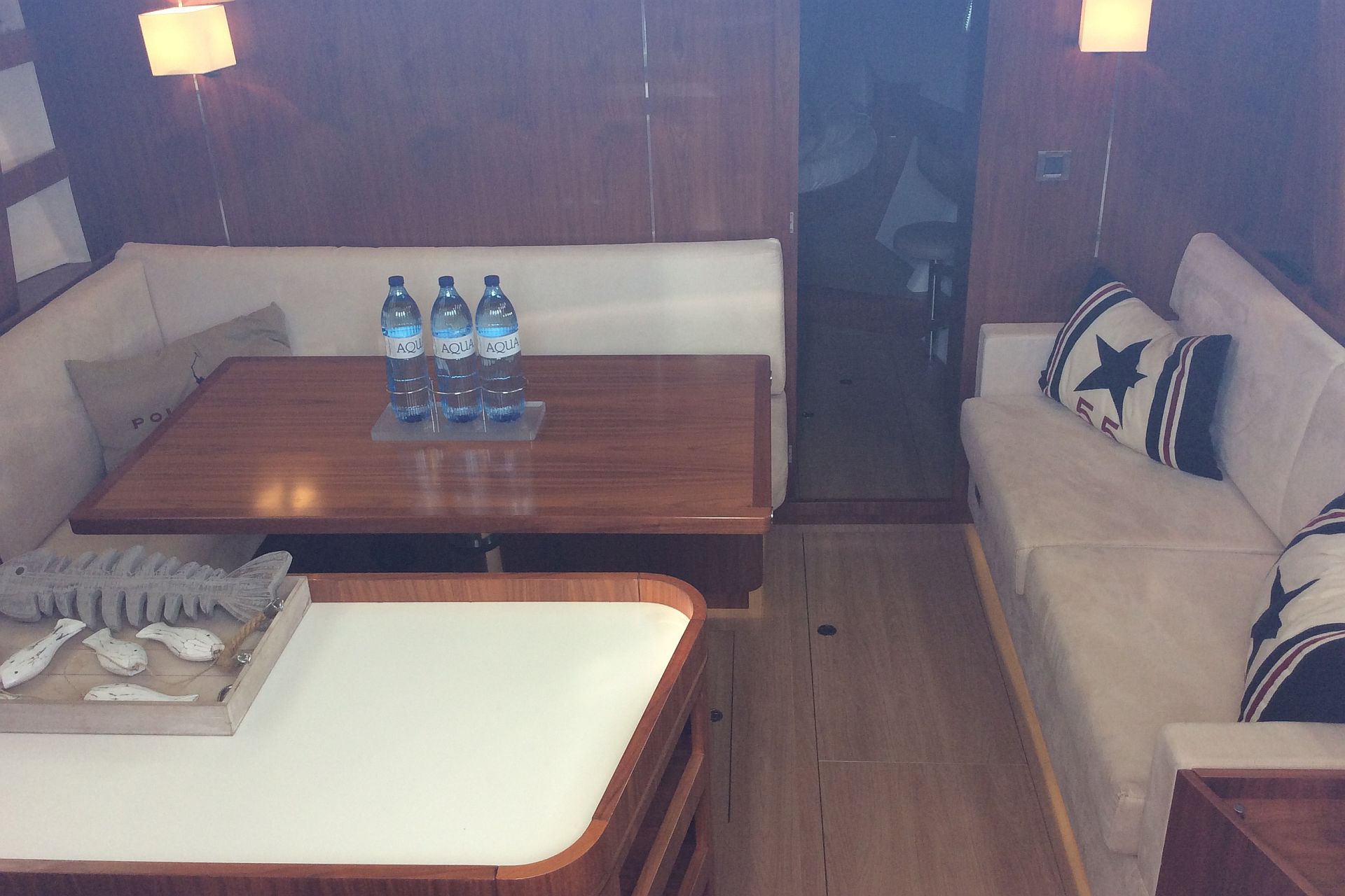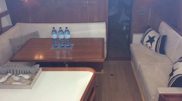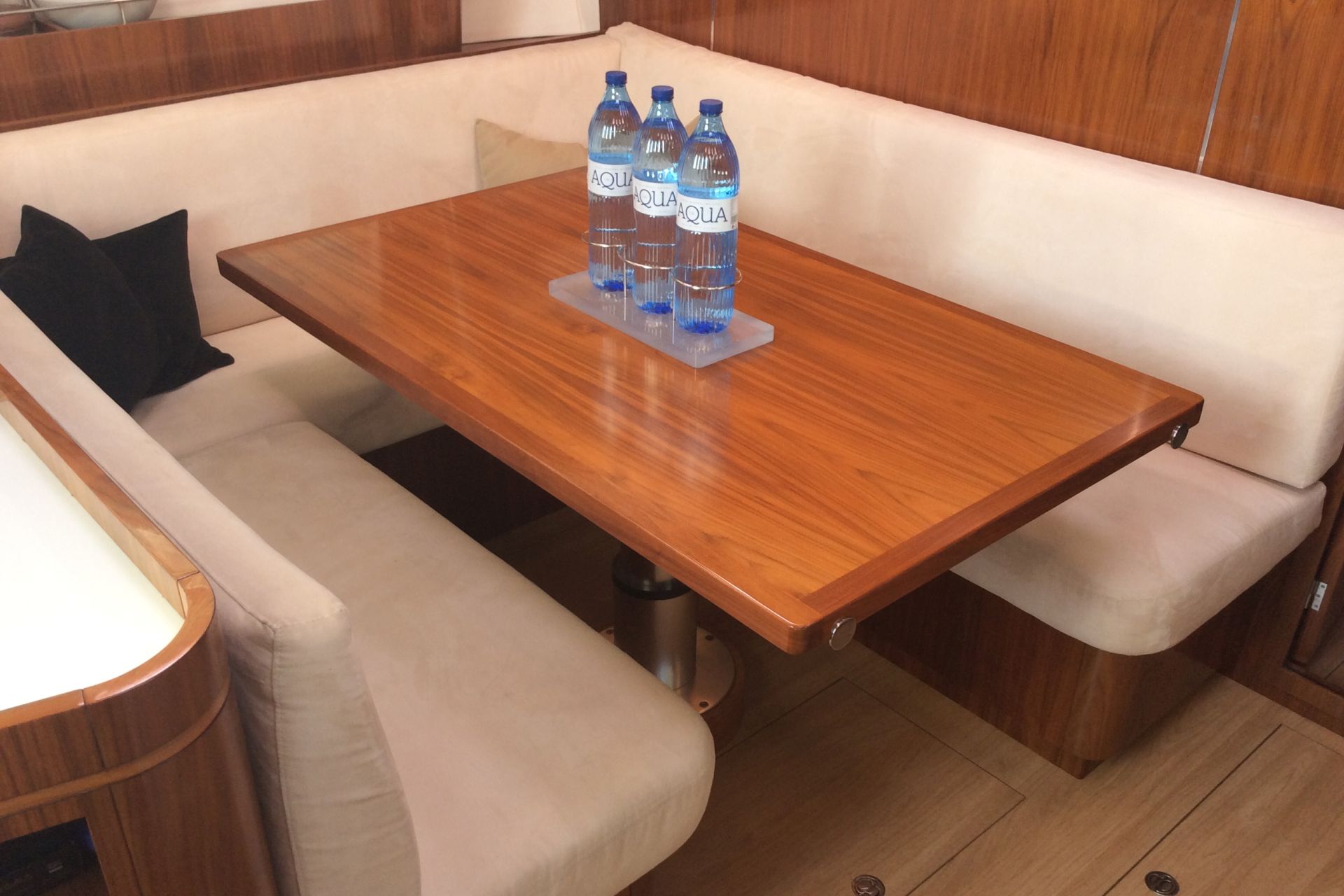 - Großzügiger Salon mit U-förmiger Sitzgruppe an Backbord um den Salontisch