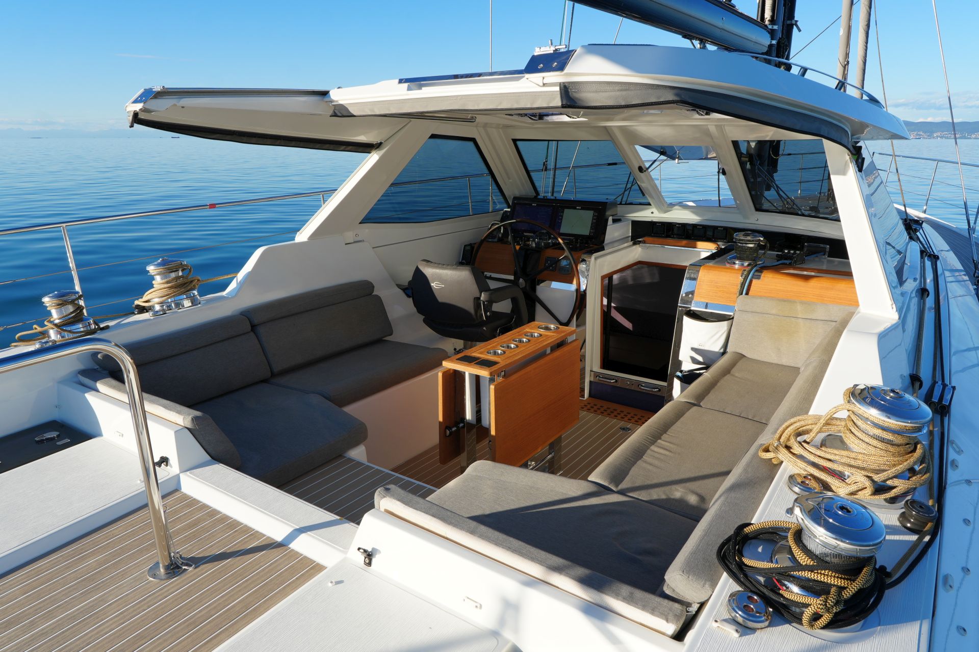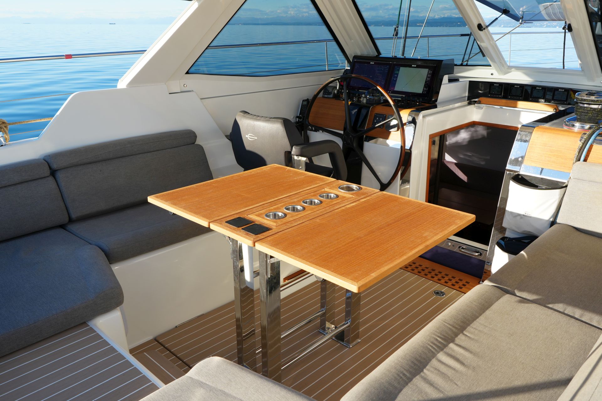 - Tiefes gut geschütztes Cockpit mit Steuerstand, Kohlefaser Steuerrad, großer Instrumentenkonsole und Steuersitz an Backbord