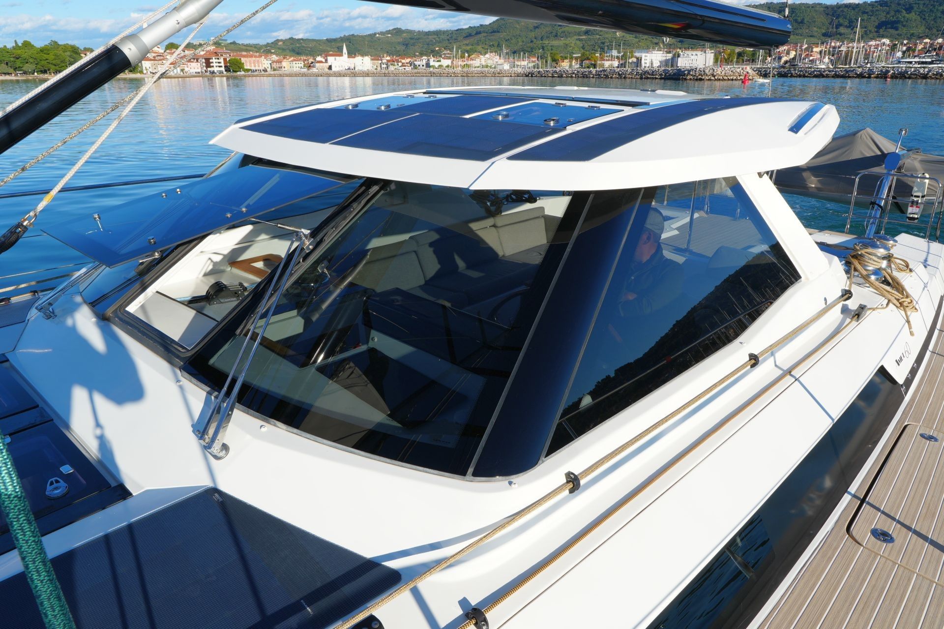 - Doghouse mit Windschutzscheibe (zentrale Scheibe zum Öffnen), zwei elektrischen Scheibenwischern, zwei Luken im Dach, Deckenbeleuchtung und achtern ausziehbarem GFK-Bimini