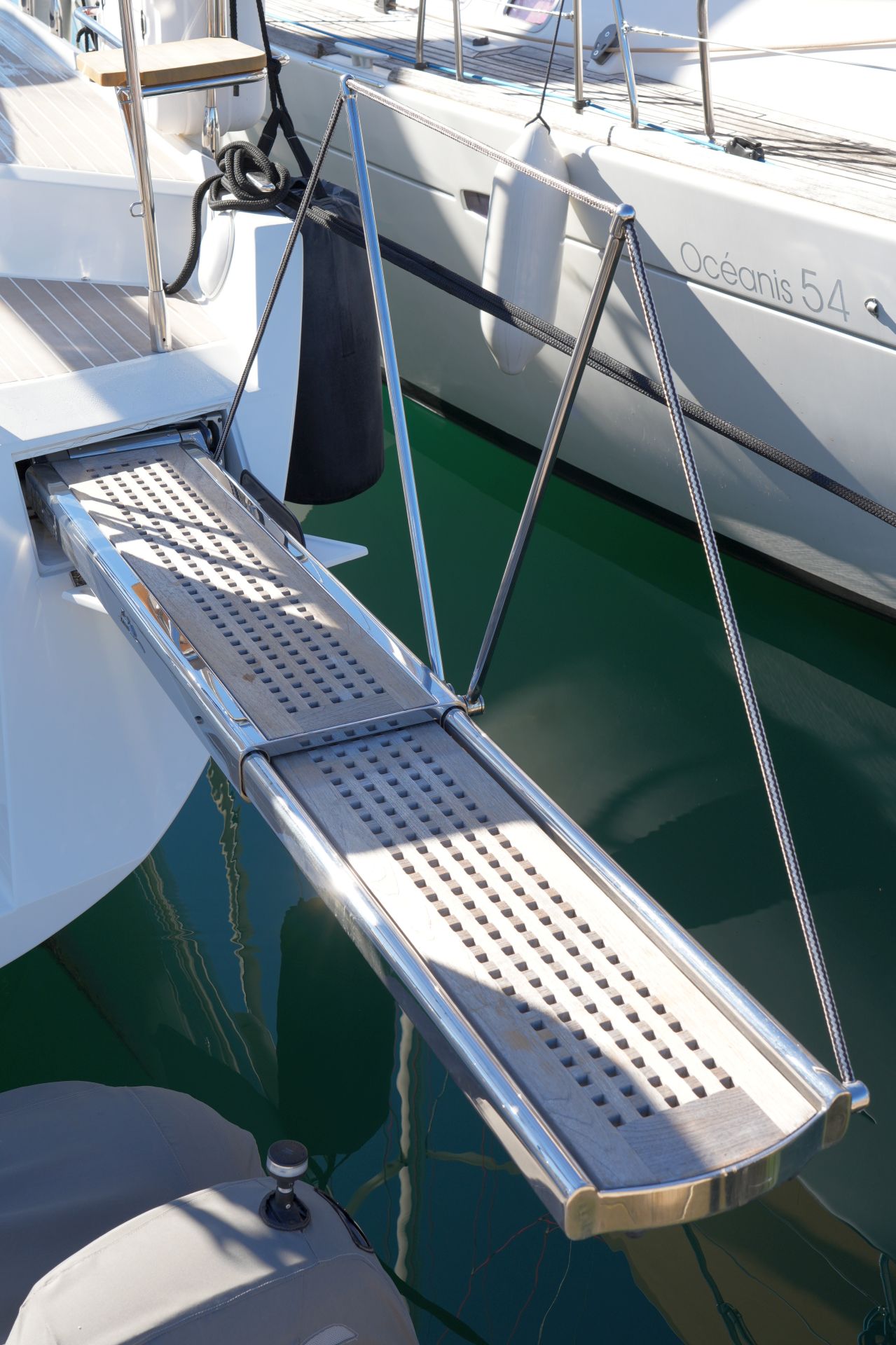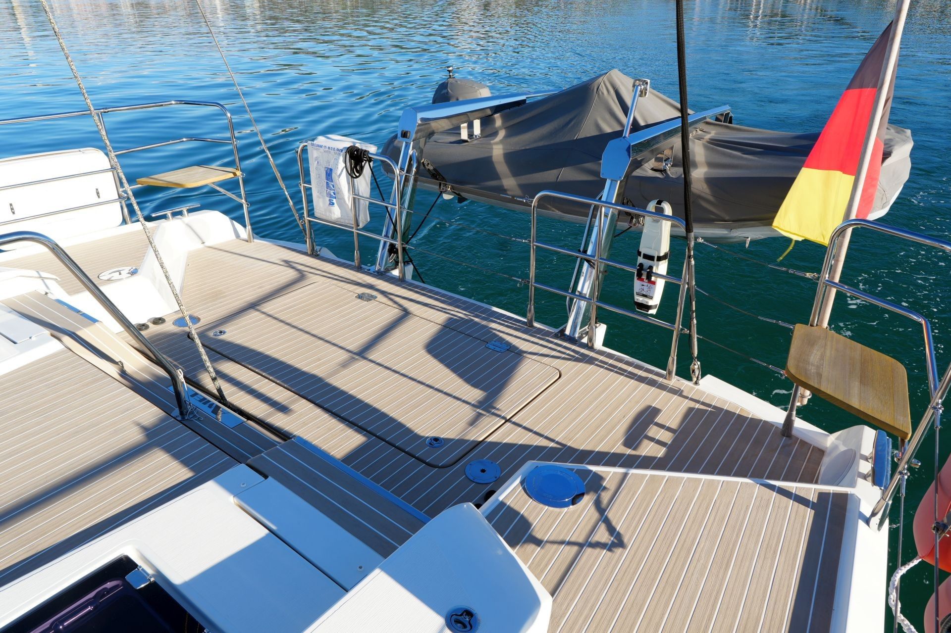 - Ab Werft modifizierter Heckspiegel mit fester Plattform, Stufen, zusätzlichen Festmacherklampen und integrierter Badeleiter