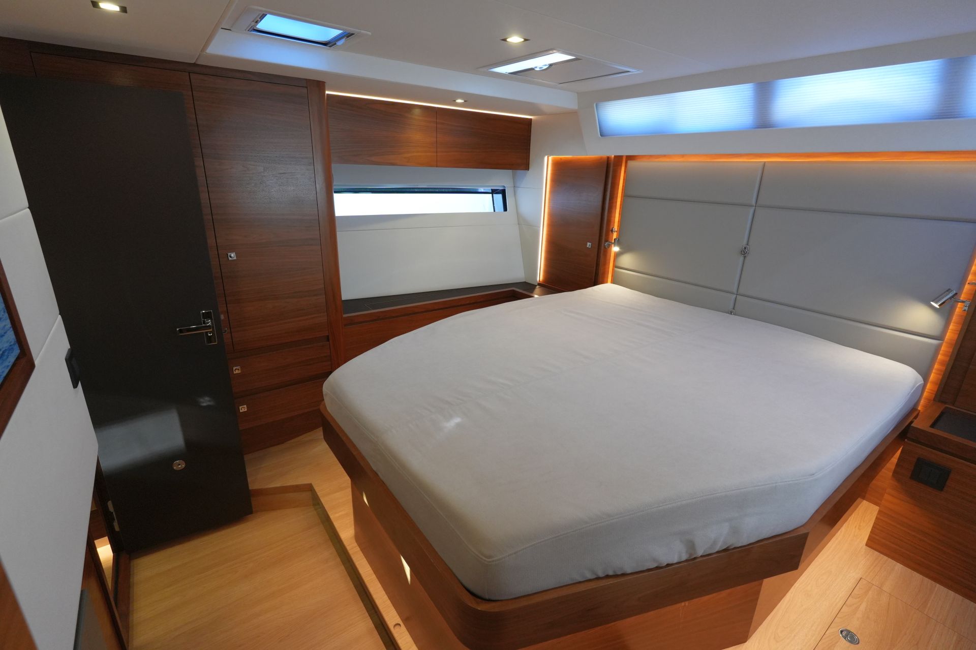 - Exklusiver, moderner und aufwendig ausgeführter Ausbau in seidenmatt lackierter Amerikanischer Walnuß mit weiß bespannten Paneelen, laminierten Bodenbrettern und zahlreichen Lederapplikationen