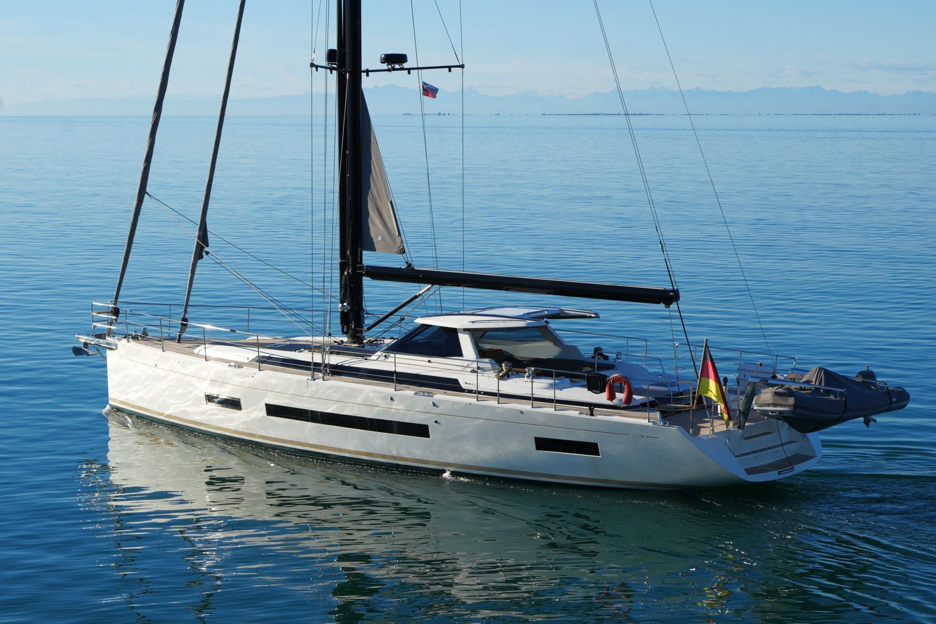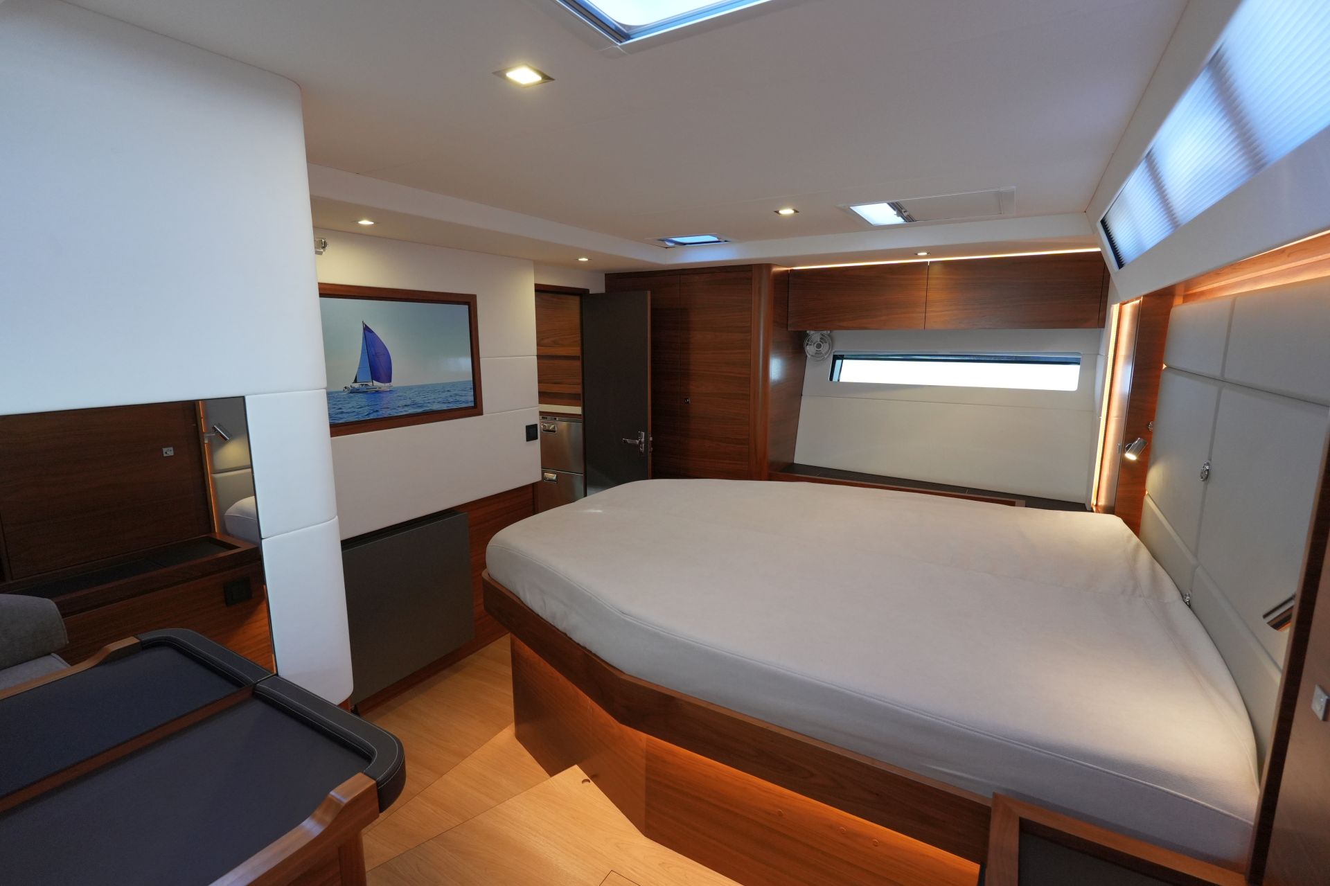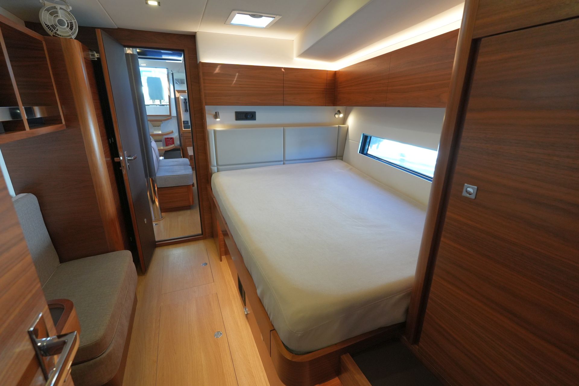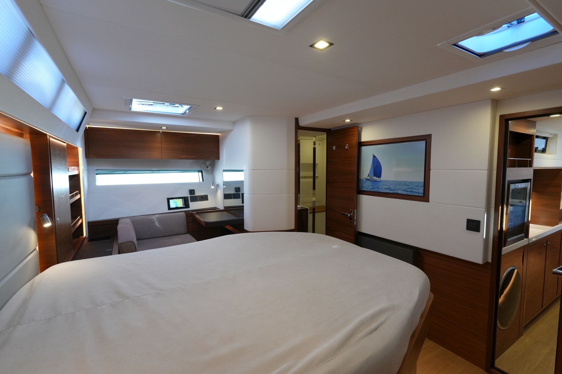 - Elektrisches Induktionskochfeld MIELE (4 Flammen) - Luxuriöse, geräumige Eignerkabine im Heck mit breiter, frei stehender Doppelkoje (inkl. Lattenroste und Leesegel), Sessel und Schminktisch, Safe, reichlich Stauraum in Schränken, Fächern, Regalen und unter der Koje, die mit Gasdruckfedern hochgeklappt werden kann.