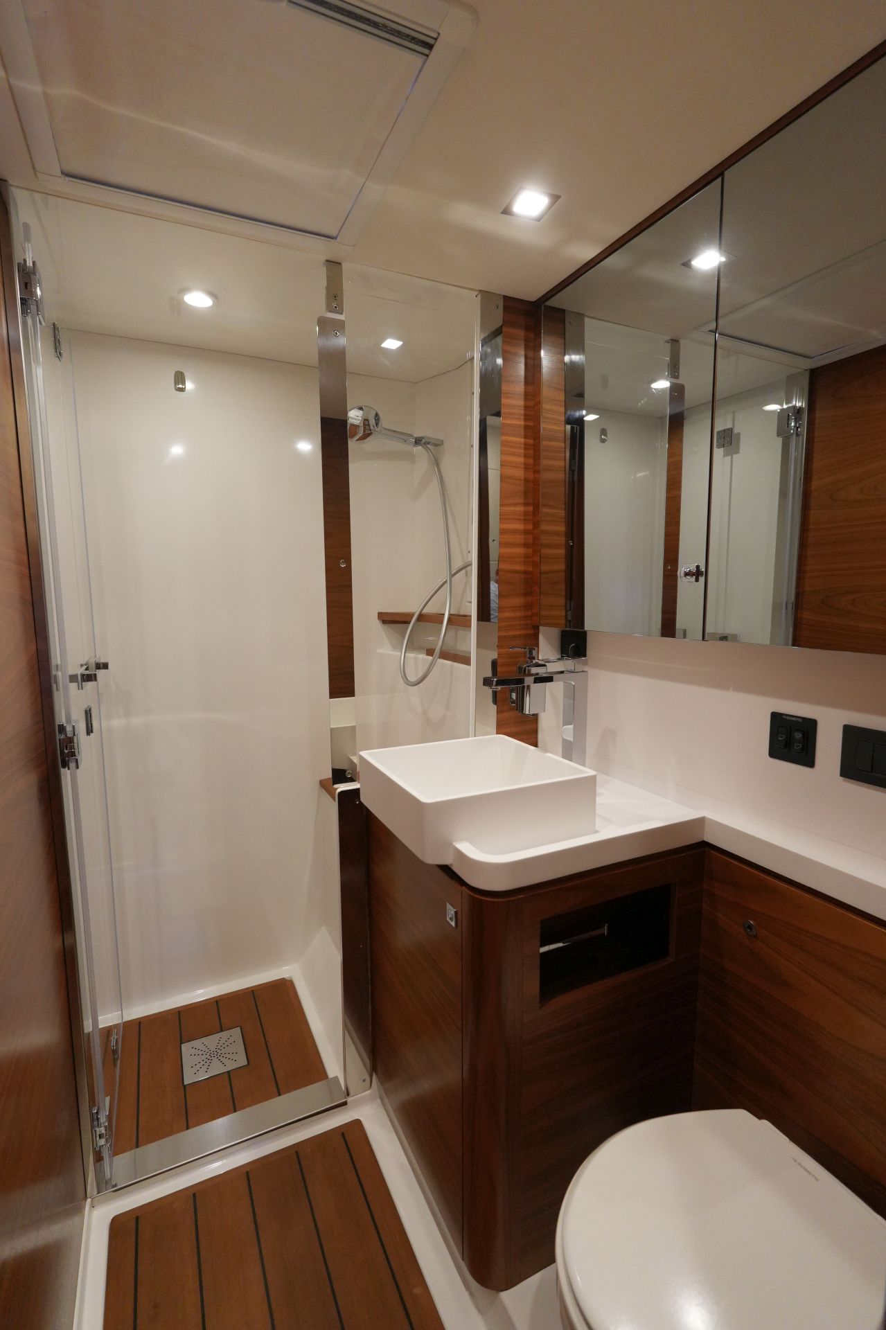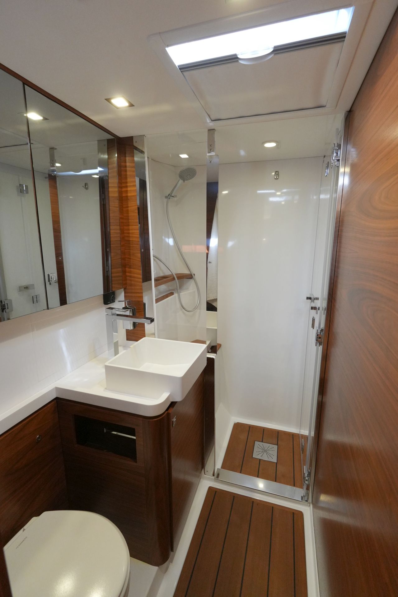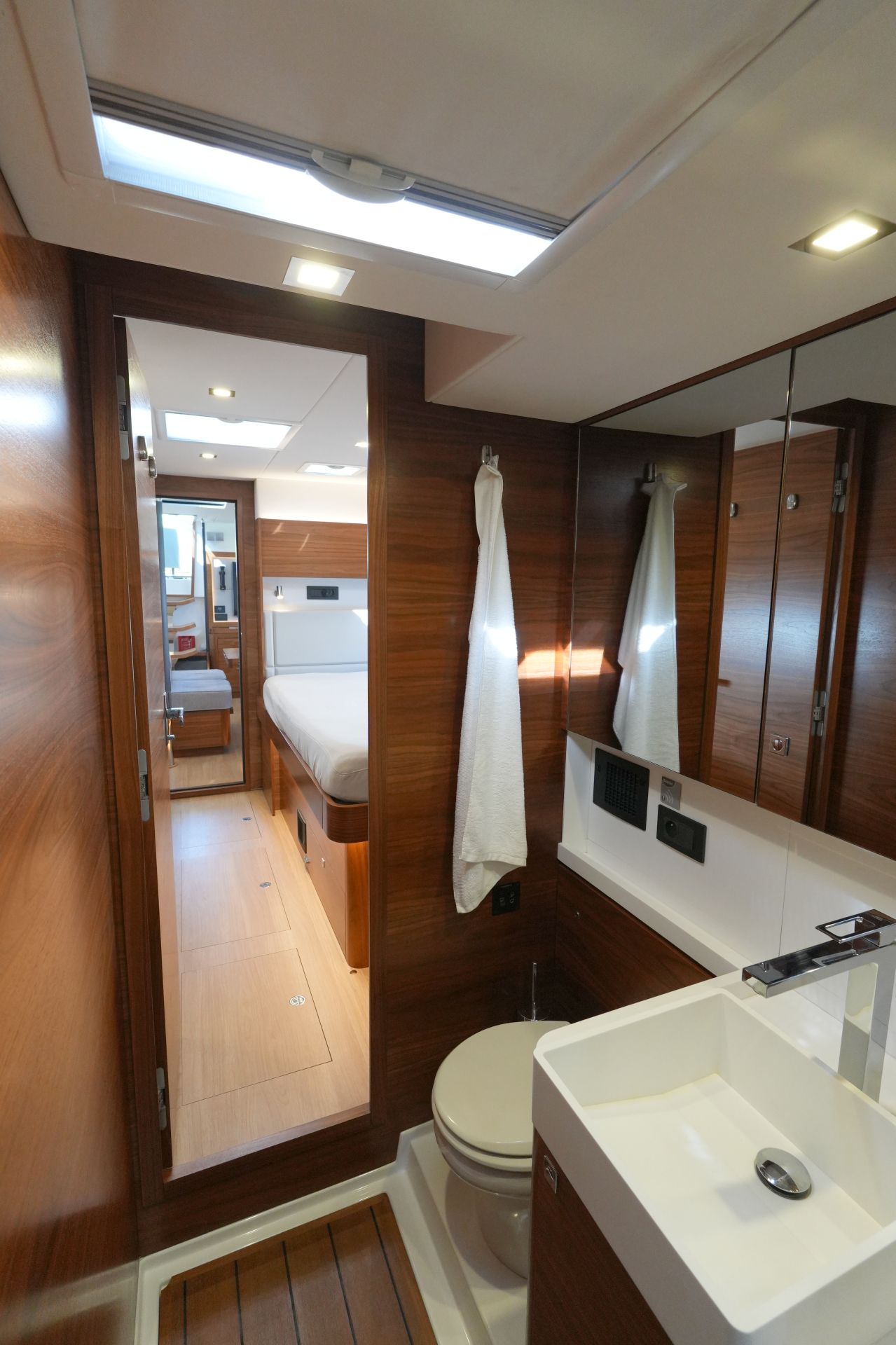 - Zwei symmetrische Nasszellen für die Gästekabinen mit Waschtisch, separater Duschkabine und elektrischer Toilette im Vorschiff