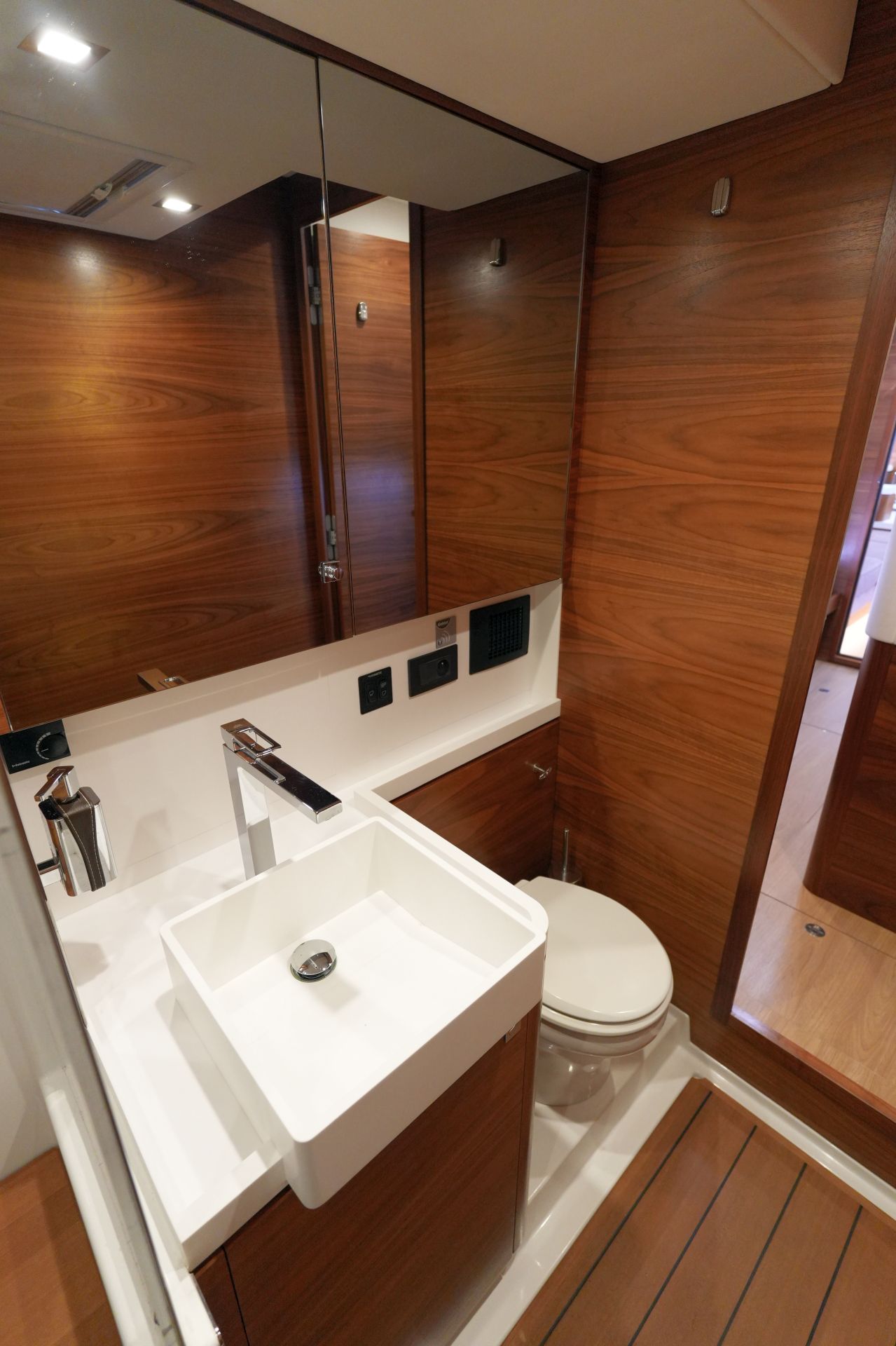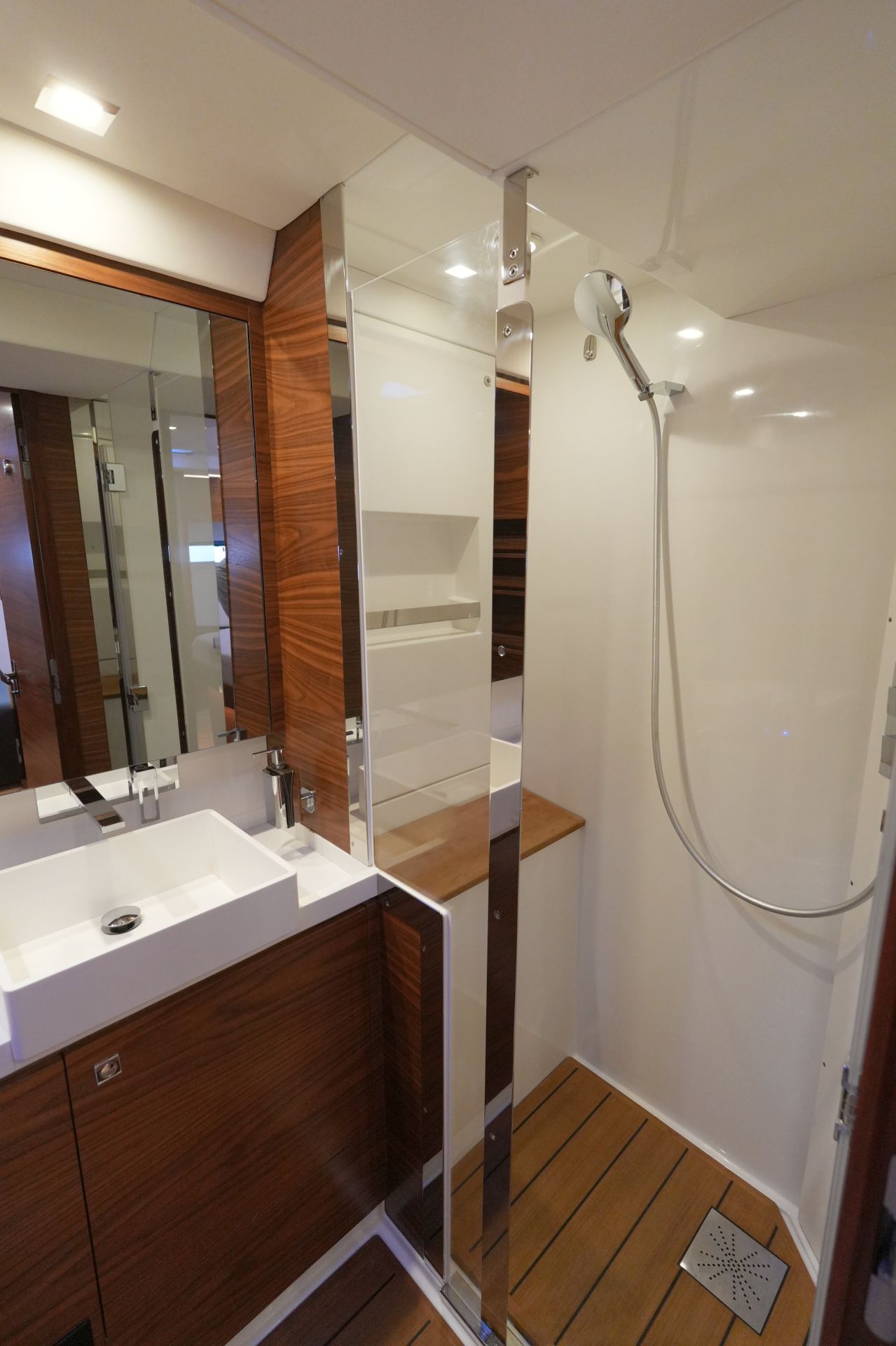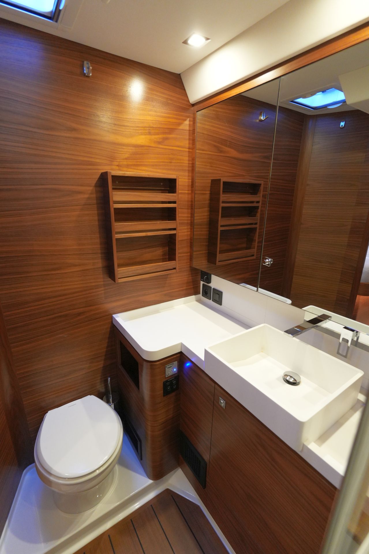 - Zwei symmetrische Nasszellen für die Gästekabinen mit Waschtisch, separater Duschkabine und elektrischer Toilette im Vorschiff