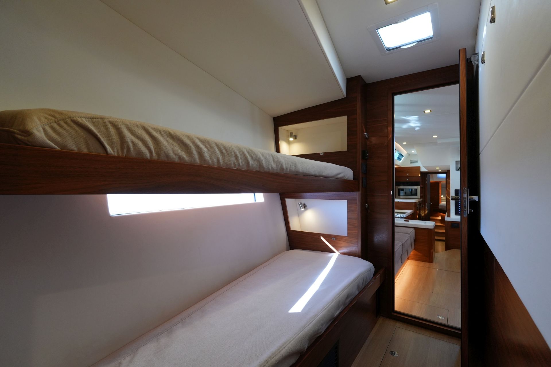 - Steuerbord-Vorschiffskabine mit zwei Stockbetten (das obere Bett kann hochgeklappt werden) und Schrank