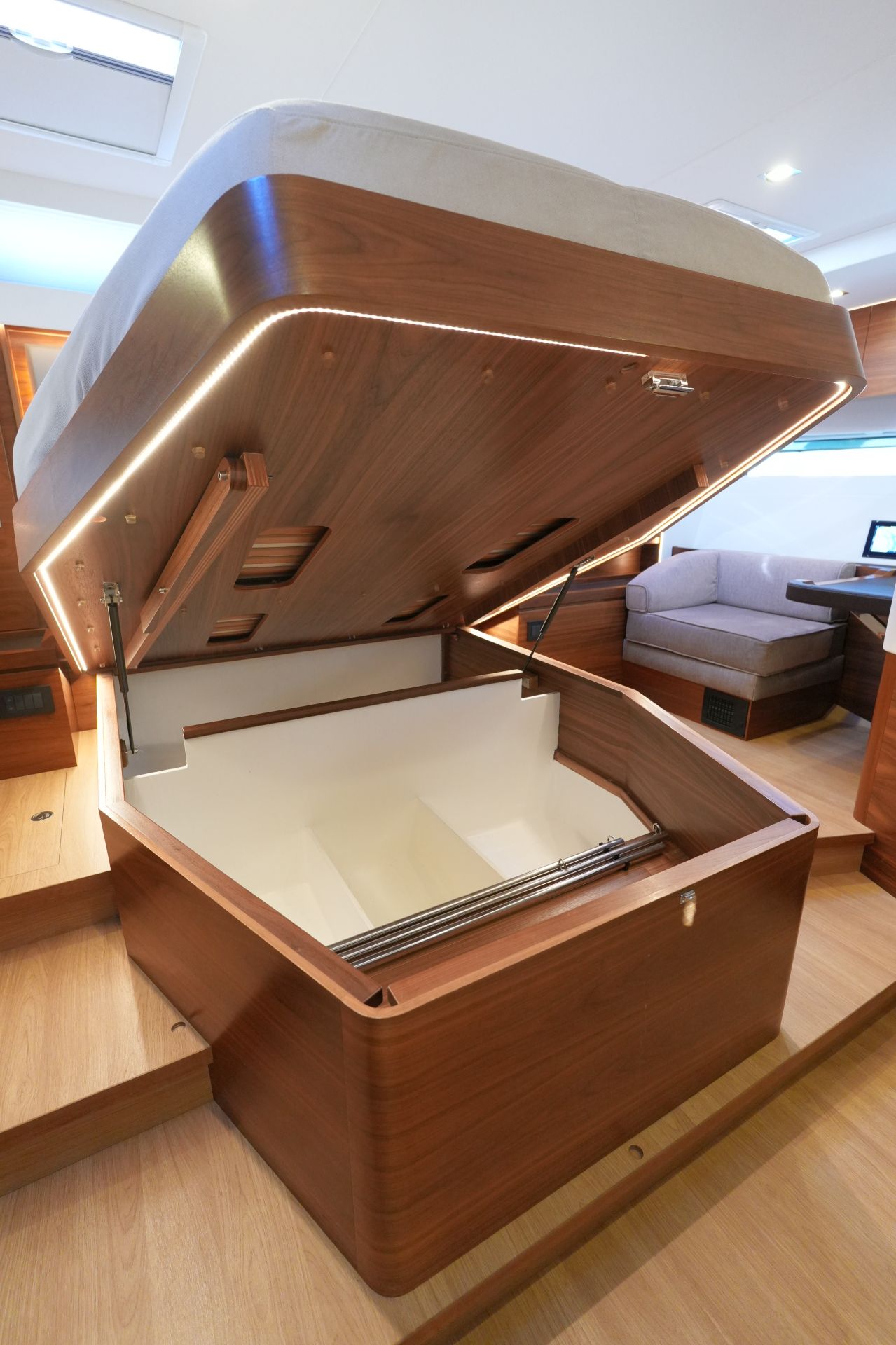- Der Salontisch ist elektrisch absenkbar und kann zu einer zusätzlichen Koje umgebaut werden