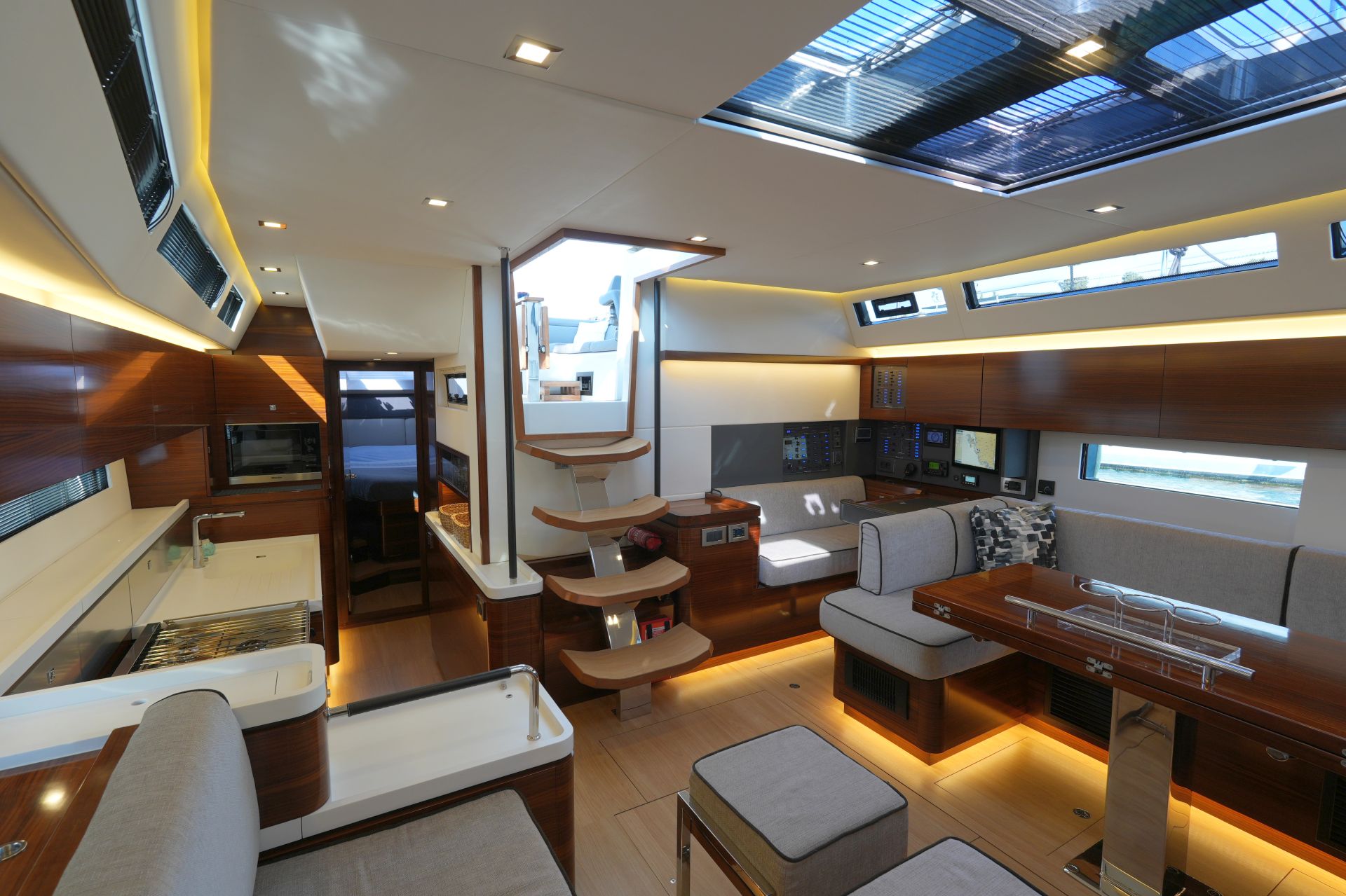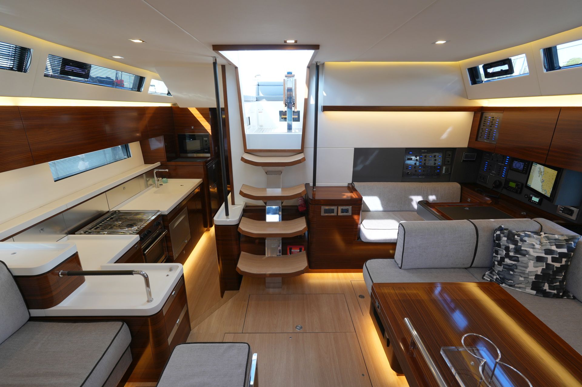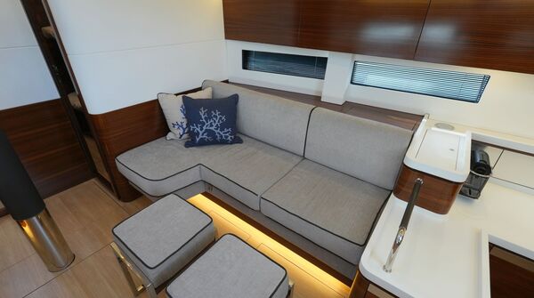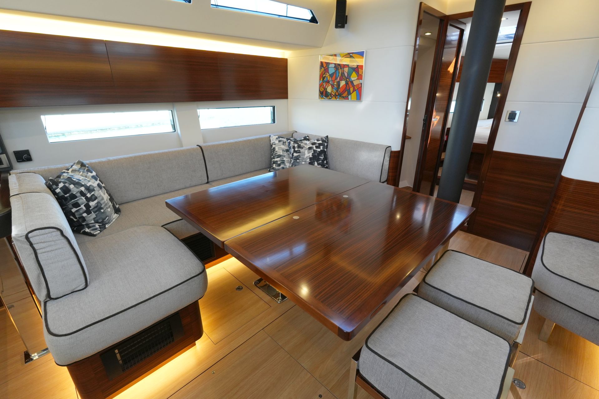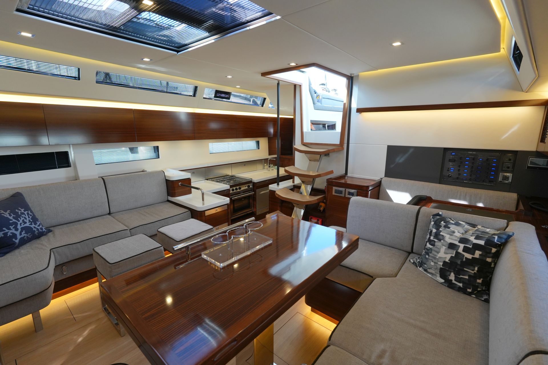 - Großzügiger, geräumiger Salon mit U-förmiger Sitzgruppe an Backbord