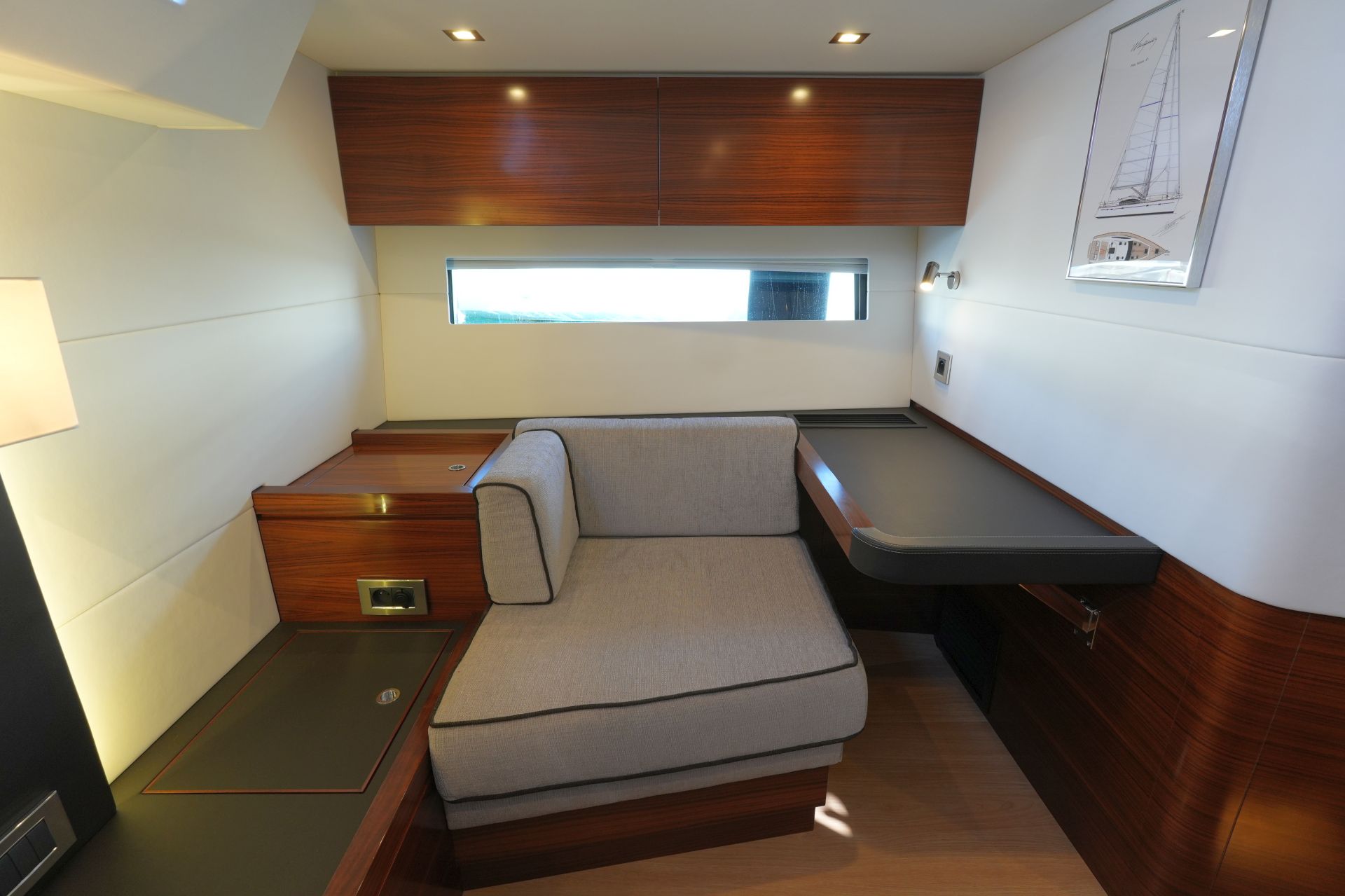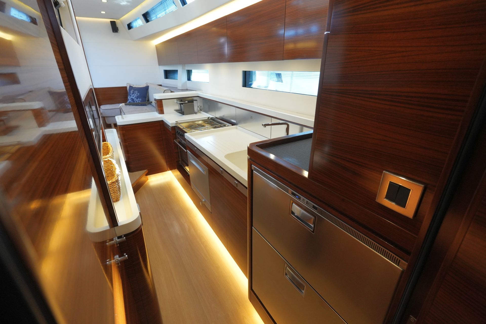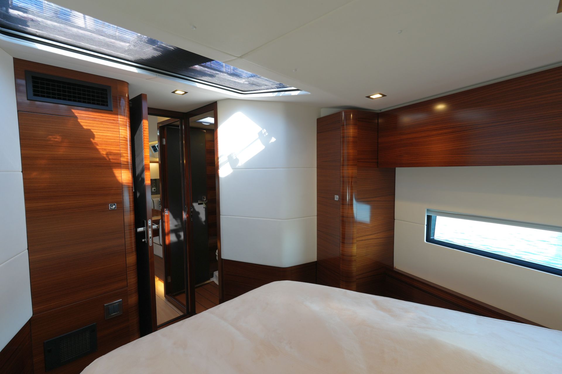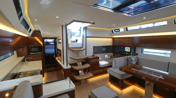 - AMEL 50 mit exklusivem, aufwendig ausgeführtem Ausbau in Indischem Palisander (Option) mit weiß bespannten Panelen, laminierten Bodenbrettern und zahlreichen Lederapplikationen