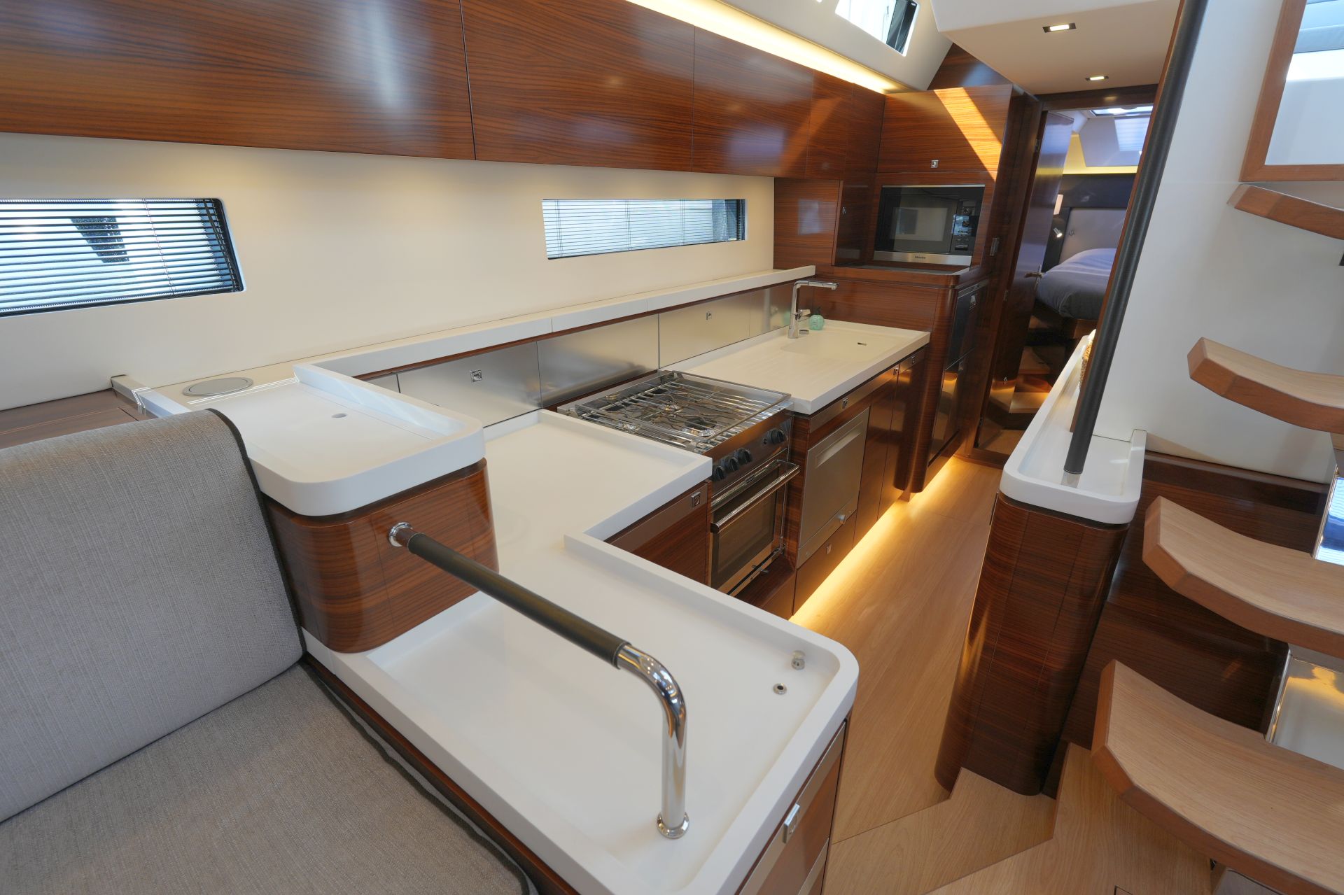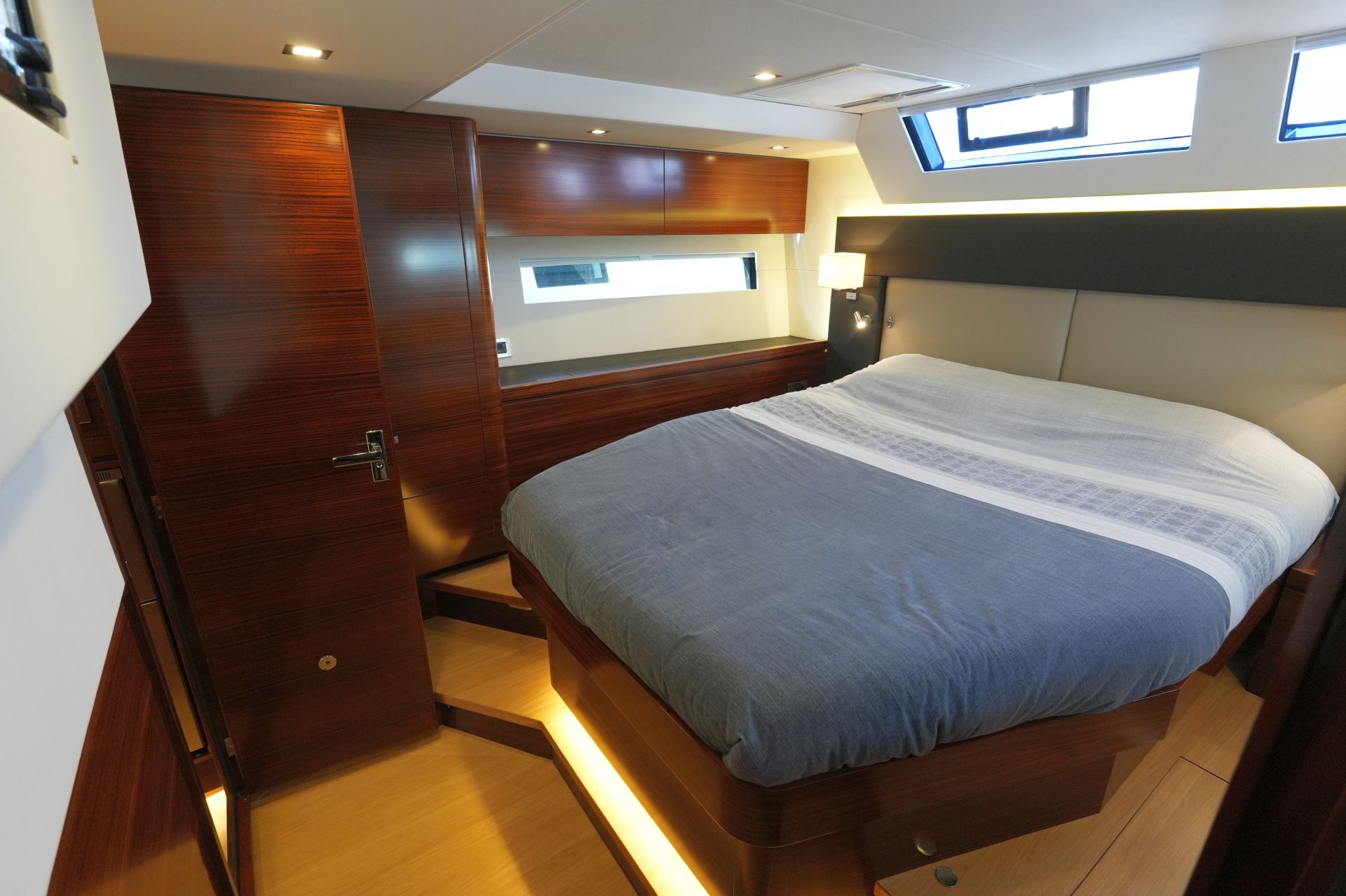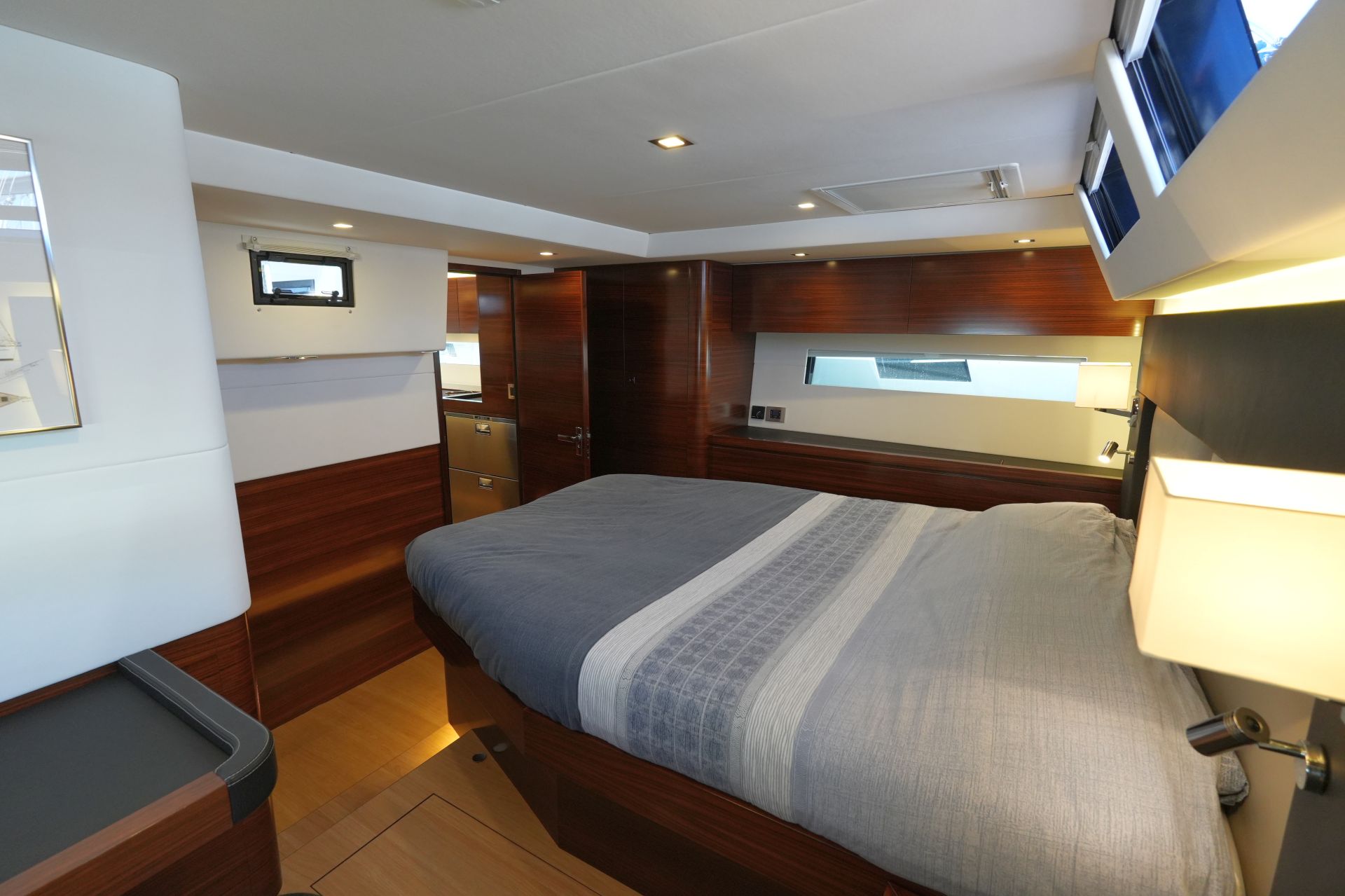 - AMEL 50 mit exklusivem, aufwendig ausgeführtem Ausbau in Indischem Palisander (Option) mit weiß bespannten Panelen, laminierten Bodenbrettern und zahlreichen Lederapplikationen