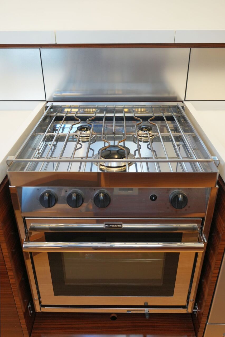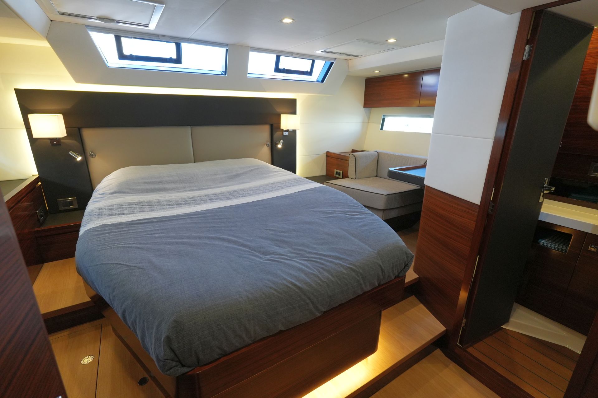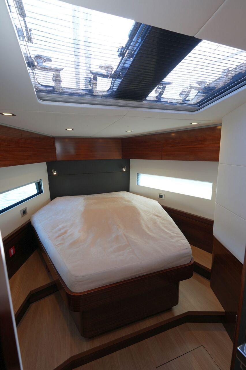 - Nesspresso-Maschine - Luxuriöse, geräumige Eignerkabine im Heck mit breiter, freistehender Doppelkoje, Sessel und Schminktisch, reichlich Stauraum in Schränken, Fächern, Regalen und unter der Koje, die mit Gasdruckfedern hochgeklappt werden kann