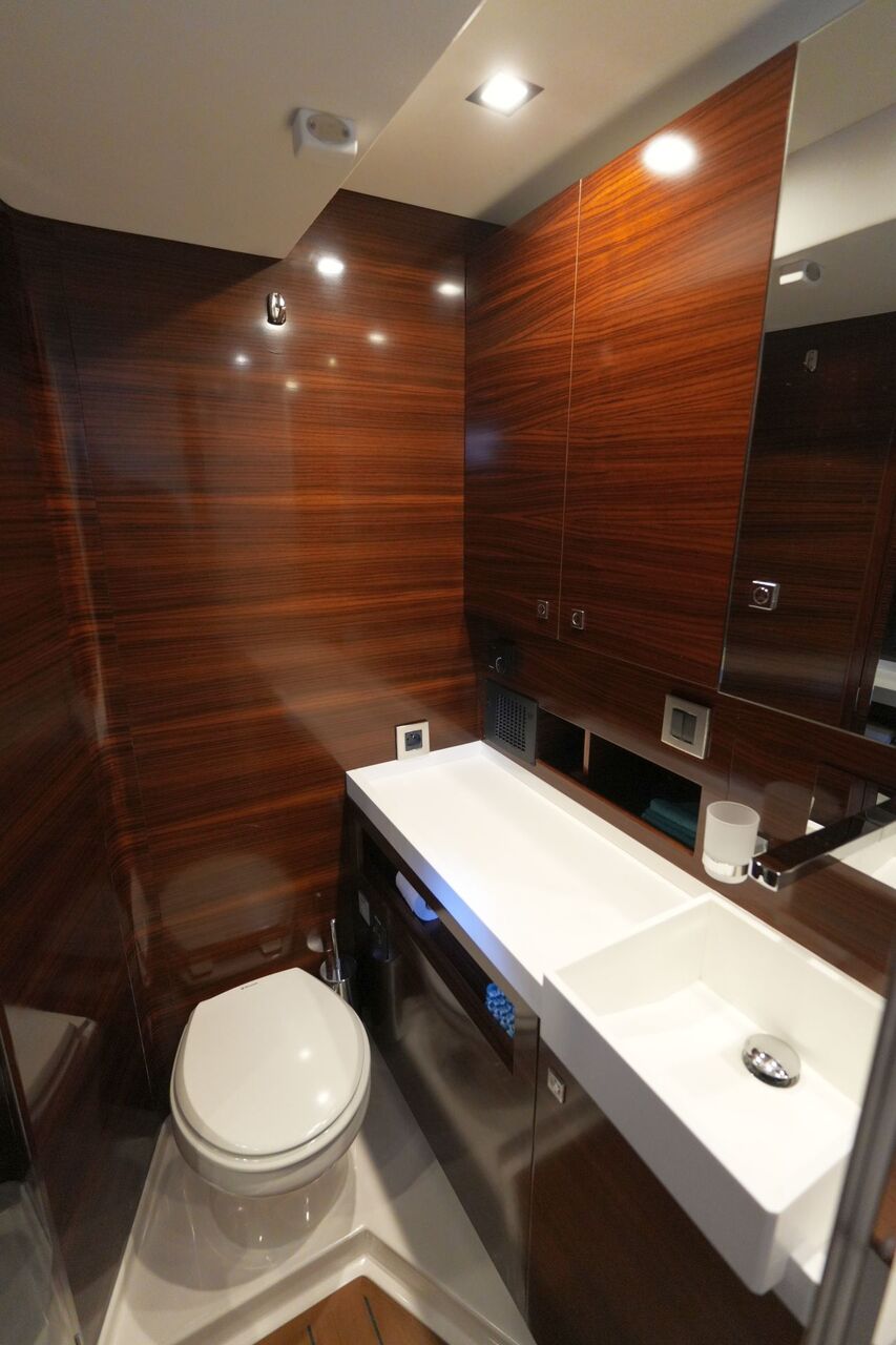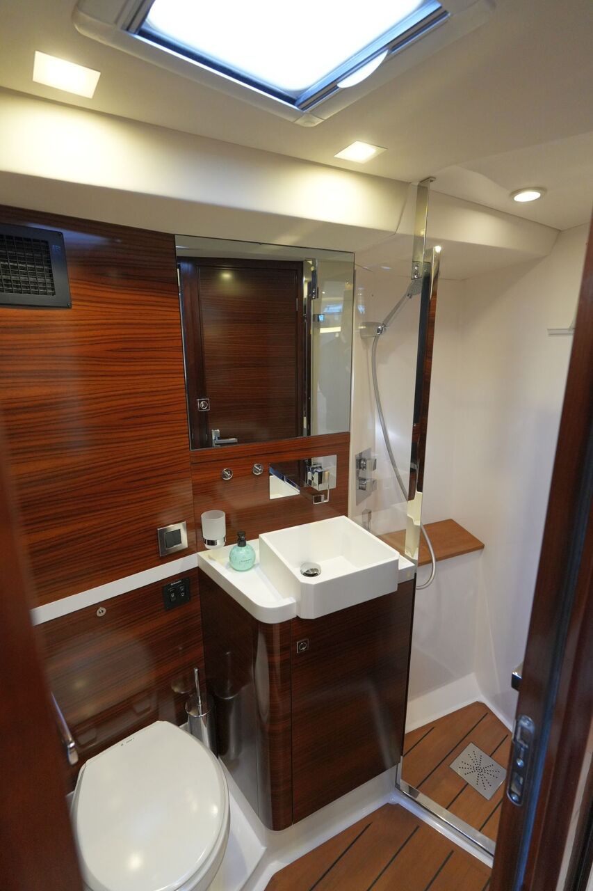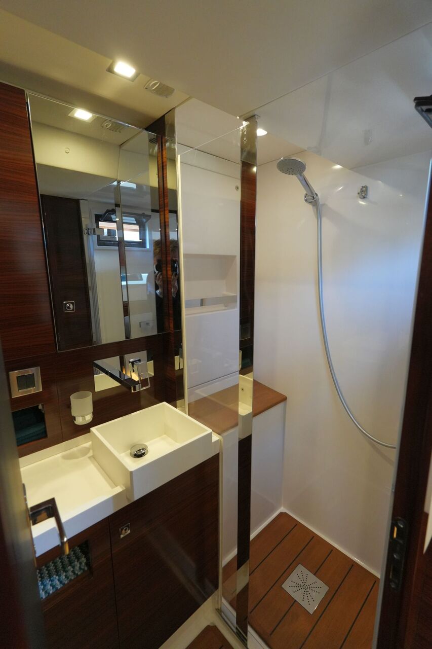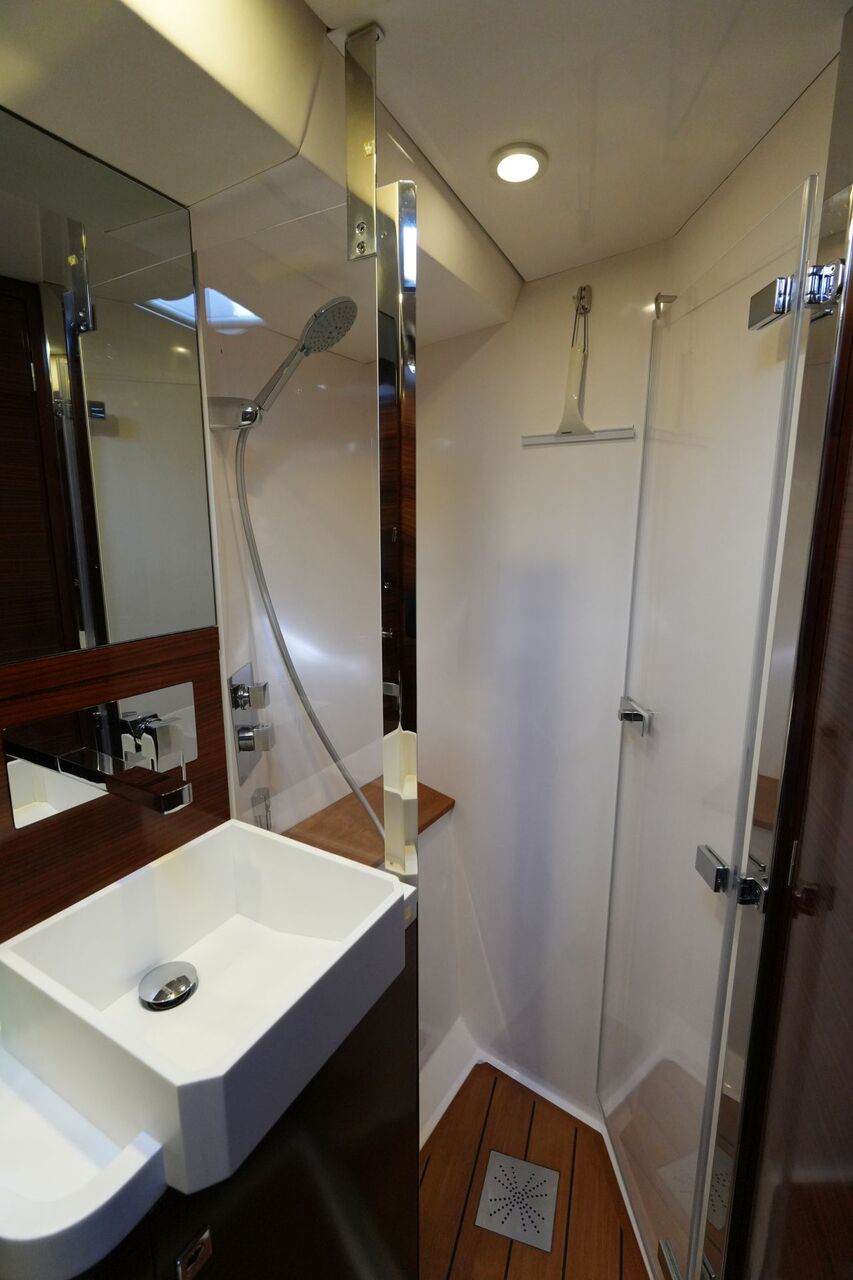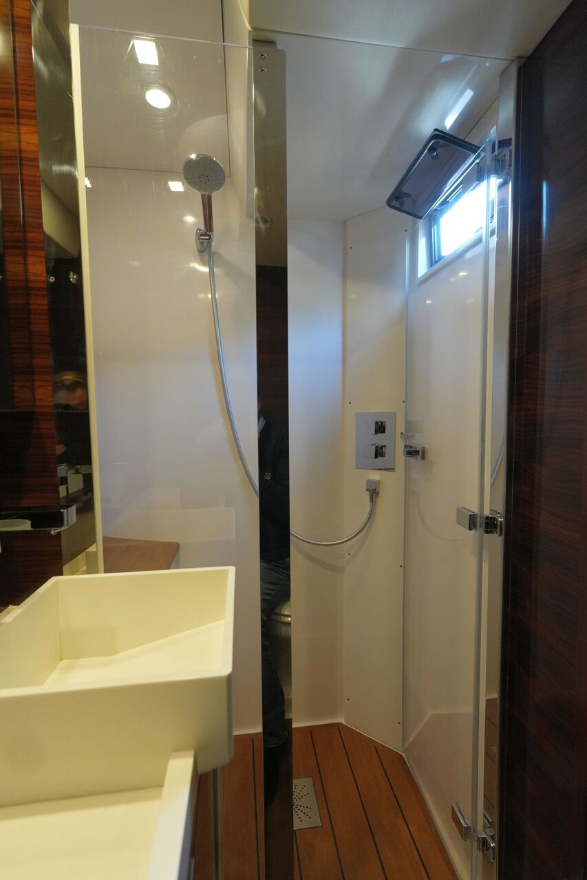 - Eignerbad mit Waschtisch, separater Duschkabine und elektrischer Toilette an Backbord
