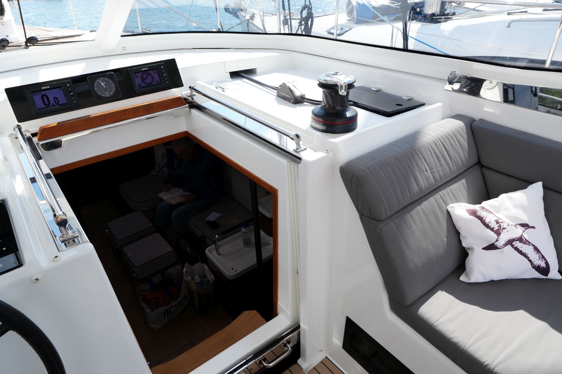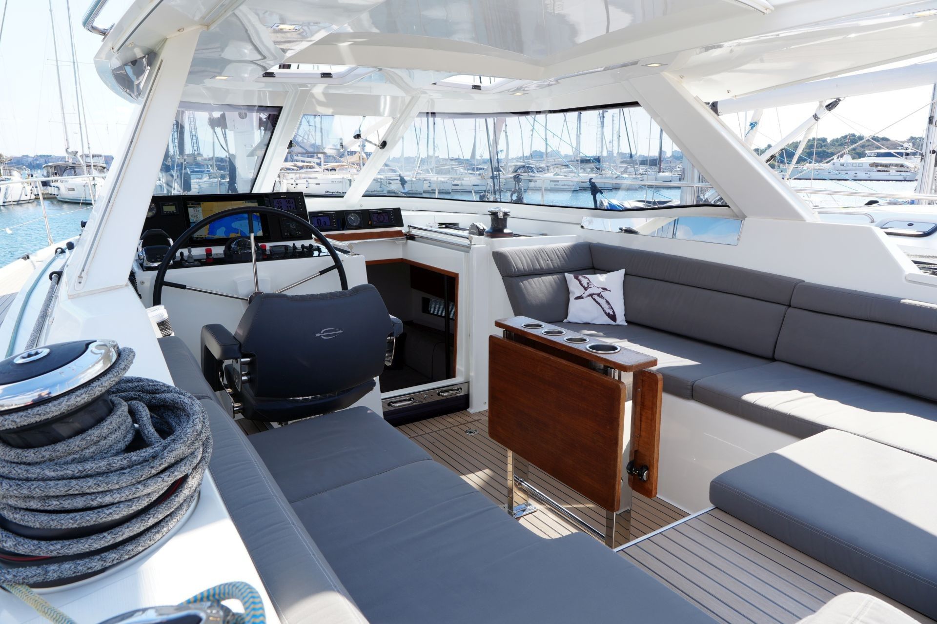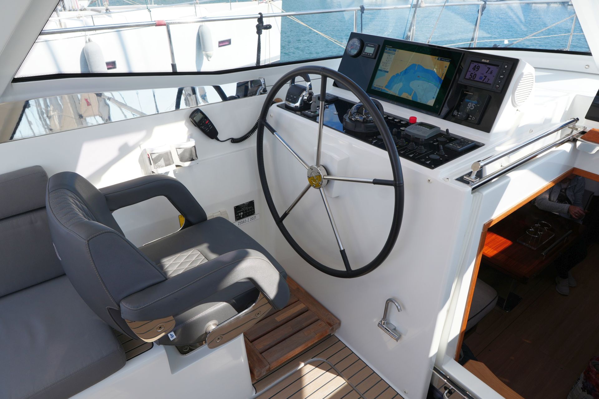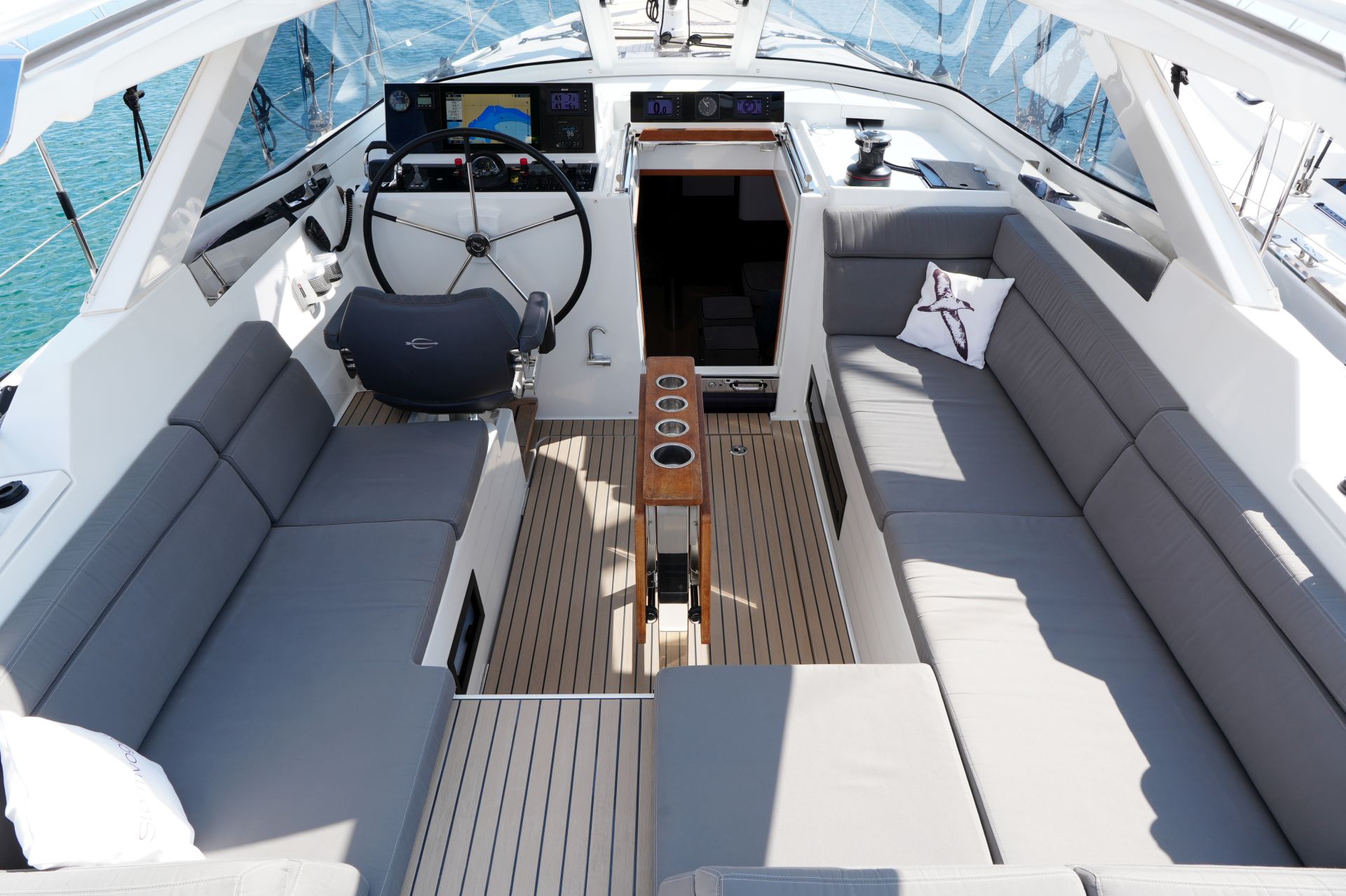 - Tiefes gut geschütztes Cockpit mit Steuerstand und Steuersitz an Backbord