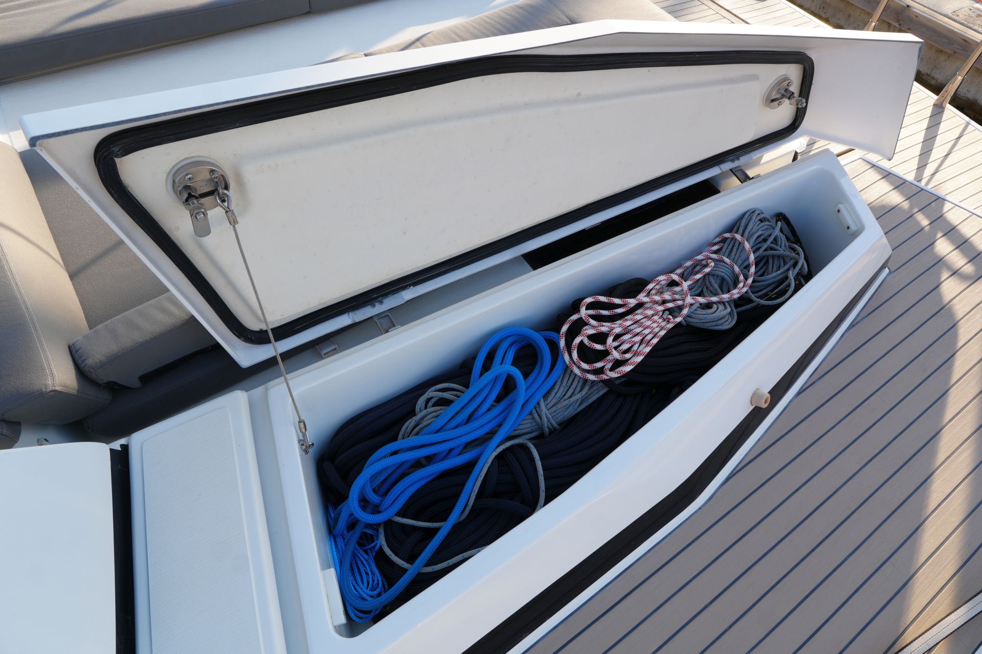 - Große Backskiste unter dem Achterdeck mit reichlich Stauraum und Halterung für Außenborder