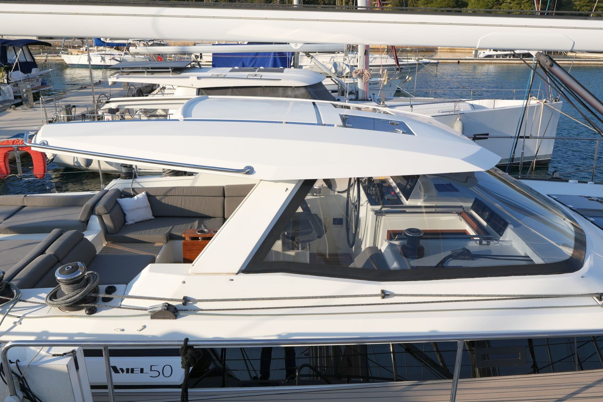 Blauwasser-Cruiser aus dem Jahr 2017Luxuriöser, seegängiger und für Langfahrt ausgestatteter Blauwasser-Cruiser aus Frankreich. Ihr ausgereiftes Konzept, der hohe Standard des Bootsbaus der Werft und die Fokussierung auf Sicherheit, Zuverlässigkeit und Komfort machen AMEL-Segelyachten seit Jahrzehnten zu erstklassigen Fahrtenyachten für lange Strecken und man trifft sie auf den entlegensten Revieren der Welt. Sehr steife, verwindungsfreie Bauweise mit anlaminierten Schotten unter Verwendung von Vinylester-Harzen. Tiefes, gut geschütztes Cockpit mit festem Doghouse über dem Steuerstand. Helles modernes Interieur und viel Licht und Luft unter Deck durch zahlreiche, große Rumpf- und Aufbaufenster, acht Decksluken und sieben Bullaugen. Die AMEL 50 wurde zur "European Yacht of the Year 2018" gewählt.