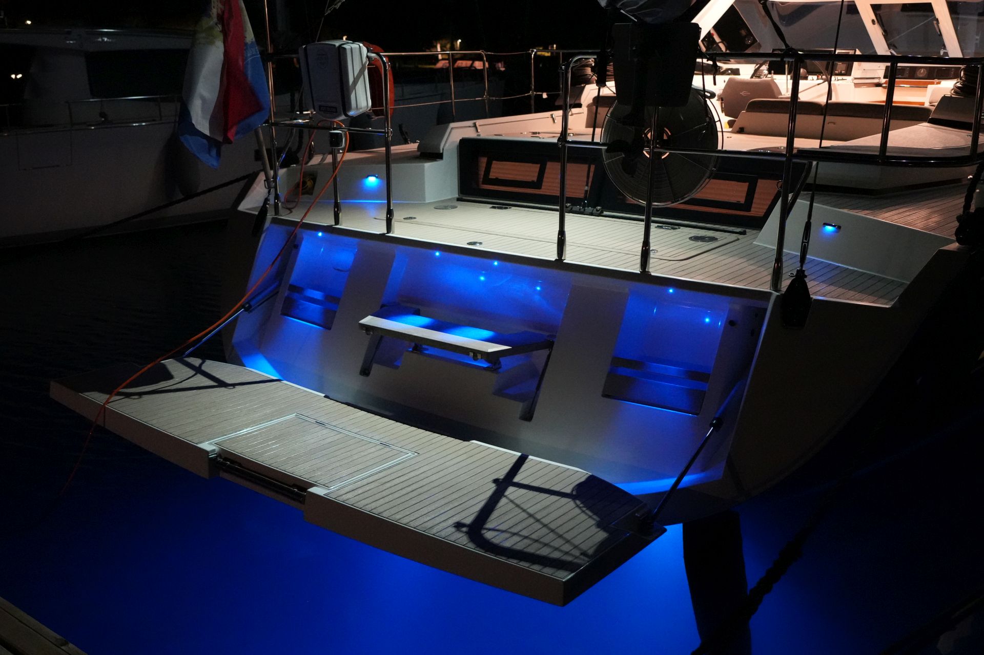 - Blaue Unterwasserscheinwerfer am Heck