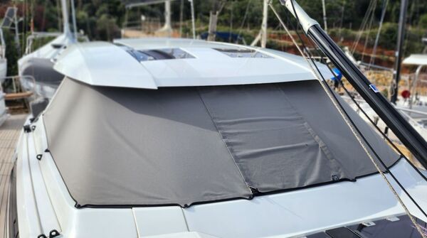 - Doghouse mit Windschutzscheibe (zentrale Scheibe zum Öffnen), zwei Luken im Dach, Deckenbeleuchtung und achtern ausziehbarem GFK-Bimini