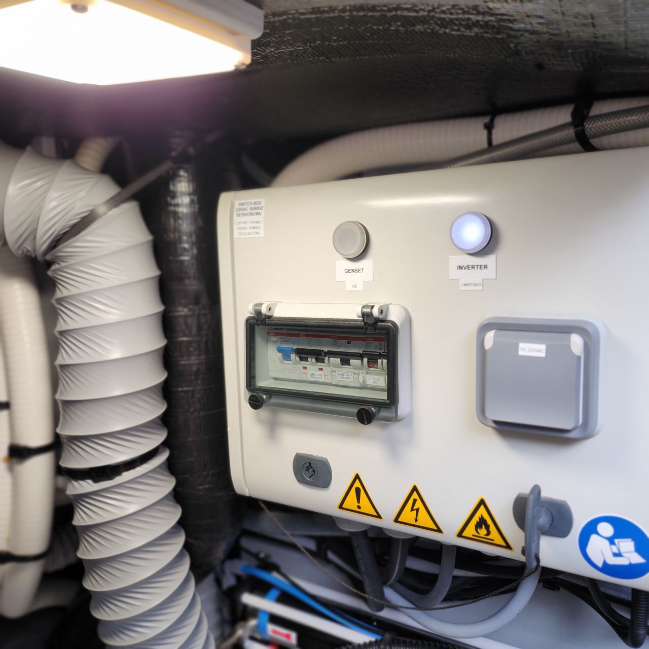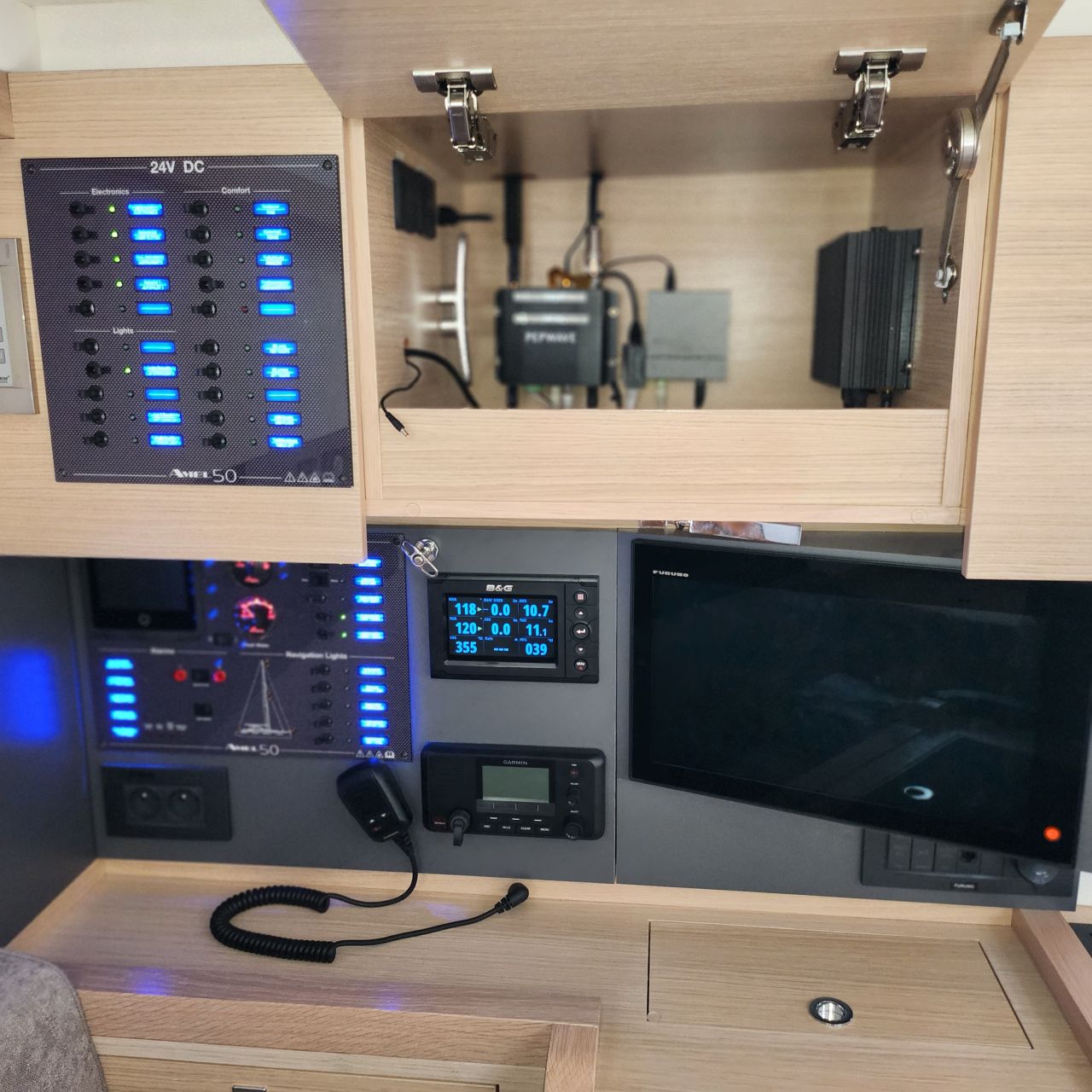 - 230 V und 12 V/USB Steckdosen im Schiff