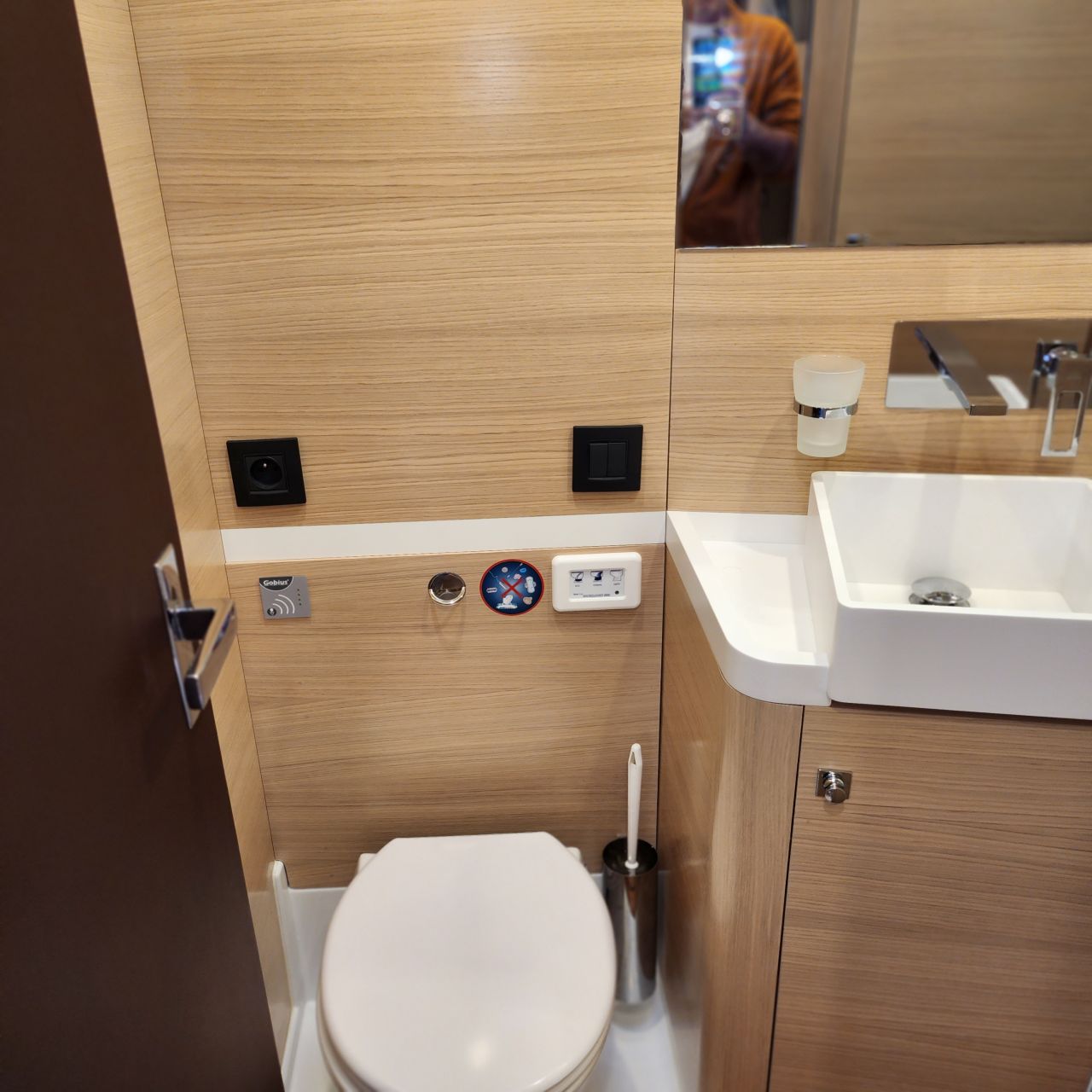 - Nasszelle mit separater Duschkabine und elektrischer Toilette an Backbord