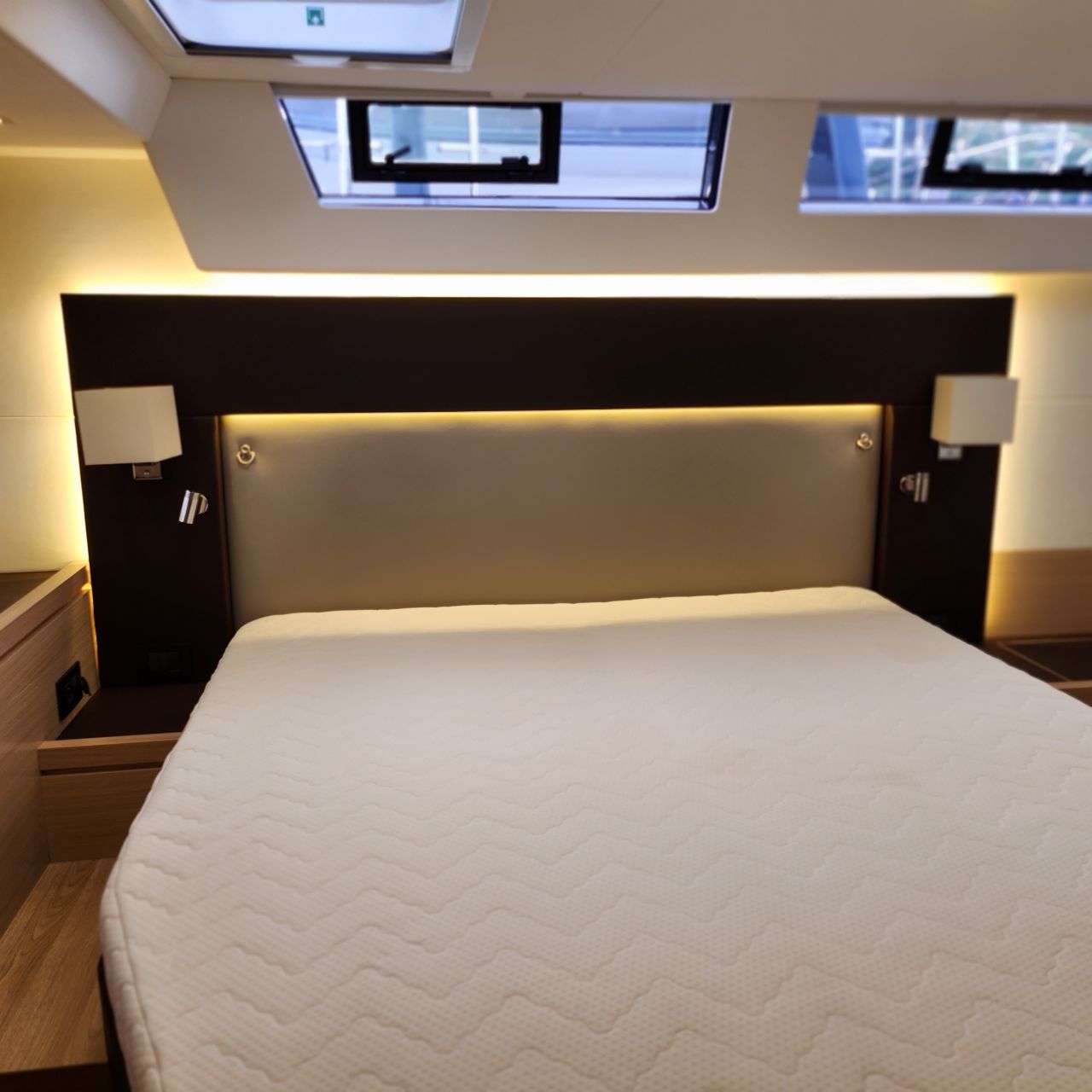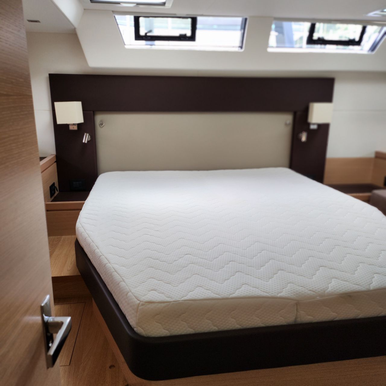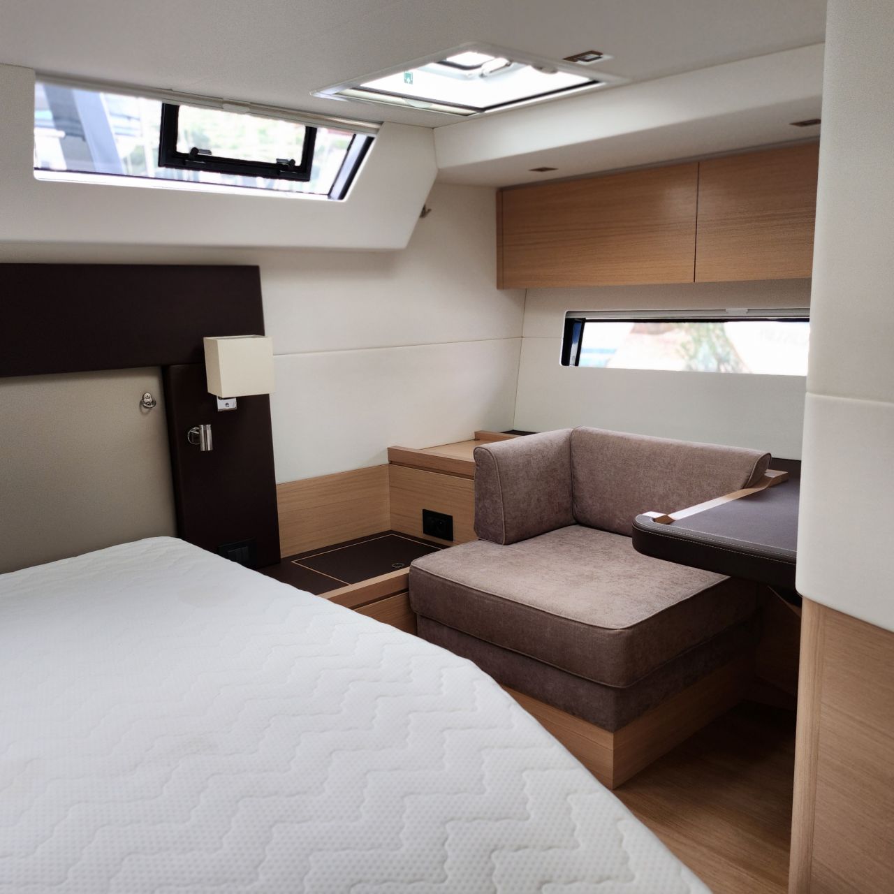 - Elektrischer Induktionsherd (3 Flammen und Backofen) - Luxuriöse, geräumige Eignerkabine im Heck mit breiter, freistehender Doppelkoje, Sessel und Schminktisch, Safe, reichlich Stauraum in Schränken, Fächern, Regalen und unter der Koje, die mit Gasdruckfedern hochgeklappt werden kann.